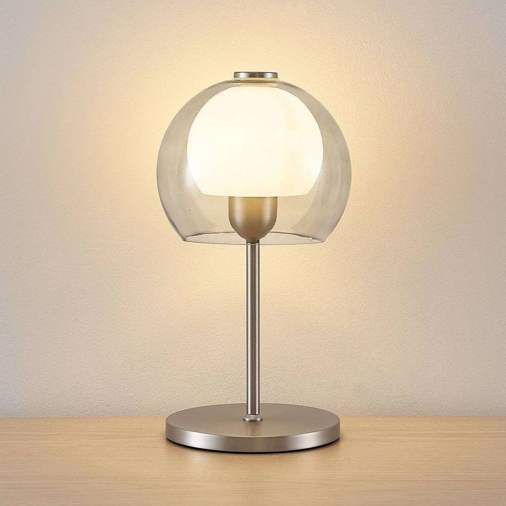 Die Kaiya Tischleuchte Nickel passt problemlos in jeden Raum, in ein Privathaus genauso wie in ein Café, ein Hotel oder sogar ein Büro. Das Design der Leuchte ist ein klassisches Beispiel dafür, wie Schlichtheit und Eleganz Hand in Hand gehen können und wie edles Glas und massives Metall wunderbar kombiniert werden können. Das Stativ aus gebürstetem Nickel trägt zu einem klaren und exklusiven Look bei, während der voluminöse, runde Schirm aus Glas den Look vervollständigt. Der Lampenschirm ist zweigeteilt, so dass der äußere Teil transparent ist und den Blick auf den inneren Lampenschirm freigibt, der aus Opalglas besteht, so dass das Licht beim Einschalten der Lampe weich, gleichmäßig und gleichförmig erscheint.