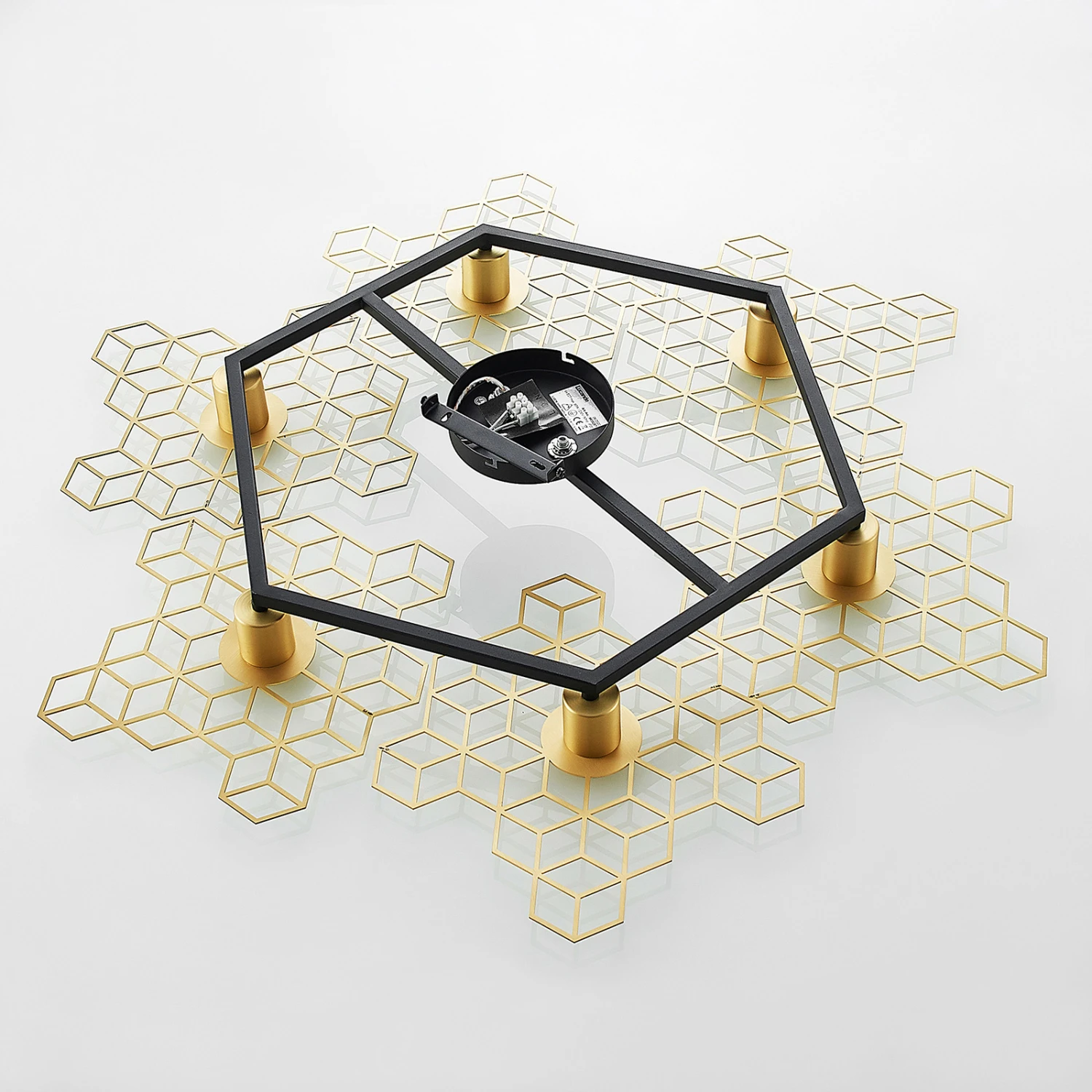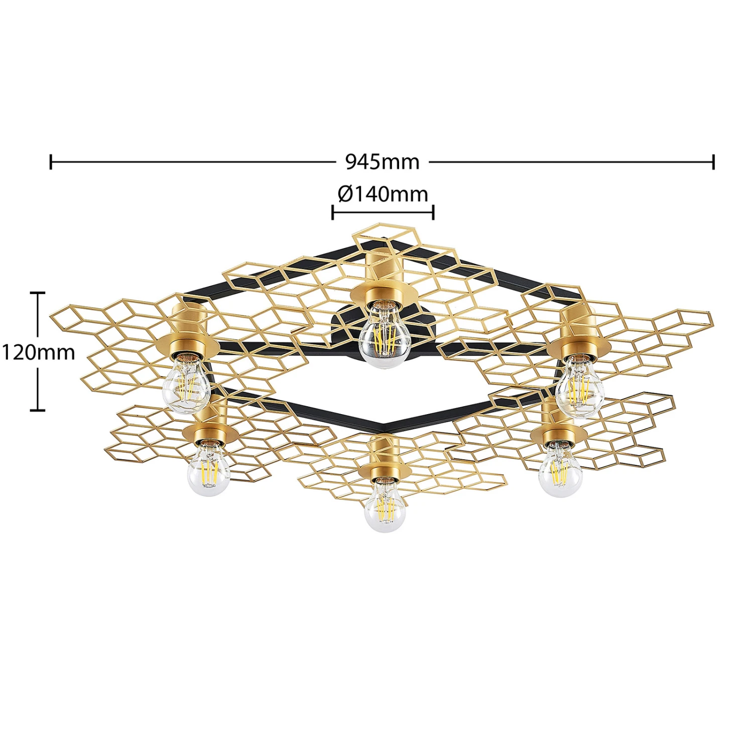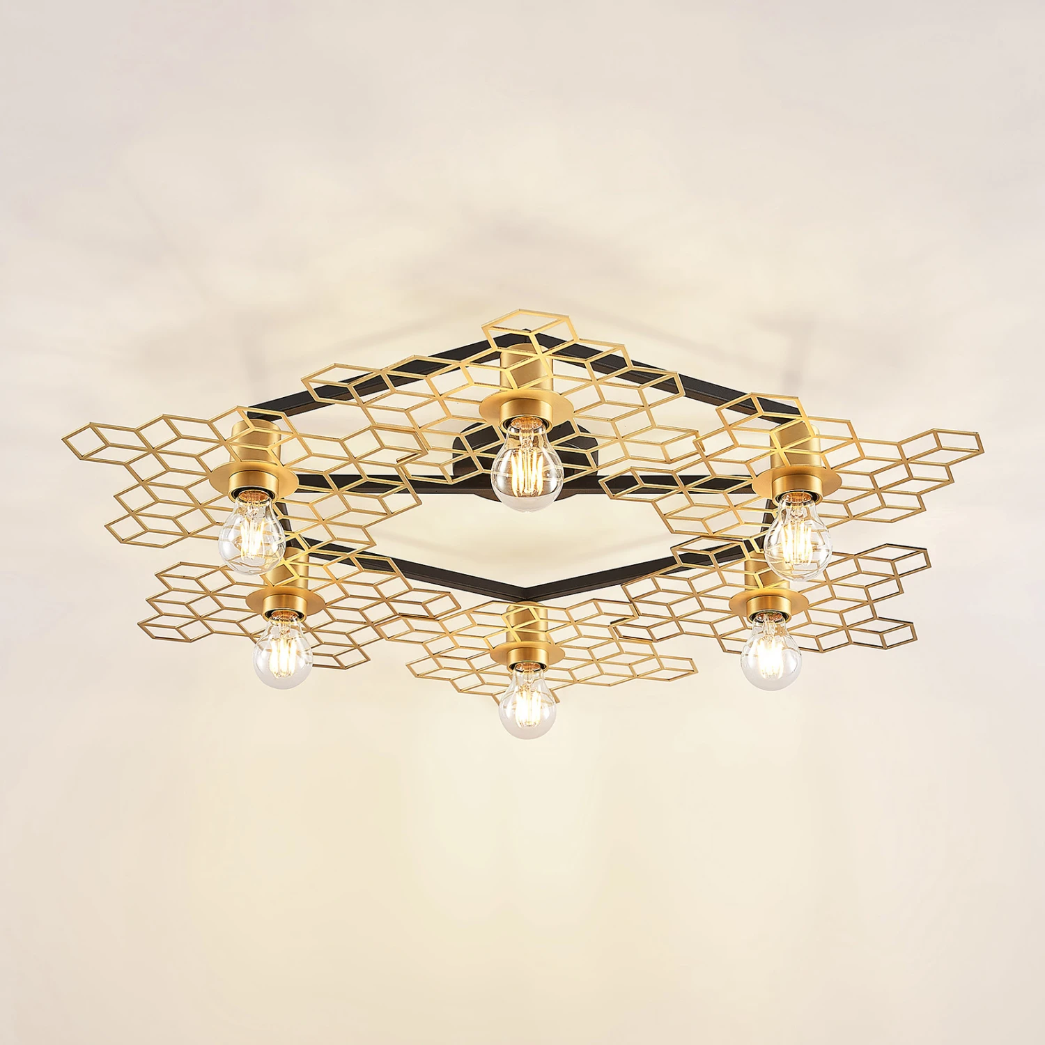Große Design-Deckenlampe Alexaru in Wabenoptik, goldfarbenes Finish, sechsflammig – Midcentury meets Loft