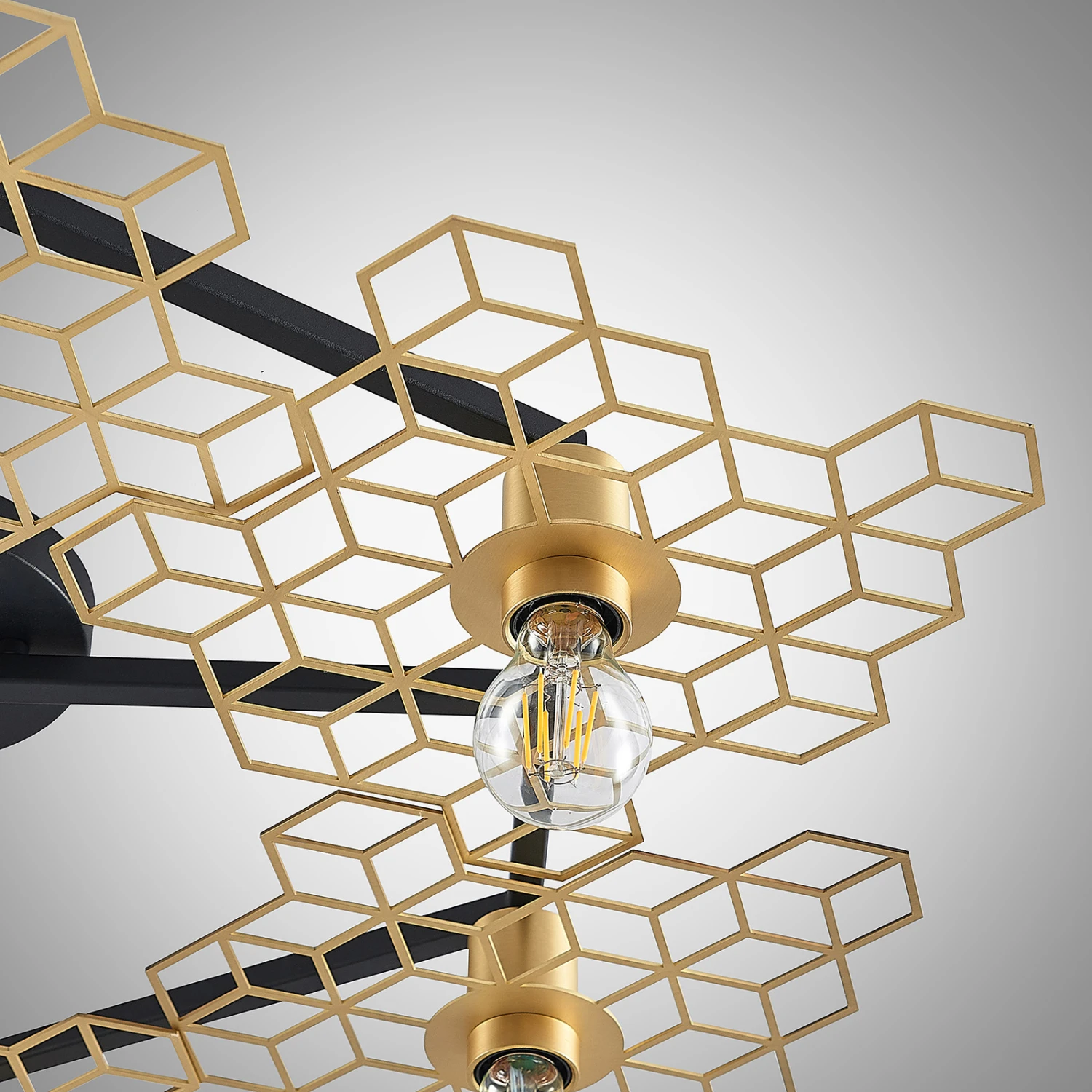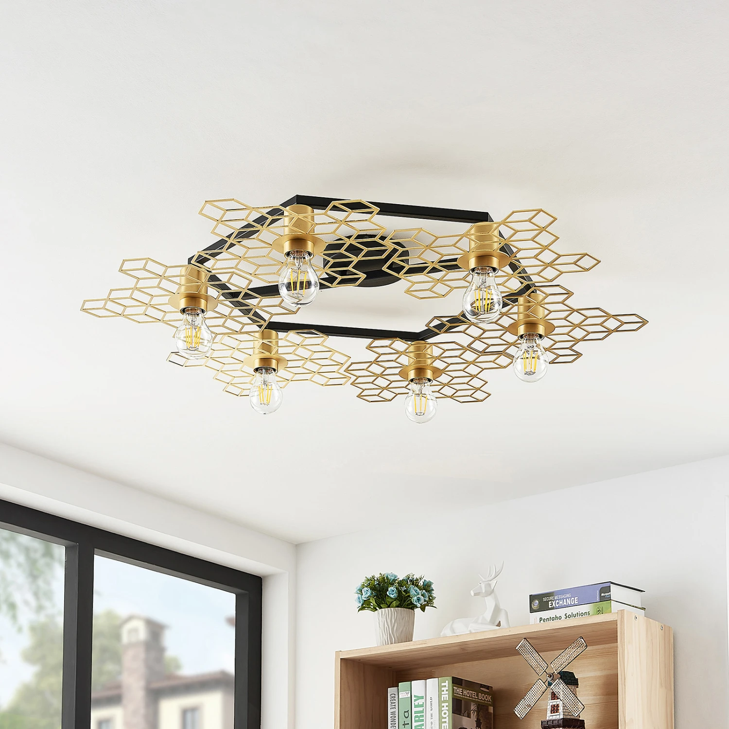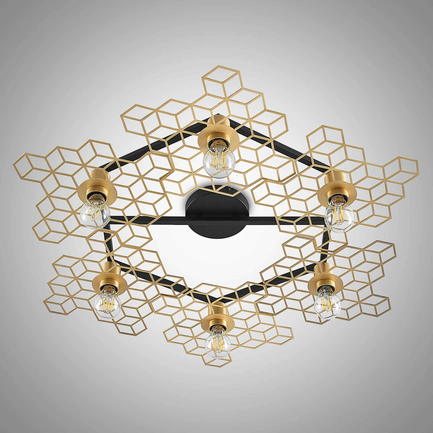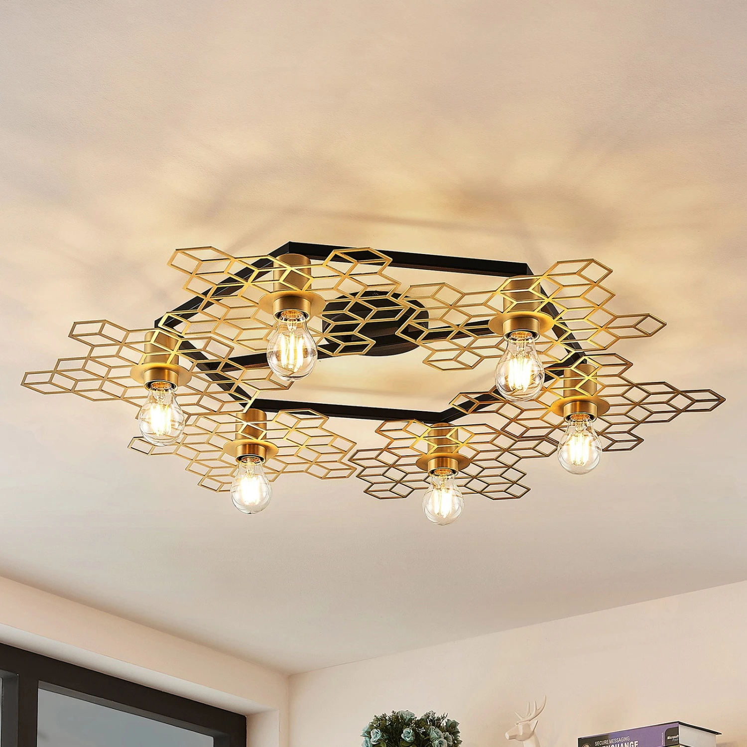 Große Design-Deckenlampe Alexaru in Wabenoptik, goldfarbenes Finish, sechsflammig – Midcentury meets Loft