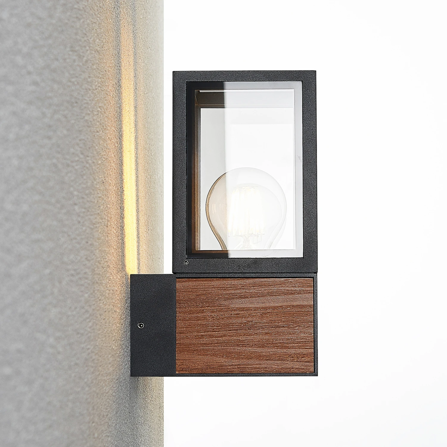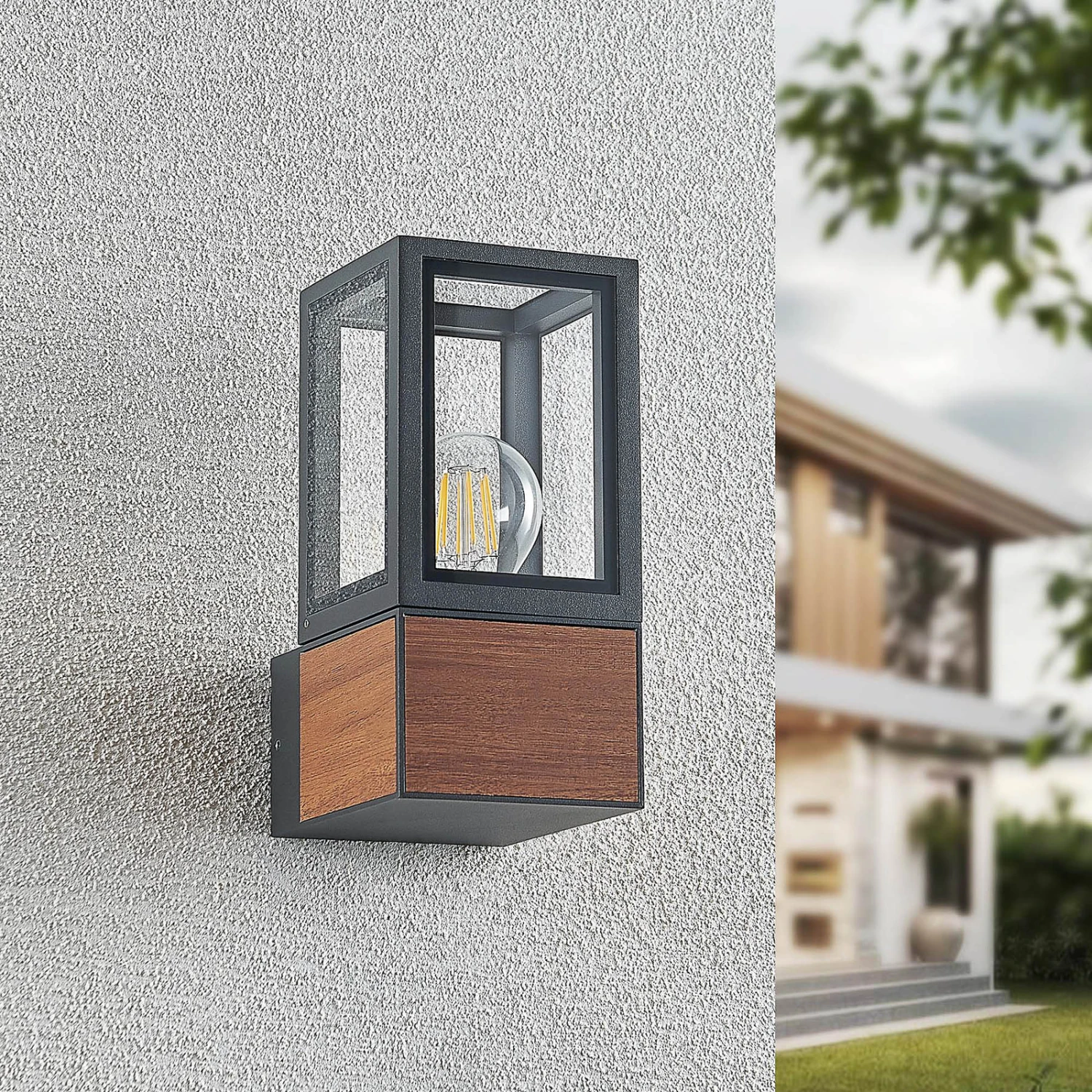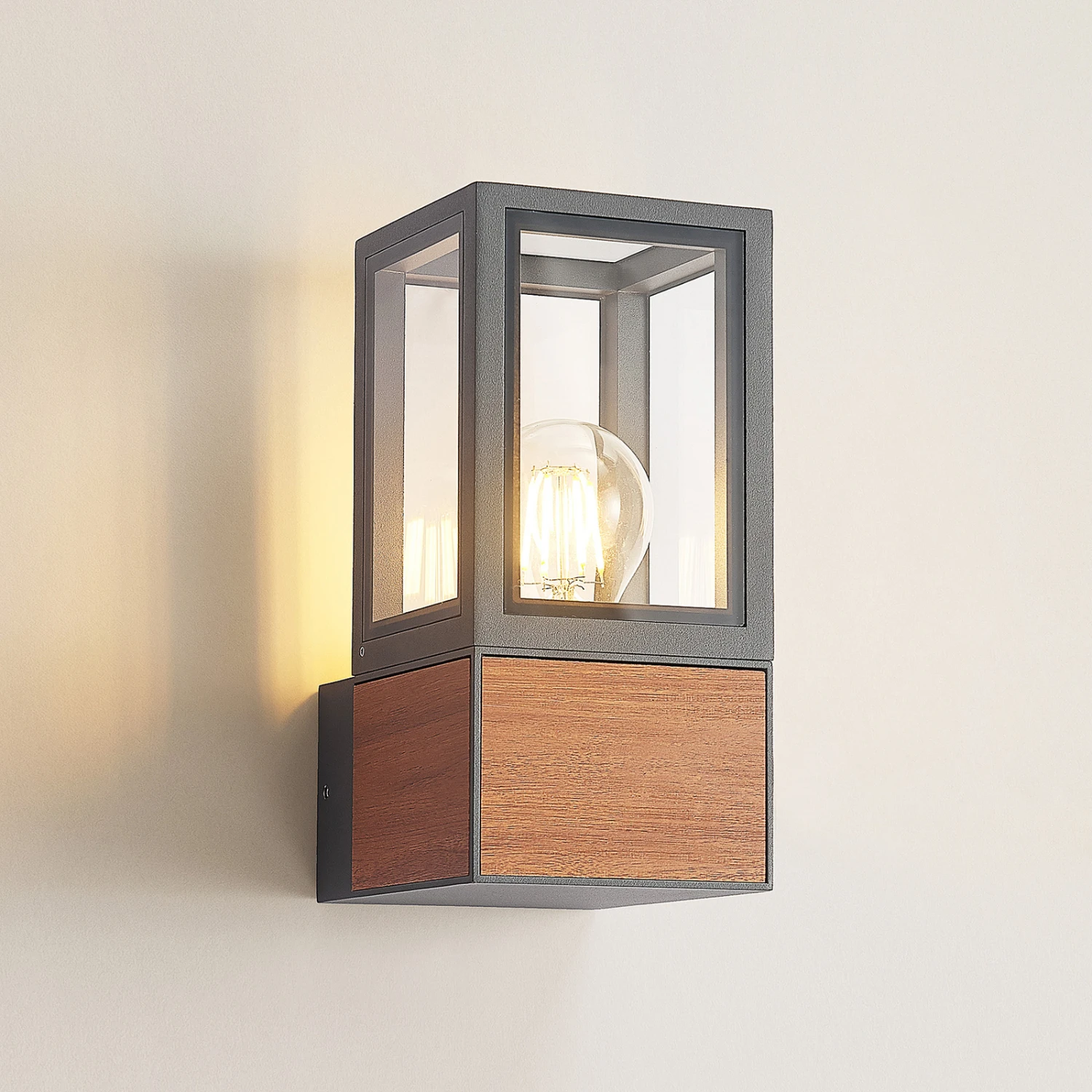 Eckige Außenwandlampe Alleria mit Klarglas und Dekor in Holzoptik