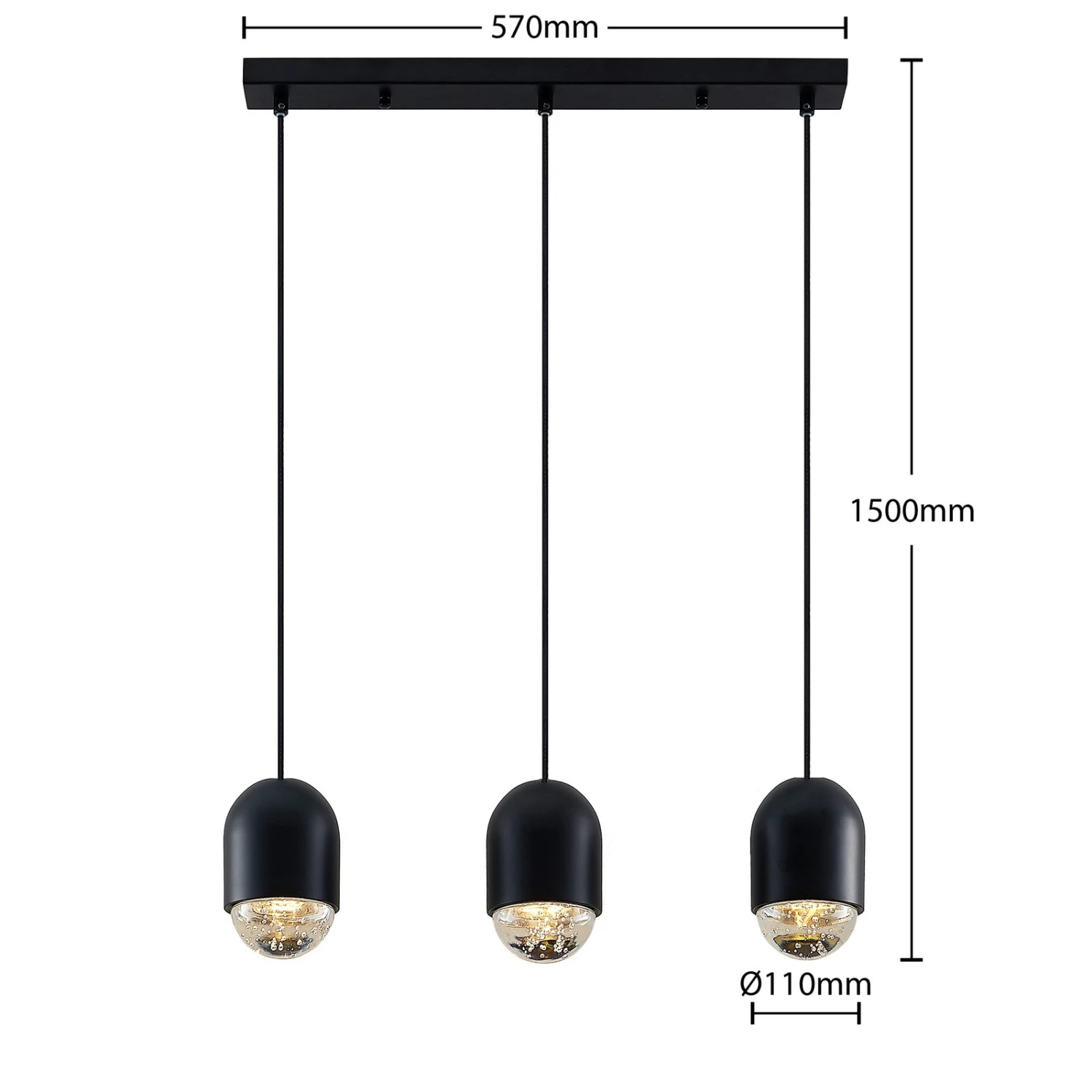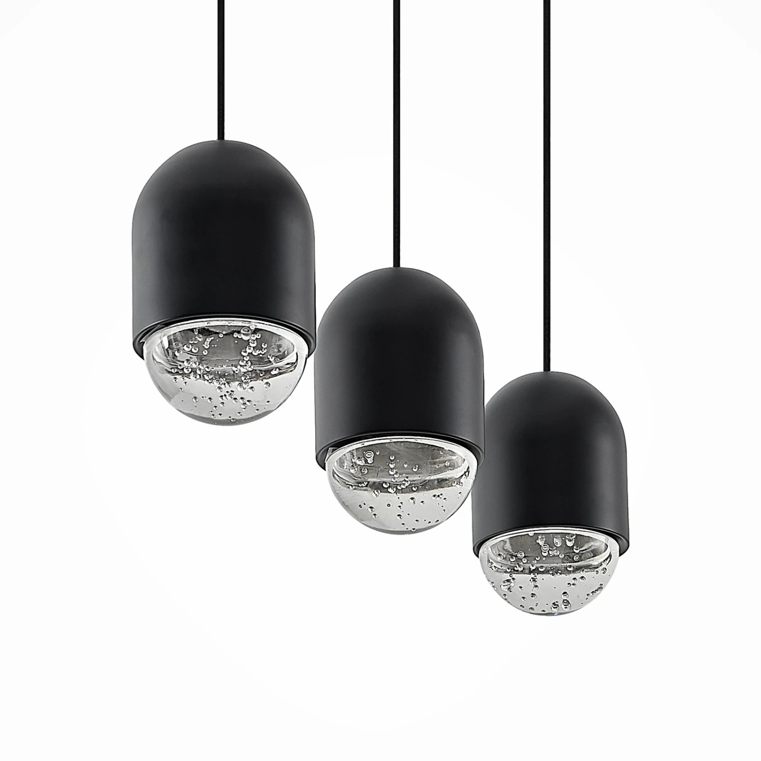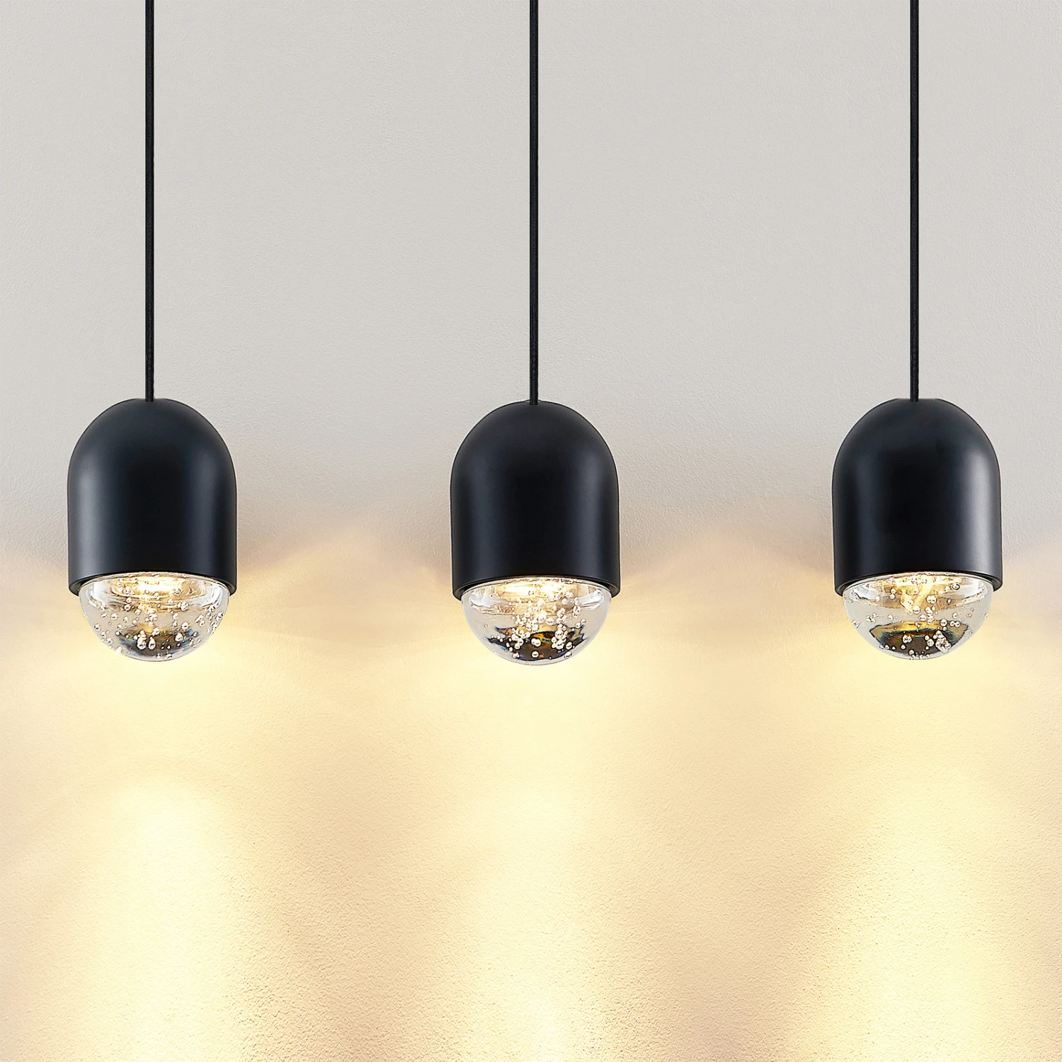 Bei Amielle handelt es sich um eine Pendellampe mit besonders moderner Ausstrahlung. Die drei Schirme sind nahezu elliptisch geformt und im oberen Teil aus schwarzem Metall gefertigt, während sie unten mit einem Element aus Glas mit Blasenstruktur im Inneren abschließen. Das bewirkt nicht nur eine tolle, sehr zeitgemäße Optik mit puristischer Wirkung, sondern darüber hinaus auch eine einzigartige Lichtwirkung, die von einem gewissen Funkeln begleitet wird. Die längliche Balkenform mit den drei herabhängenden Schirmen in Schwarz macht Amielle zu einem tollen Lichtpender für den Essbereich, der nicht nur hell, sondern auch stilvoll beleuchtet wird mit dieser eleganten Pendelleuchte.