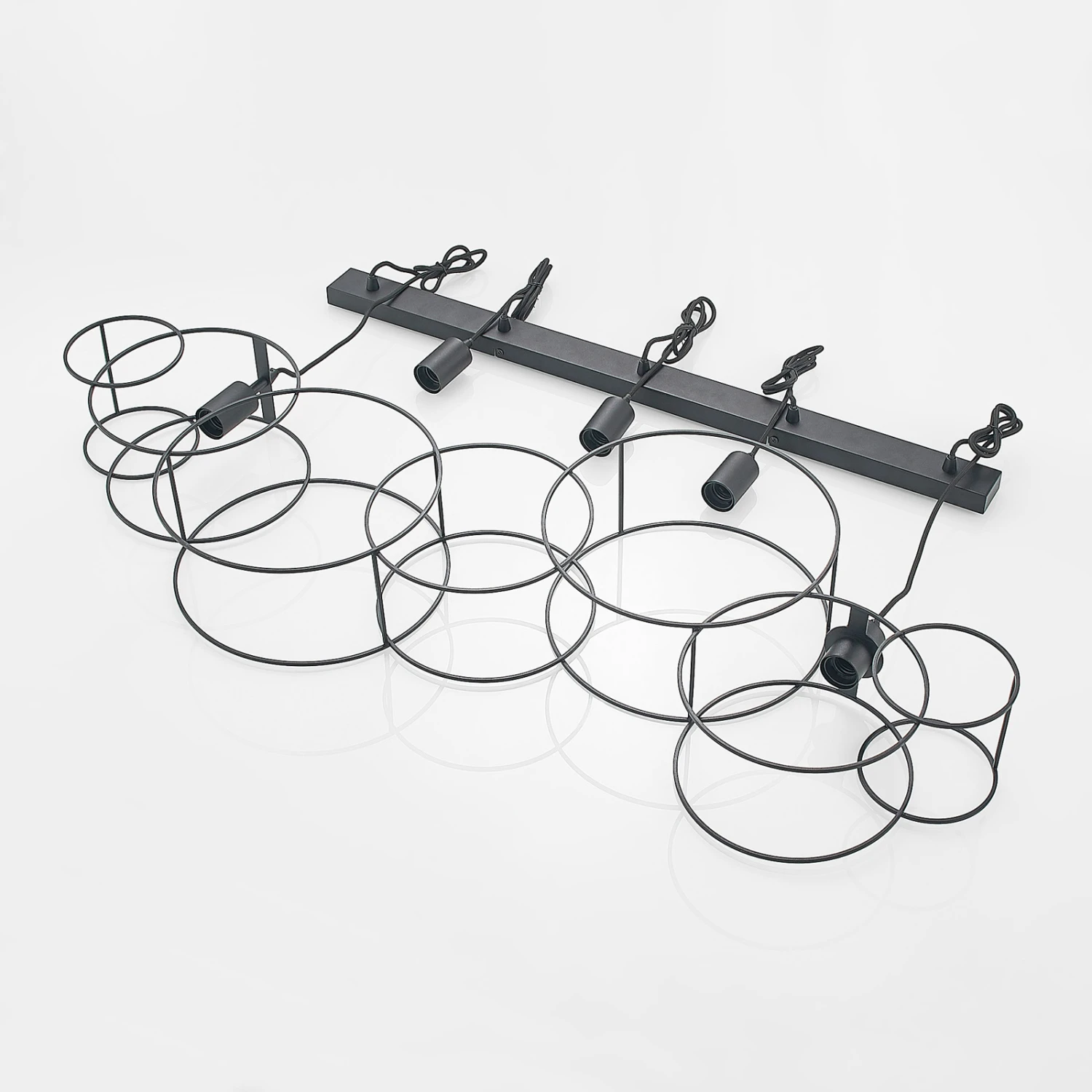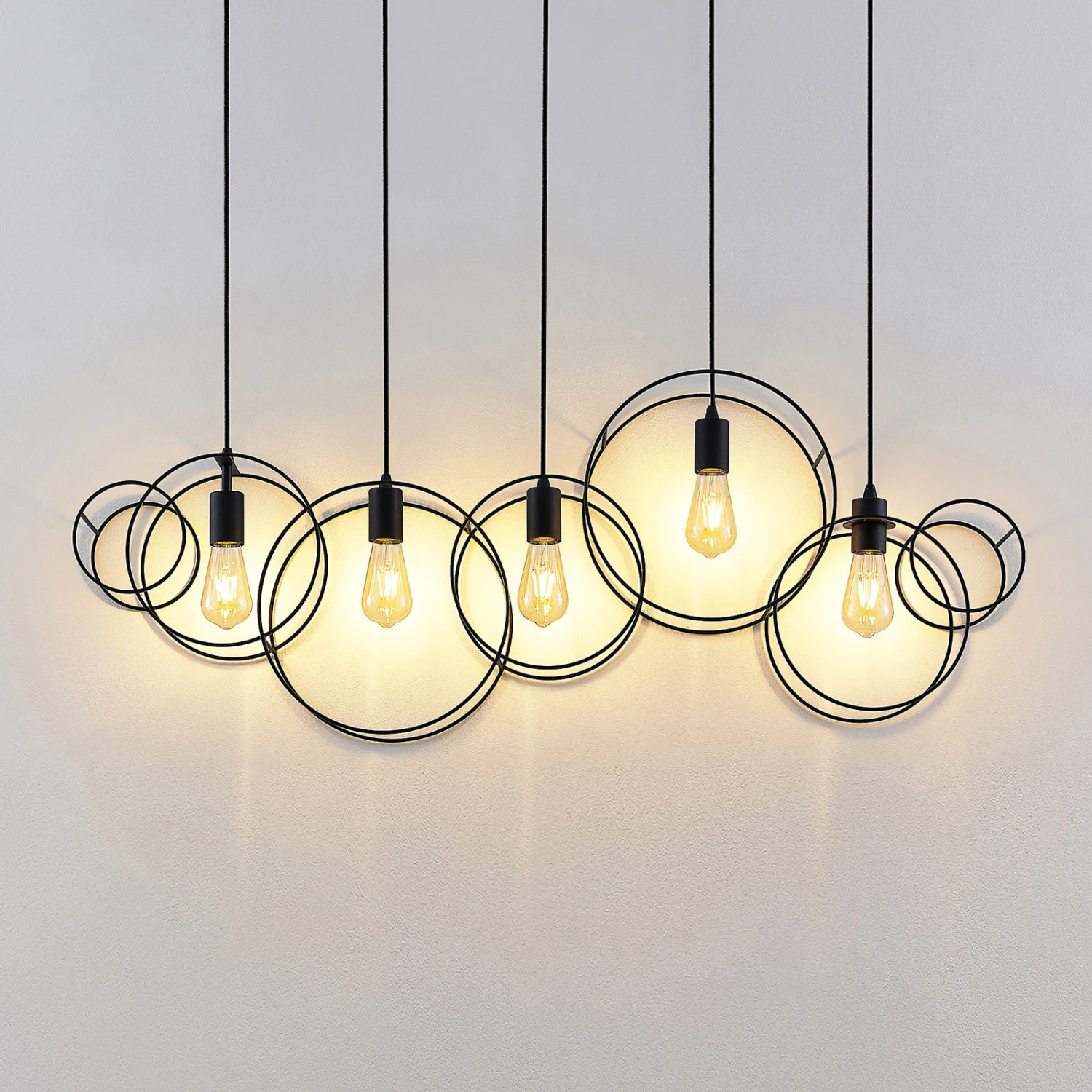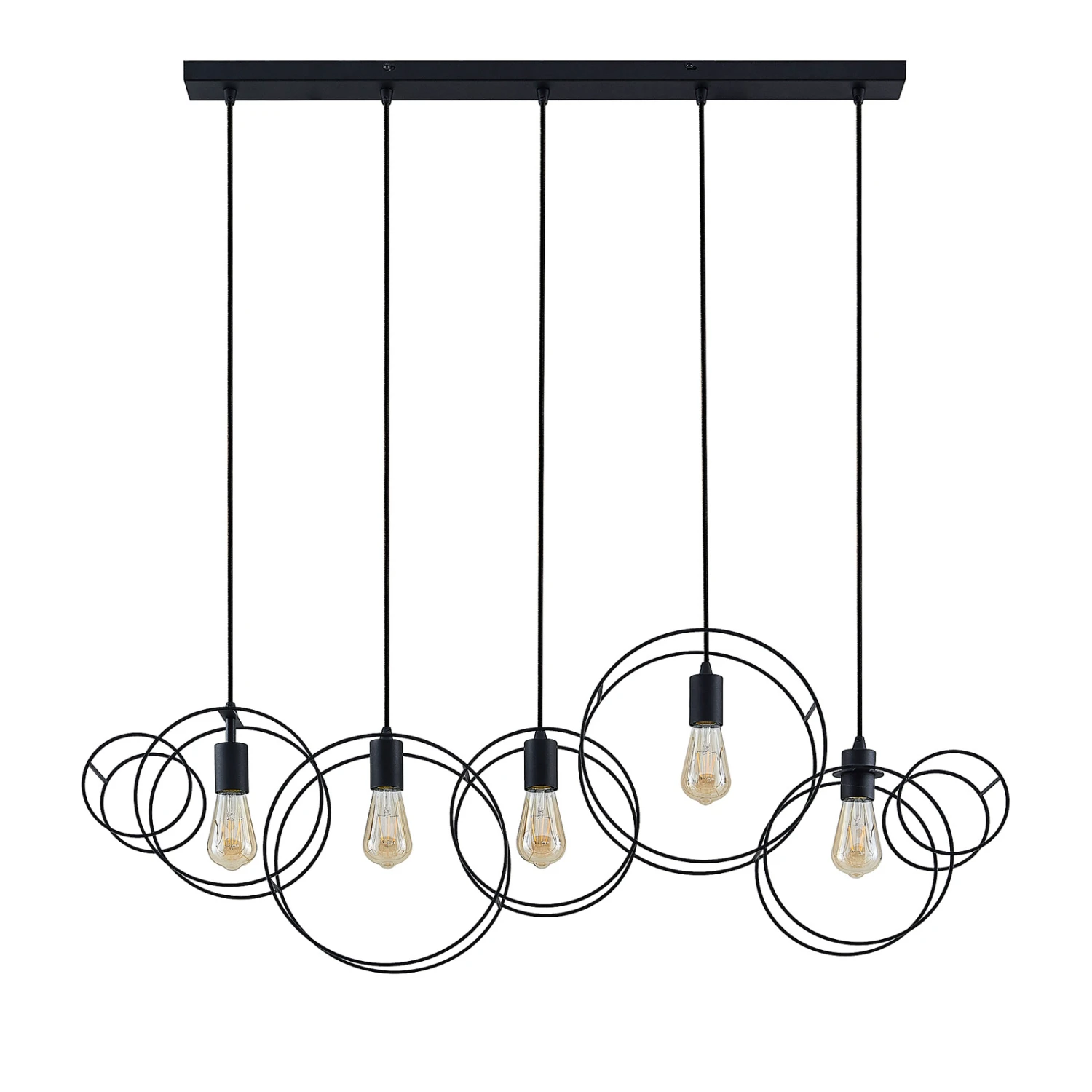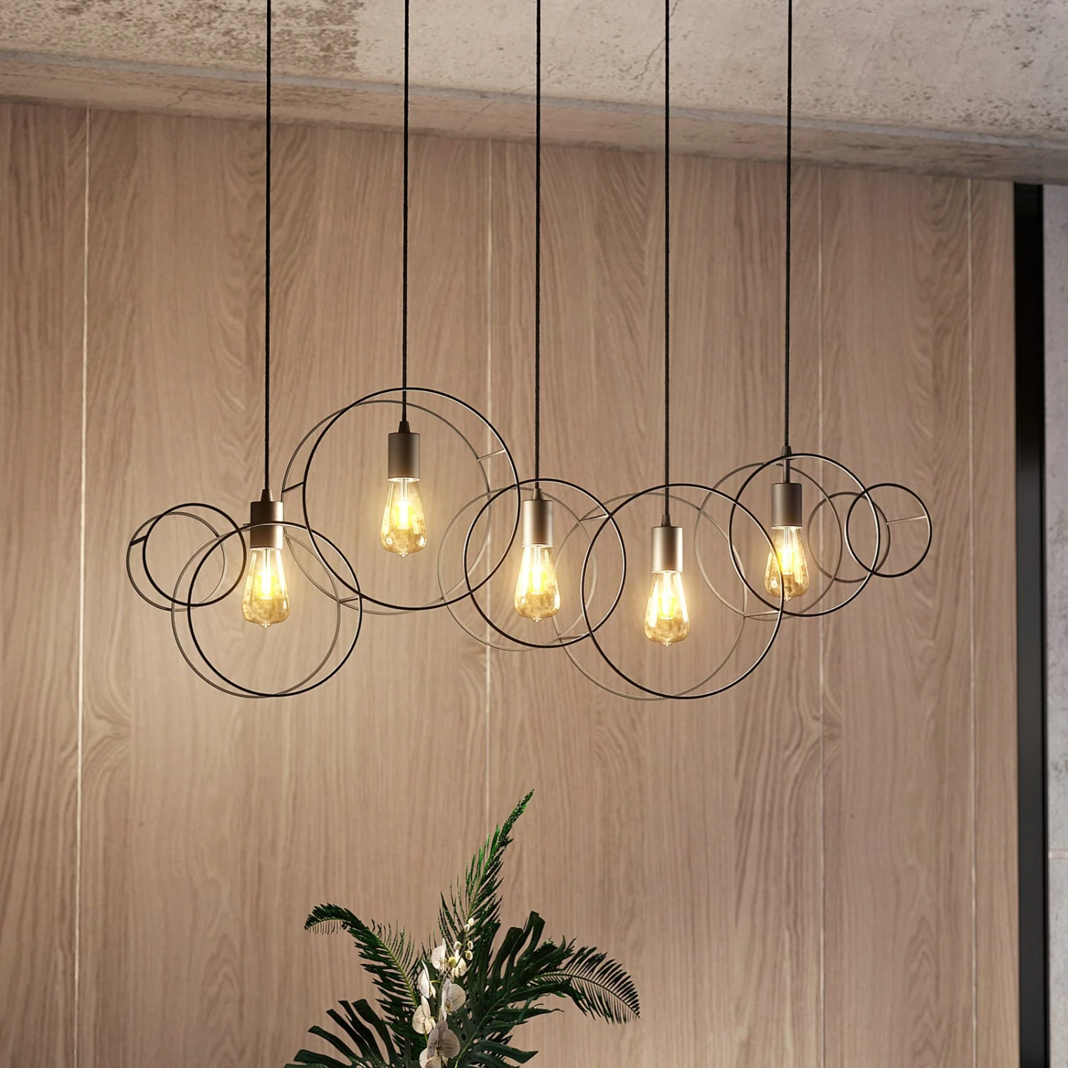 Die Hängelampe Andrik ist mit ihrem auffälligen Aussehen etwas ganz Besonderes. An einer länglichen Deckenhalterung sind in einer Reihe fünf Aufhängungen positioniert. An jedem Ende dieser sitzt ein runder Kreis, welcher aus sandschwarzen Stahlstreben geformt ist. Im Inneren der Kreise sitzt jeweils eine offene Fassung, in die ein E27-Leuchtmittel eingesetzt werden kann. Aufgrund des freien Blickes auf die Lichtquelle empfiehlt es sich, ein Filament-Leuchtmittel einzusetzen, da dieses mit seinem eigenen speziellen Aussehen die besondere Form der Leuchte betont. Die Hängeleuchte Andrik sieht vor allem in größeren Räumen besonders gut aus und setzt mit ihrem markanten Äußeren auffällige Akzente an Decken.