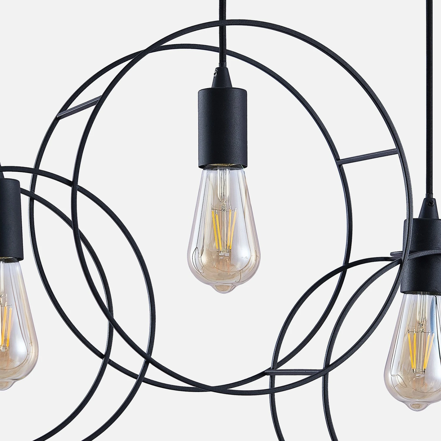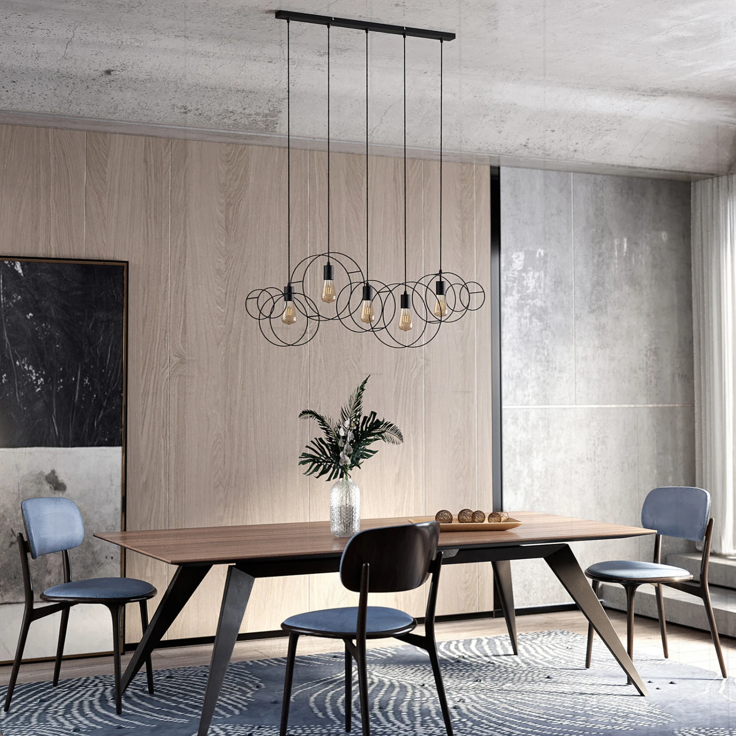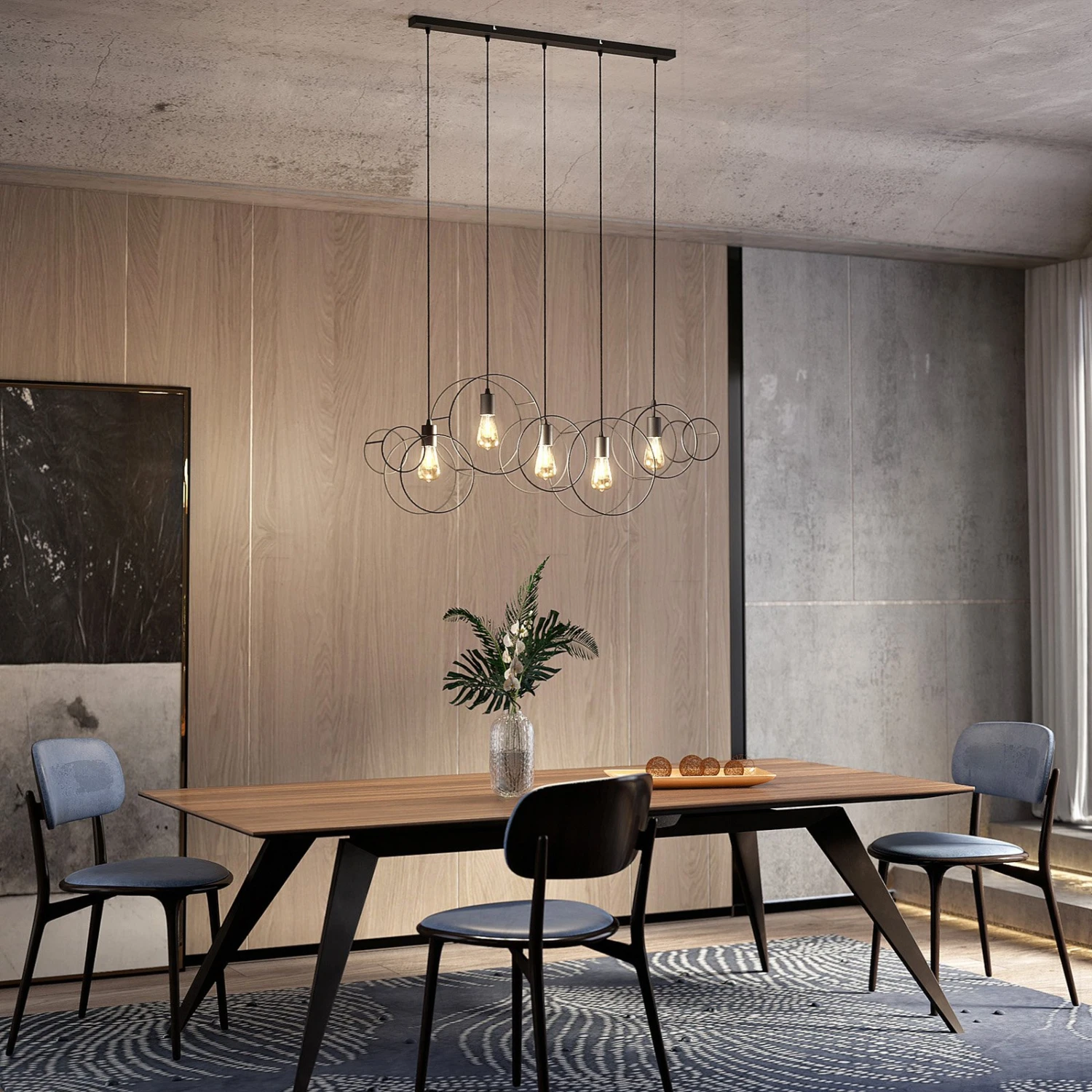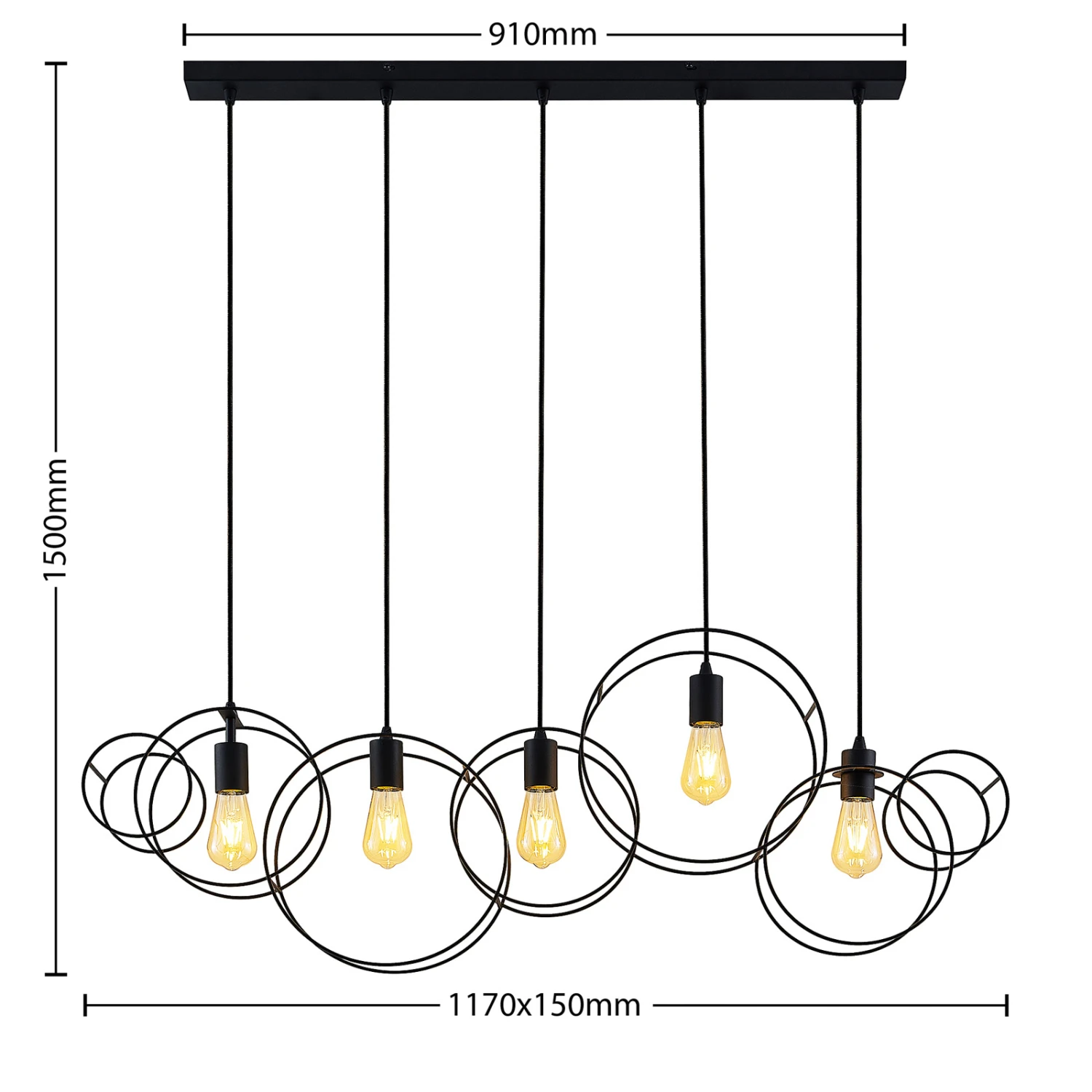 Die Hängelampe Andrik ist mit ihrem auffälligen Aussehen etwas ganz Besonderes. An einer länglichen Deckenhalterung sind in einer Reihe fünf Aufhängungen positioniert. An jedem Ende dieser sitzt ein runder Kreis, welcher aus sandschwarzen Stahlstreben geformt ist. Im Inneren der Kreise sitzt jeweils eine offene Fassung, in die ein E27-Leuchtmittel eingesetzt werden kann. Aufgrund des freien Blickes auf die Lichtquelle empfiehlt es sich, ein Filament-Leuchtmittel einzusetzen, da dieses mit seinem eigenen speziellen Aussehen die besondere Form der Leuchte betont. Die Hängeleuchte Andrik sieht vor allem in größeren Räumen besonders gut aus und setzt mit ihrem markanten Äußeren auffällige Akzente an Decken.