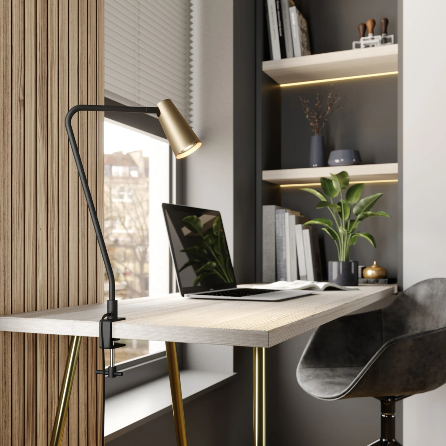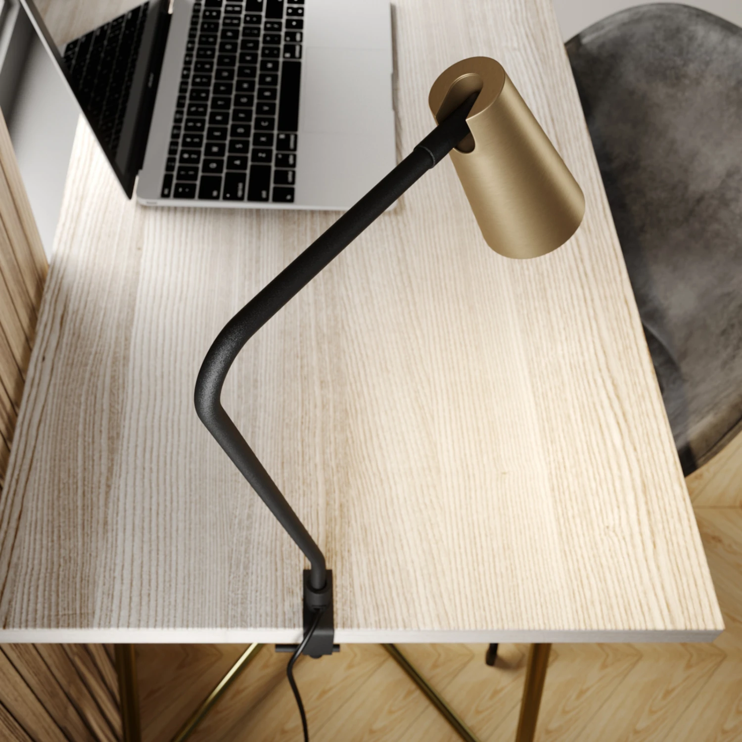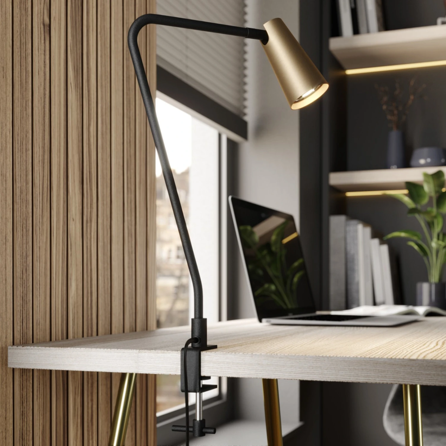 Angelina ist für Tische im heimischen Büro geeignet oder kann auch an anderen Orten im Wohnbereich eingesetzt werden. Über einen Klemmfuß mit Schraubzwinge kann man die Leuchte sicher und fest am jeweiligen Tisch montieren und der Leuchtenschirm lässt sich für eine bessere Ausrichtung ein wenig schwenken. Der Schalter befindet sich in der Steckerzuleitung, so dass man die Klemmleuchte darüber schnell ein- und ausschalten kann. Optisch ein richtiges Highlight ist der Lampenschirmn in Becherform, der nicht etwa schwarz ist wie das Gestell, sondern messingfarben schimmert, was sehr edel aussieht und einen sehenswerten Kontrast hervorruft. Tolle Ergänzung für skandinavische Einrichtungen.