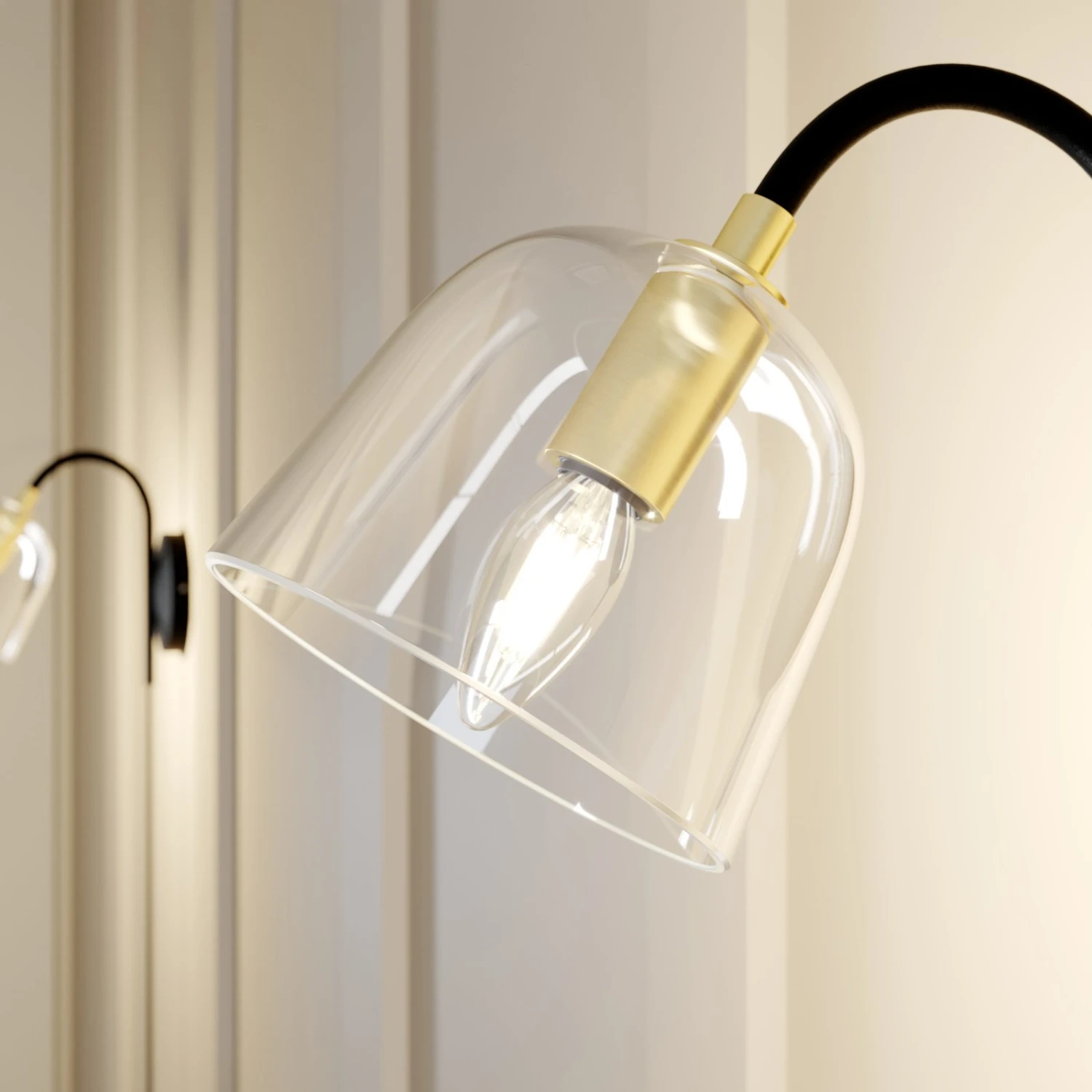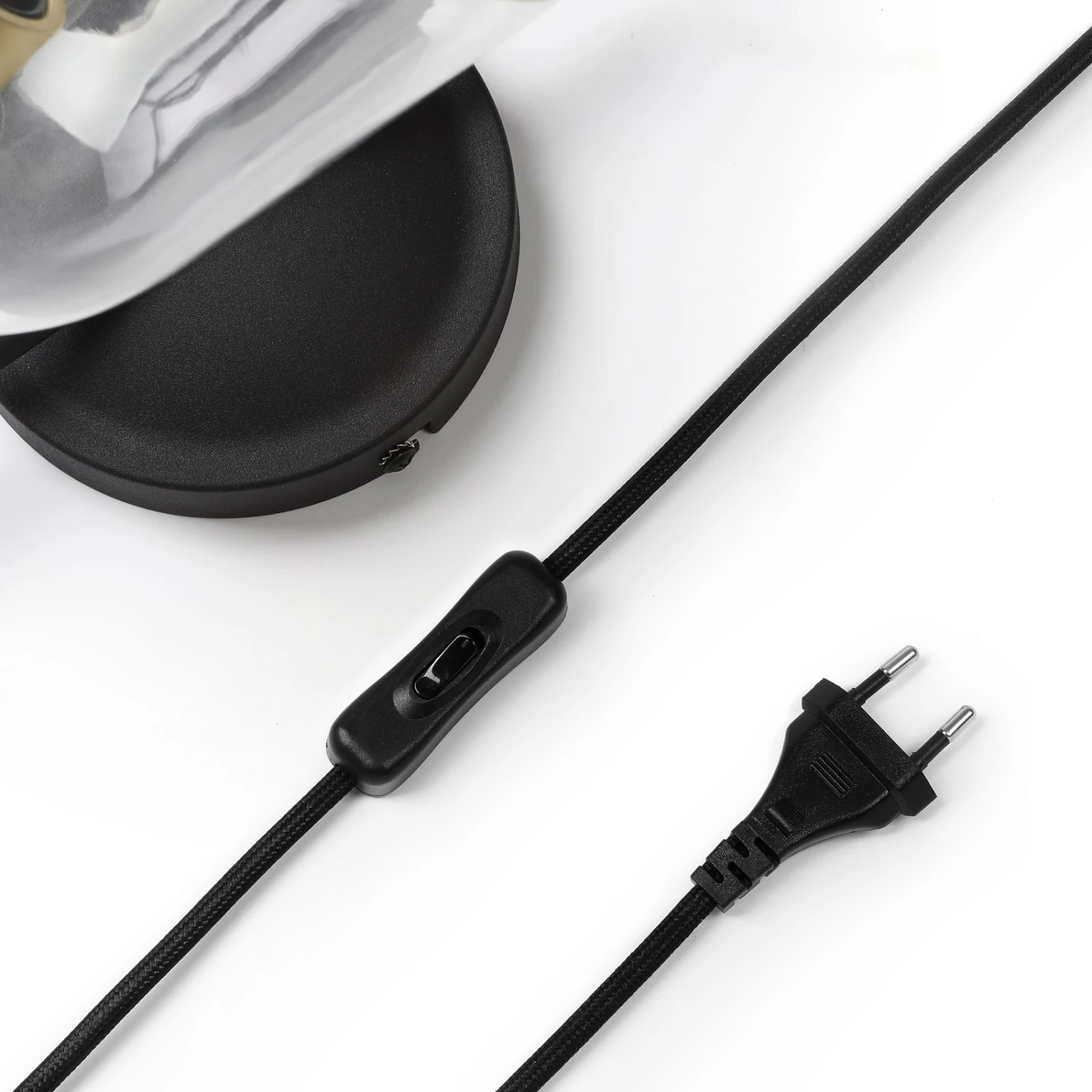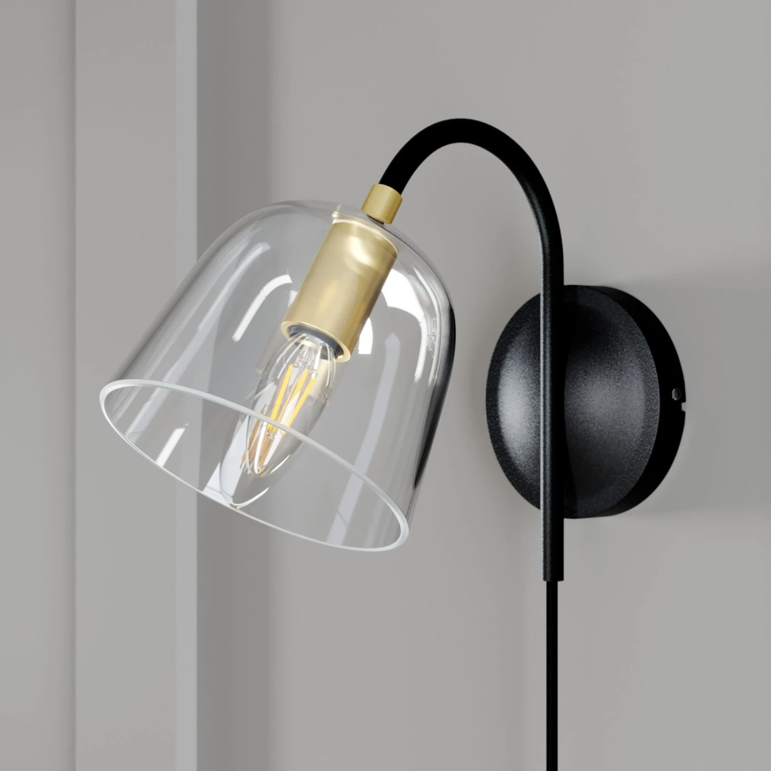 Elegante Design-Wandleuchte Anjita mit Steckerzuleitung und Schalter sowie klarem Glasschirm