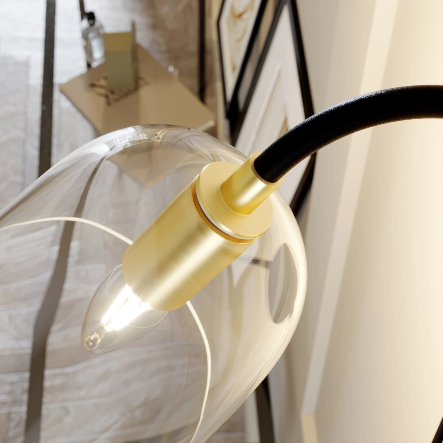 Anjita besitzt eine runde, schwarze Wandhalterung sowie ein gebogenenes Gestell, das zum Lampenschirm führt. Dieser besteht vollständig aus edlem Klarglas und weist eine ansprechende Form auf. Zudem kann man die Lampenfassung in Messing auf diese Weise gut erkennen und es ergibt sich ein äußerst sehenswerter Drei-Komponenten-Look, der den Vintagestil dieser Wandleuchte hervorragend unterstreicht. Die designorientierte Leuchtenserie besitzt den Charme der vorletzten Jahrhundertwende, der sich hier mit moderner Klarheit kombiniert zeigt. Die Wandleuchte mit einer klassischen Linienführung und ausgewogenen Proportionen passt zu vielen Wohnstilen und überzeugt stets mit einer besonderen Eleganz. Über eine Steckerzuleitung mit integriertem Schalter wird die Wandleuchte schnell und bequem mit dem Stromnetz verbunden und LED-Filamentlampen mit stilvollem Glühlampenlook eignen sich hier dank des klaren Leuchtenglases besonders gut als optisch passende Leuchtmittel, zumal sie in der Regel effizient und langlebig sind.