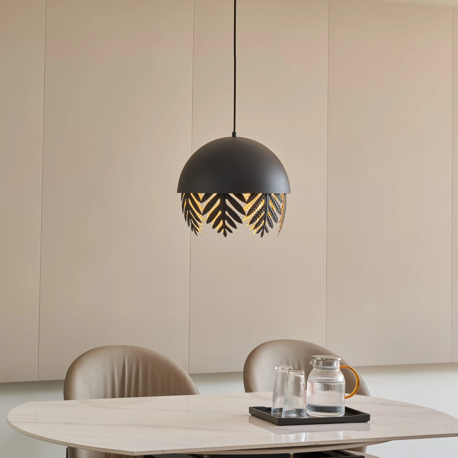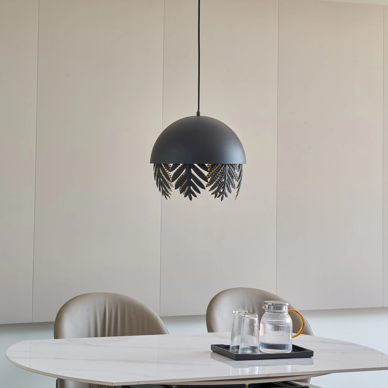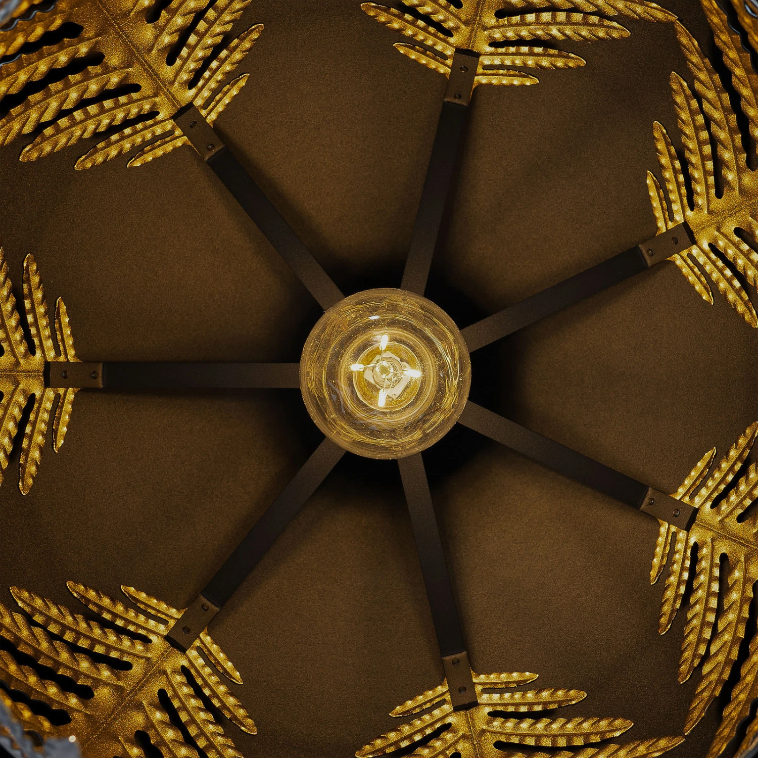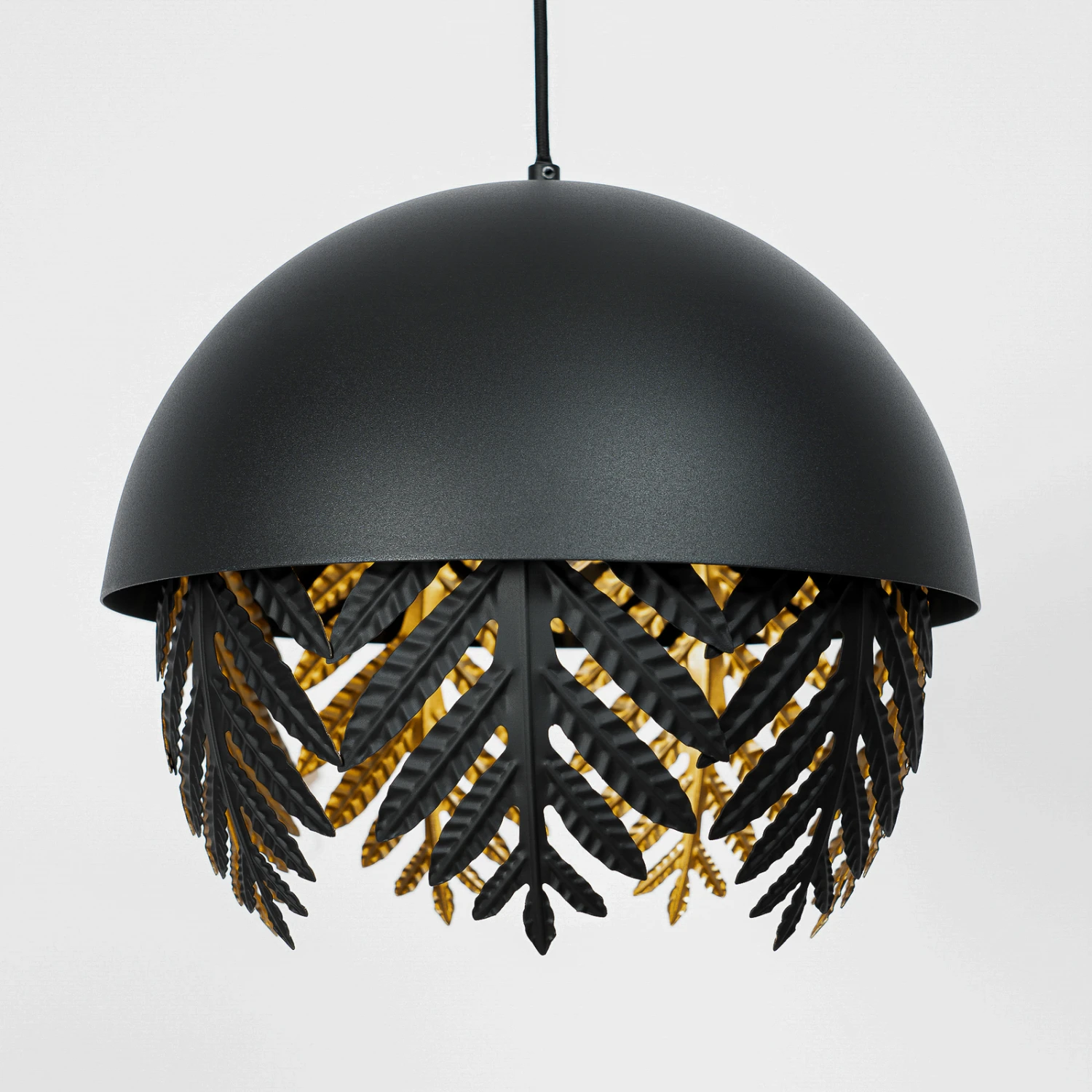 Runde Pendelleuchte Aparas mit schwarzem Schirm in Blattoptik und goldener Innenseite