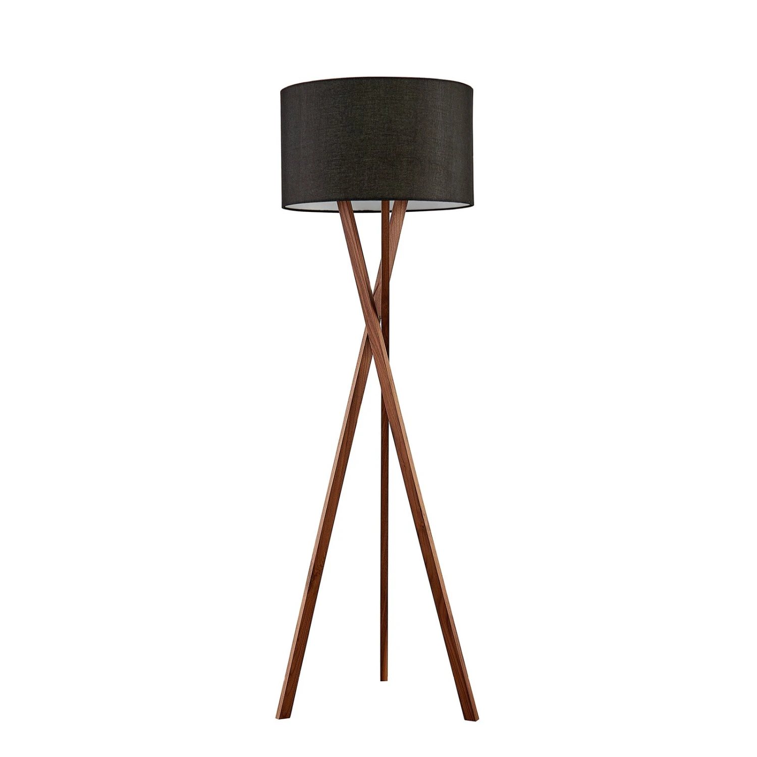 Dreibeinige Stehleuchte Auriane mit schwarzem Stoffschirm in Zylinderform und dunklem Walnussholz