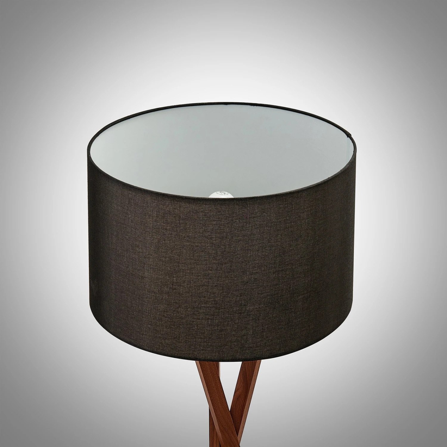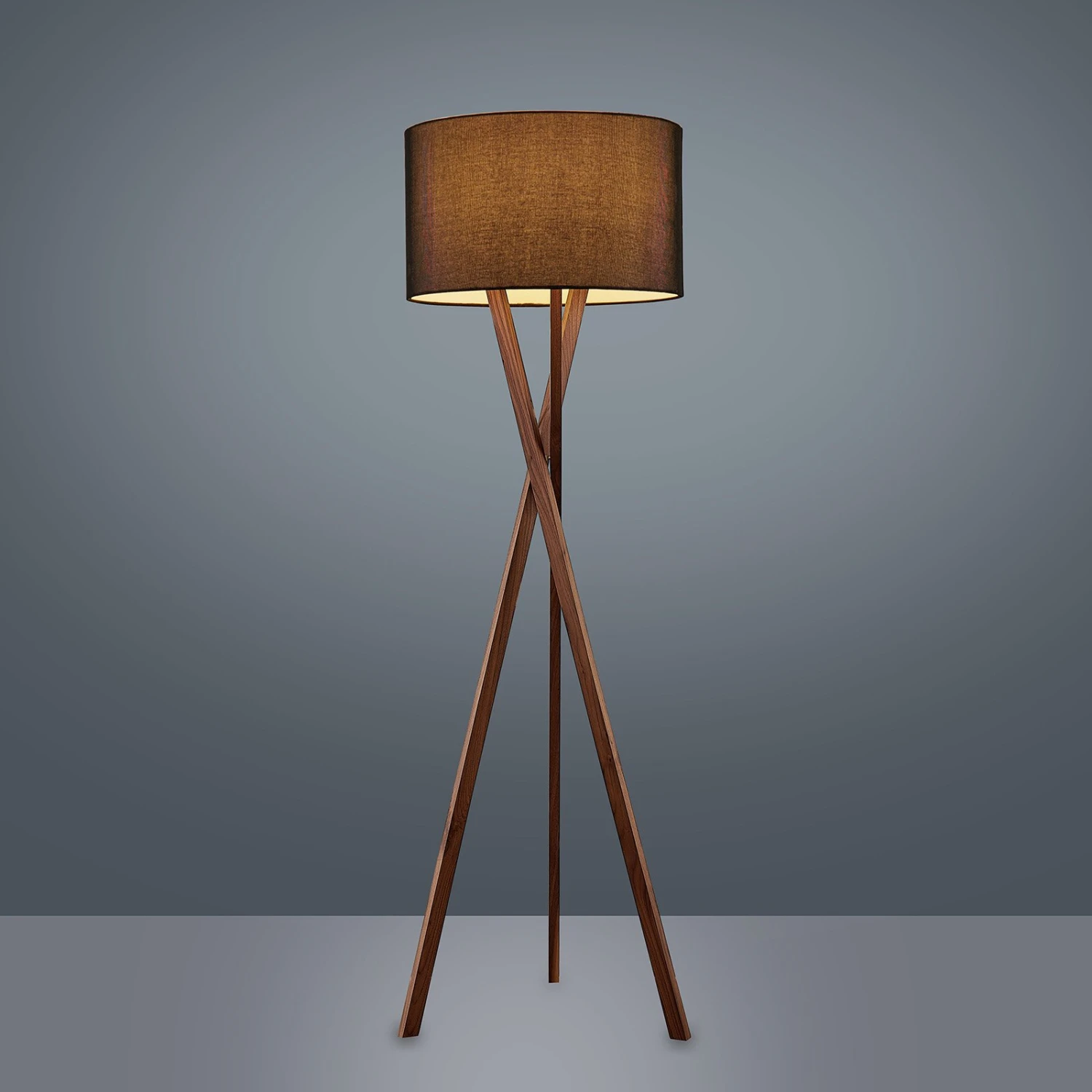 Auriane ist eine Stehlampe, die dem trendigen Tripod-Design entspringt und in modernen wie skandinavischen Wohnstilen eine erstklassige Ergänzung mit gemütlicher Ausstrahlung ist. Das verwendete Holz ist Walnuss, das eine dunkle, natürliche Oberfläche besitzt und aus nachhaltig bewirtschafteten Wäldern stammt, wie es mit der FSC-Zertifizierung kenntlich gemacht wird. Stilecht ergänzt wird das dreibeinige Gestell mit den sich kreuzenden Stäben von dem schwarzen Lampenschirm aus Stoff, der eine ansprechende Zylinderform besitzt und mit der dunklen Oberfläche gemütlich gedämpften Lichtschein entstehen lässt, der gerade entspannte Abendstunden schön untermalt, so dass man sich schön zurücklehnen und die Erlebnisse des Tages in einer Wohlfühlumgebung nochmal Revue passieren lassen kann.