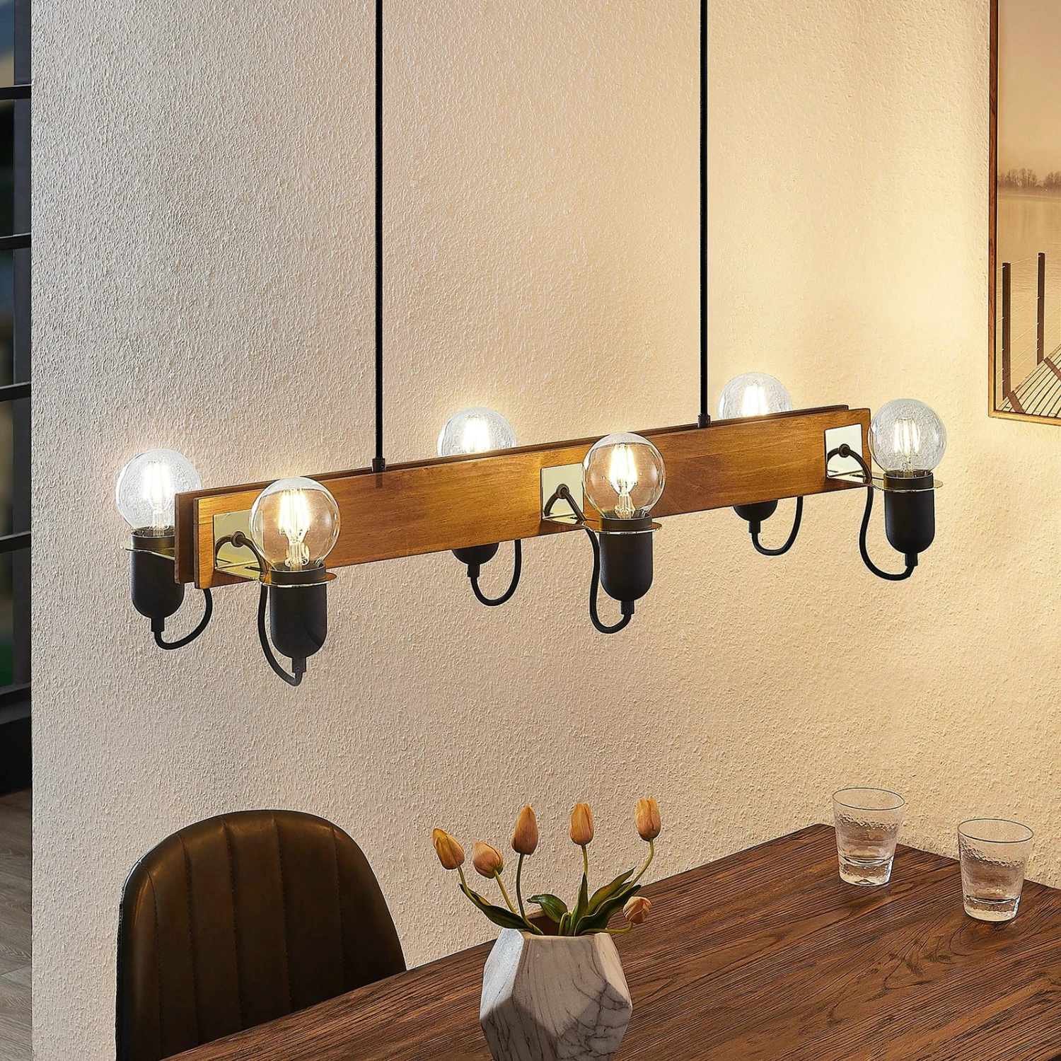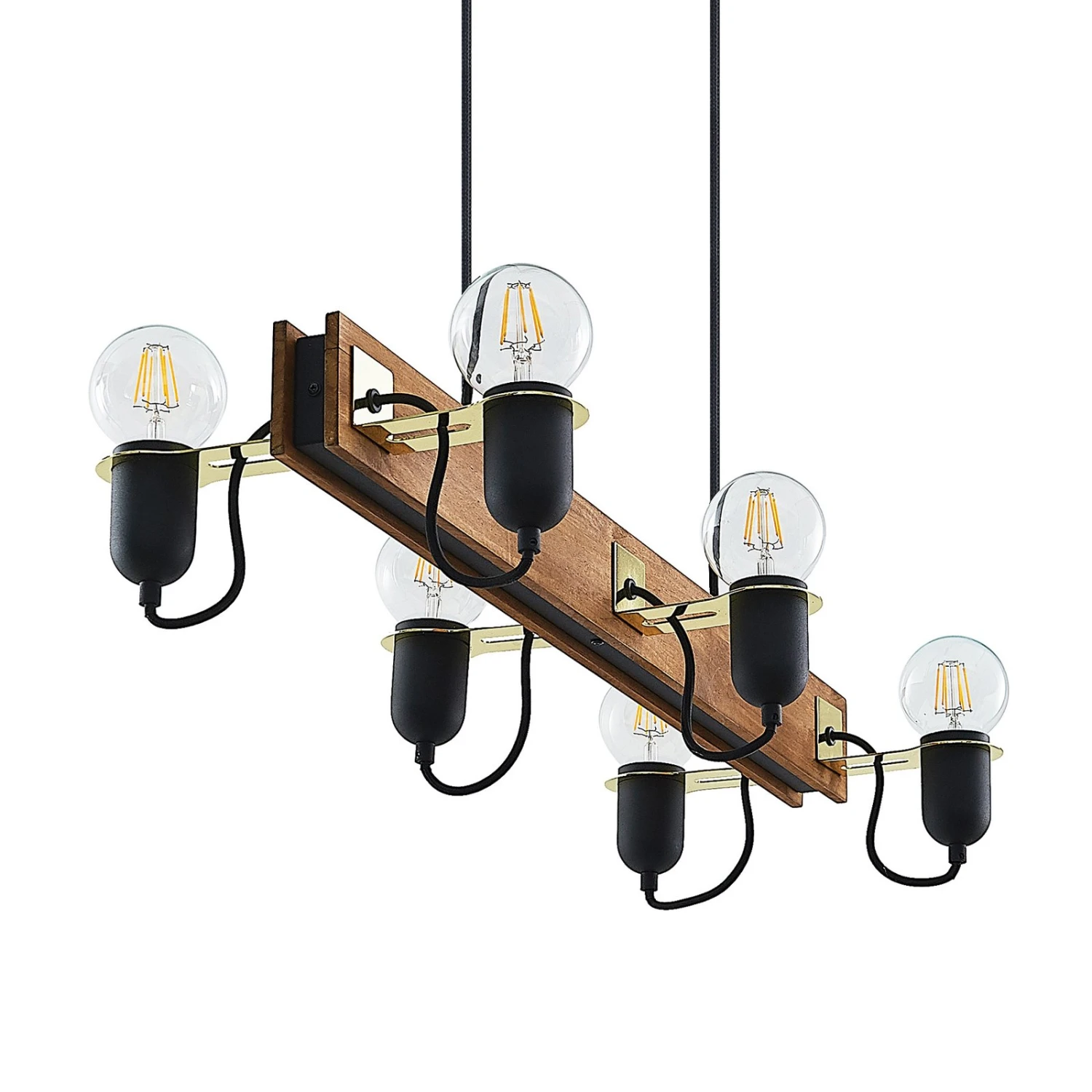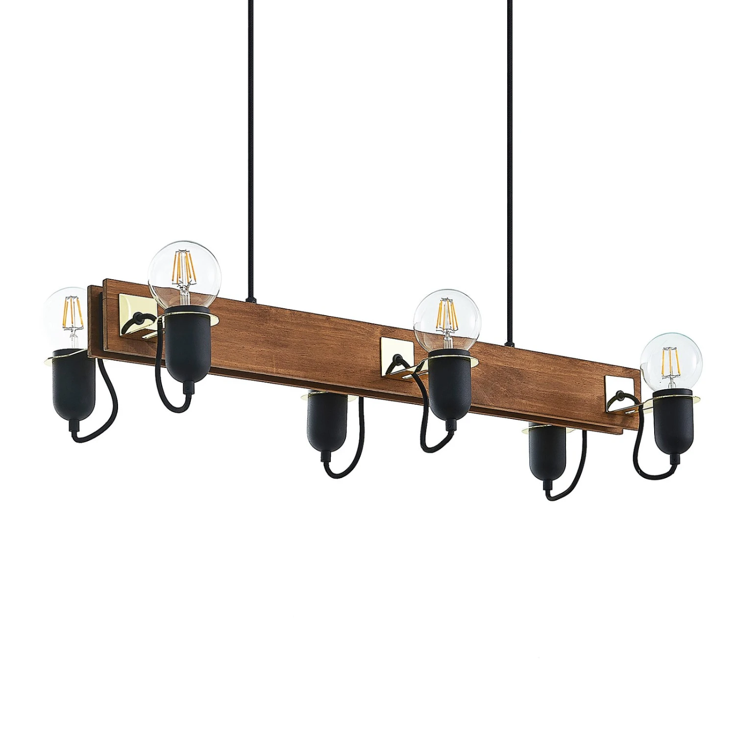 Balkenpendelleuchte Becky mit Holz und schwarzen Lampenfassungen, sechsflammige Ausführung – ideal zur Tischbeleuchtung