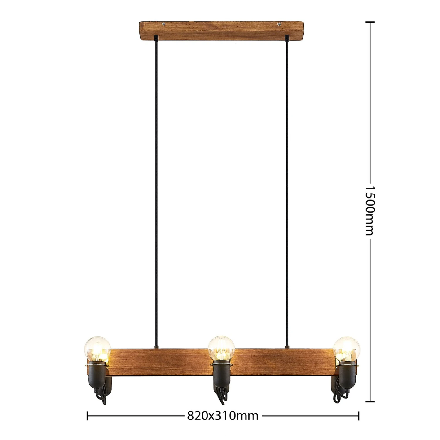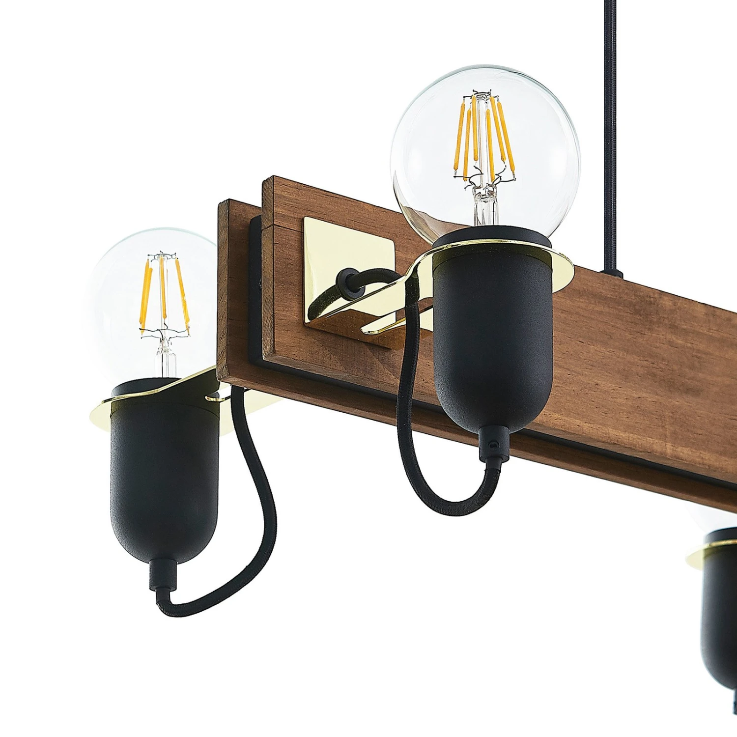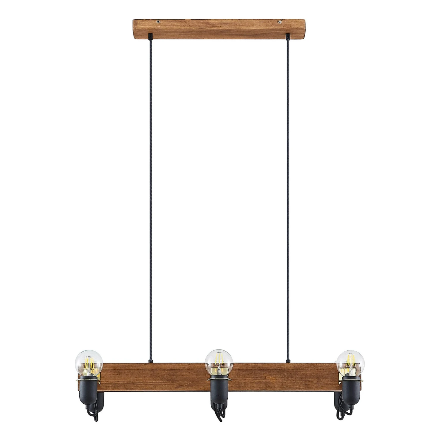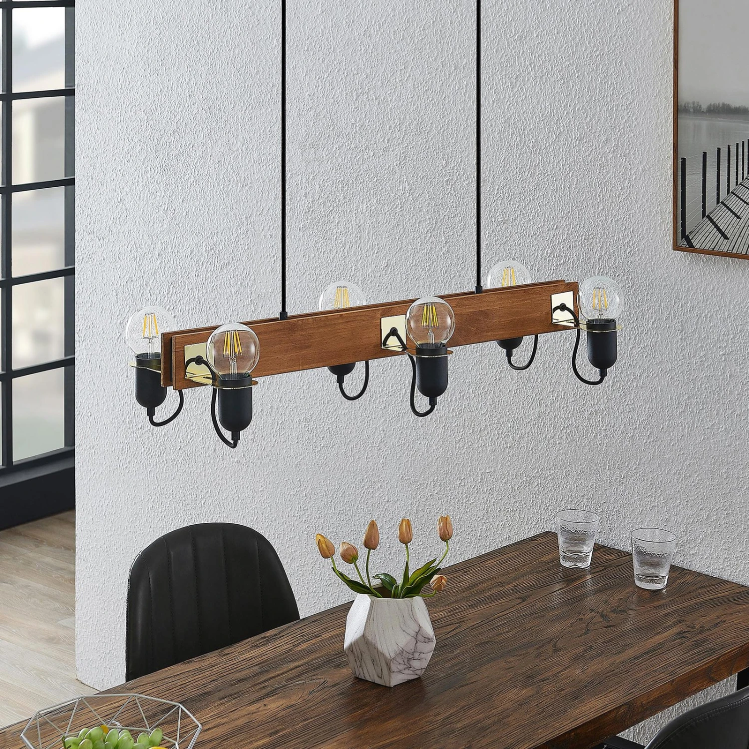 Balkenpendelleuchte Becky mit Holz und schwarzen Lampenfassungen, sechsflammige Ausführung – ideal zur Tischbeleuchtung