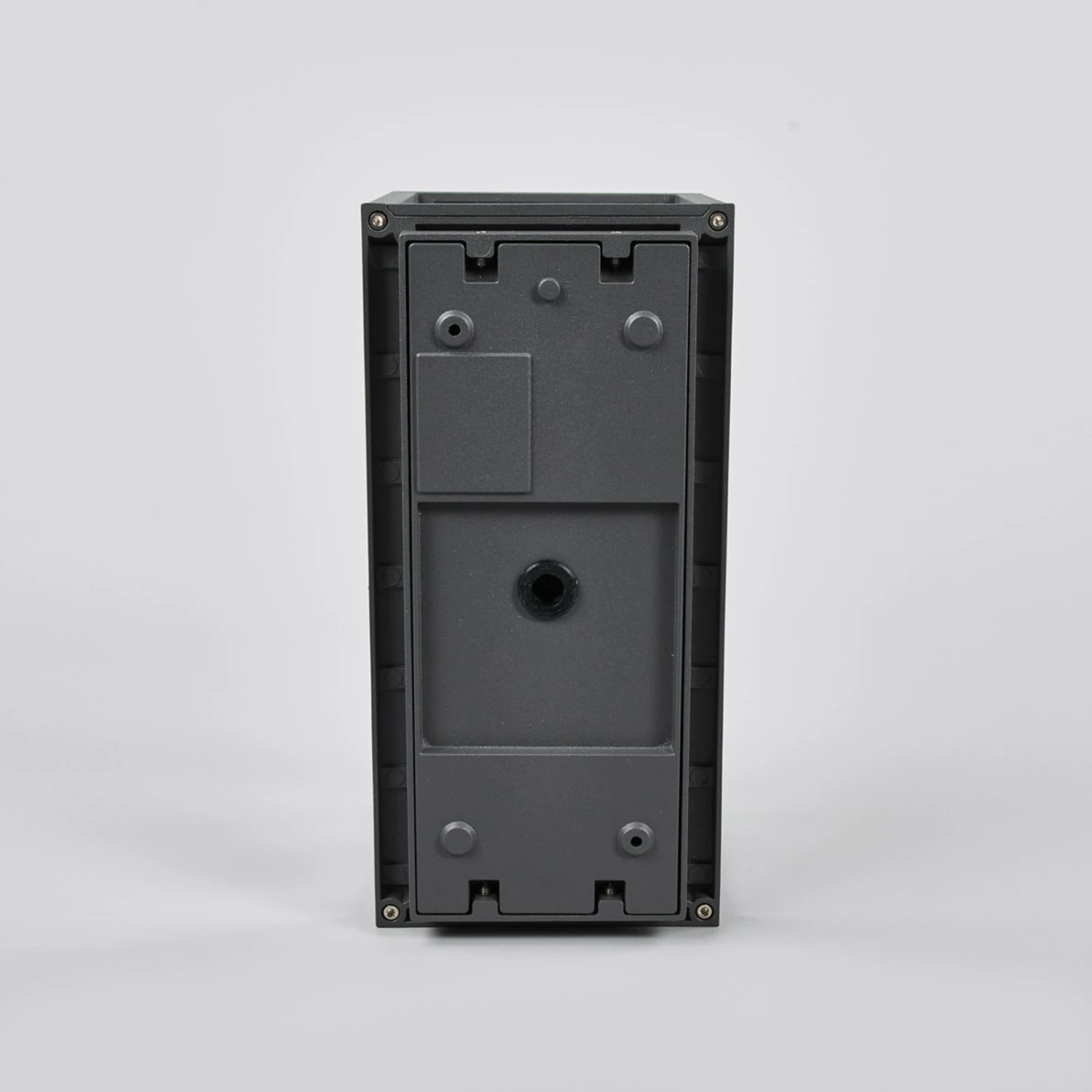 Annalea besitzt eine moderne Optik, denn die Außenwandlampe setzt sich aus einem Aluminiumrahmen und ergänzenden Glasscheiben mit klarer Oberfläche zusammen. Man setzt eine A60-Lampe mit E27-Sockel ein und kann dabei selbstverständlich auch auf LED-Lampen zurückgreifen. Das Gesamtdesign mit der dunkelgrauen Oberfläche und der eckigen Gestalt kleidet die Umgebung moderner Bauten besonders gut.
