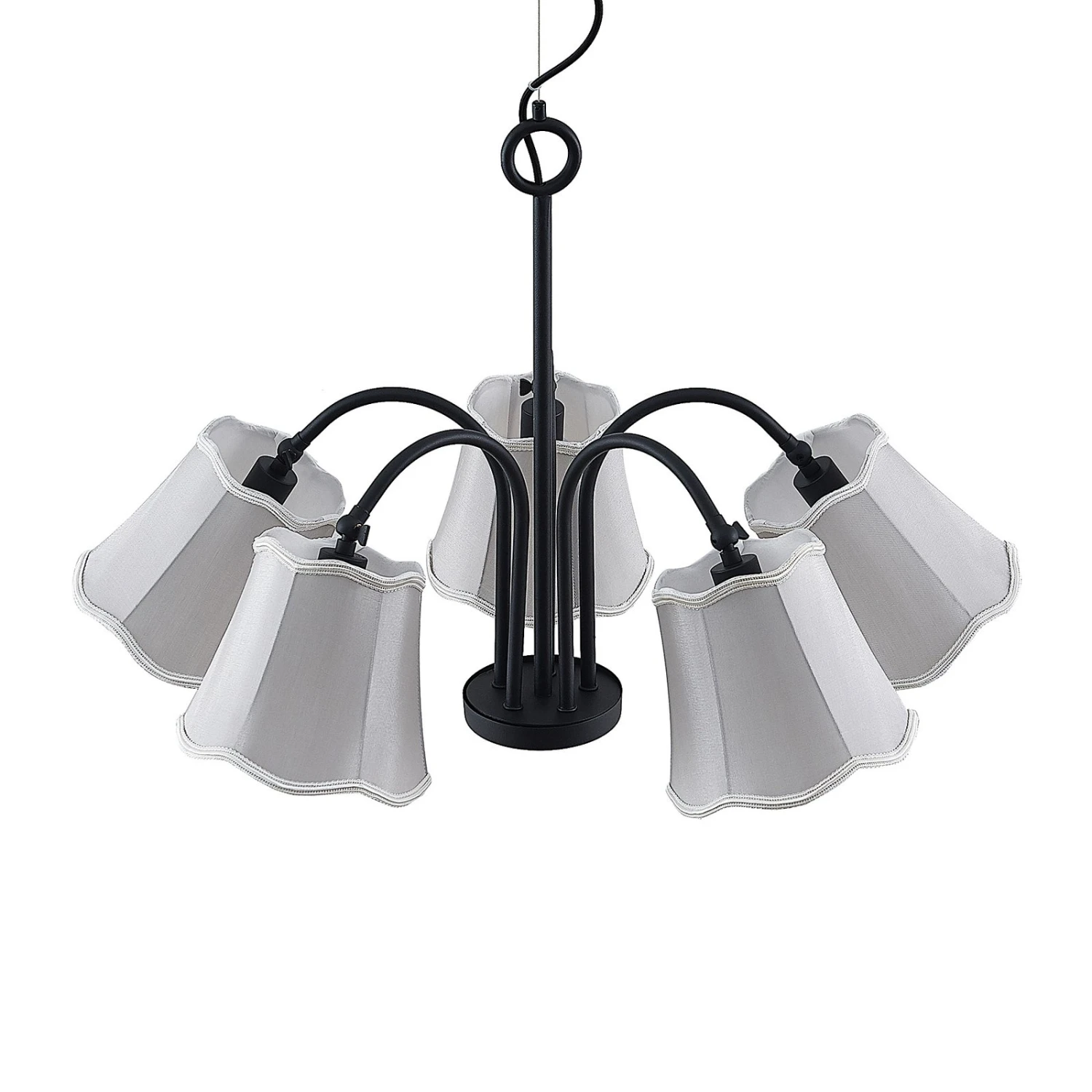 Binta hat fünf Stoffschirme in einem edlen Silbergrau, die an dem schwarzen, gebogenen Gestell angebracht sind und ihr Licht nach unten abgeben. So kann jede Lichtquelle die Tischfläche gezielt ausleuchten, das Umgebungslicht hingegen ist weich und diffus und von einer gemütlichen Wirkung geprägt. Die Lampenschirme sind dabei sehr traditionell gestaltet mit einem wellenförmigen Abschluss oben und unten, so dass Bezüge zu den Anfängen elektrischen Lichts hergestellt werden können, wo diese – heute als nostalgisch geltende – Form sich schon einmal großer Beliebtheit erfreut hat. In der fünfflammigen Aussführung ist die Pendelleuchte Binta wie gemacht für die Beleuchtung eines Esszimmers und sie sorgt für relativ hellen Lichtschein auf dem Tisch, ohne dass die Behaglichkeit verlorengeht.