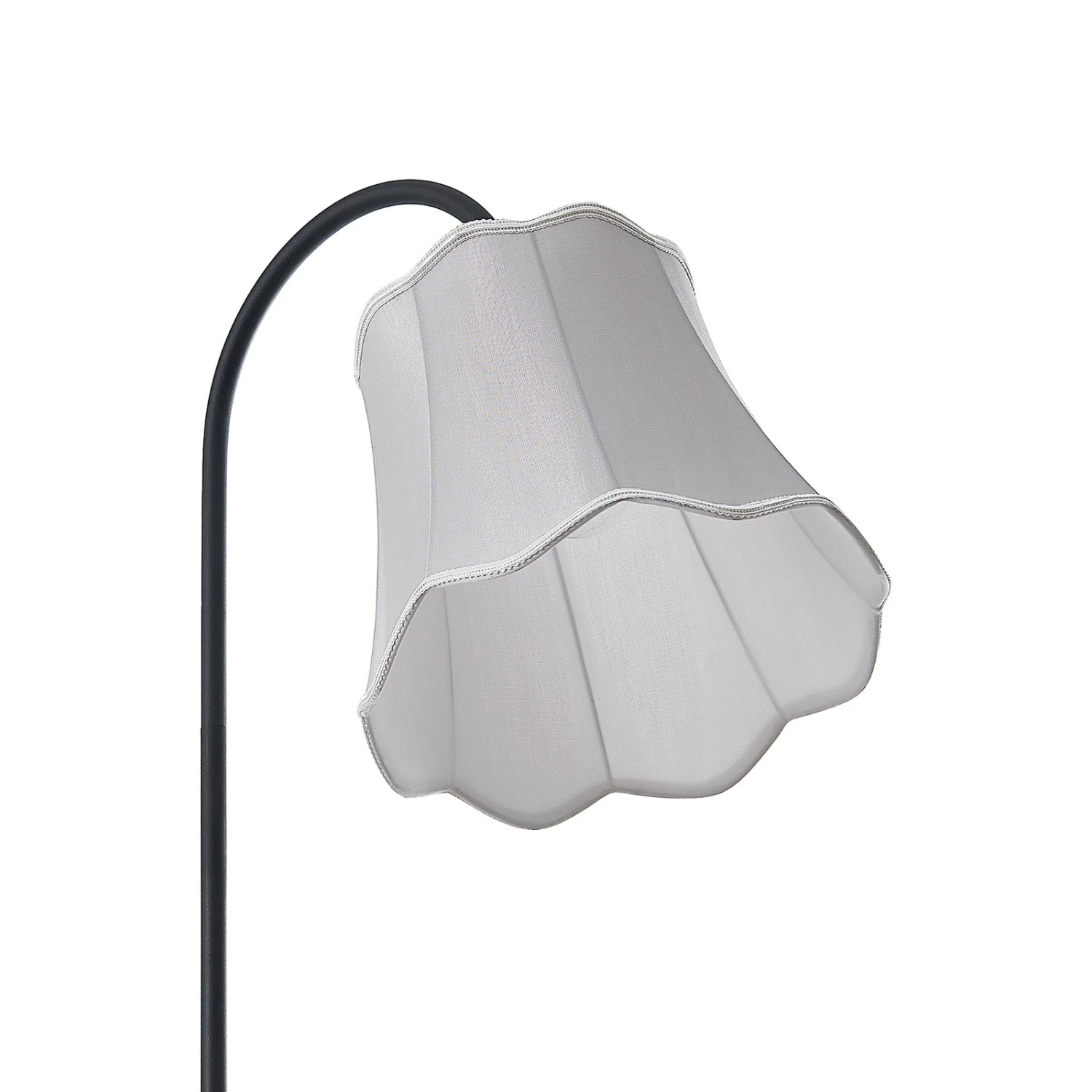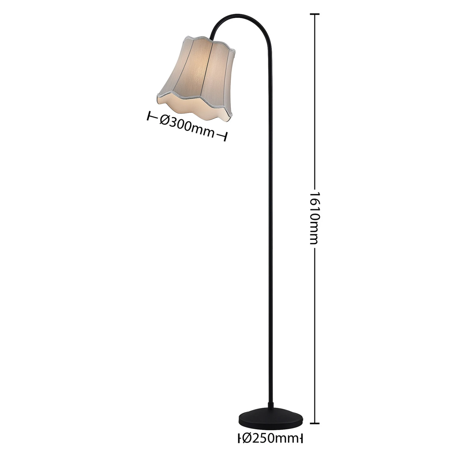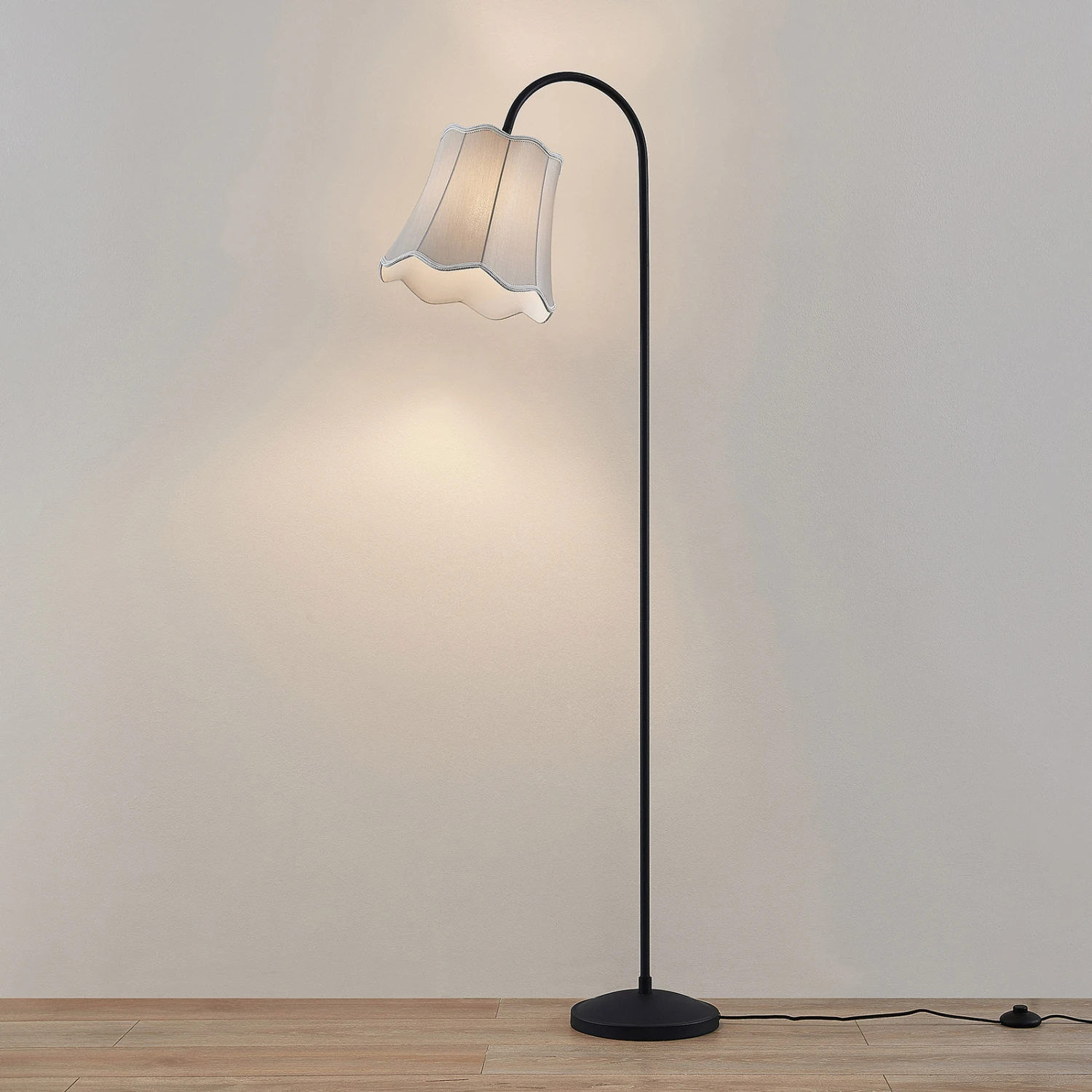 Gebogene Textilstehlampe Binta in exklusivem Design mit silbergrauem Lampenschirm in nostalgischer Optik