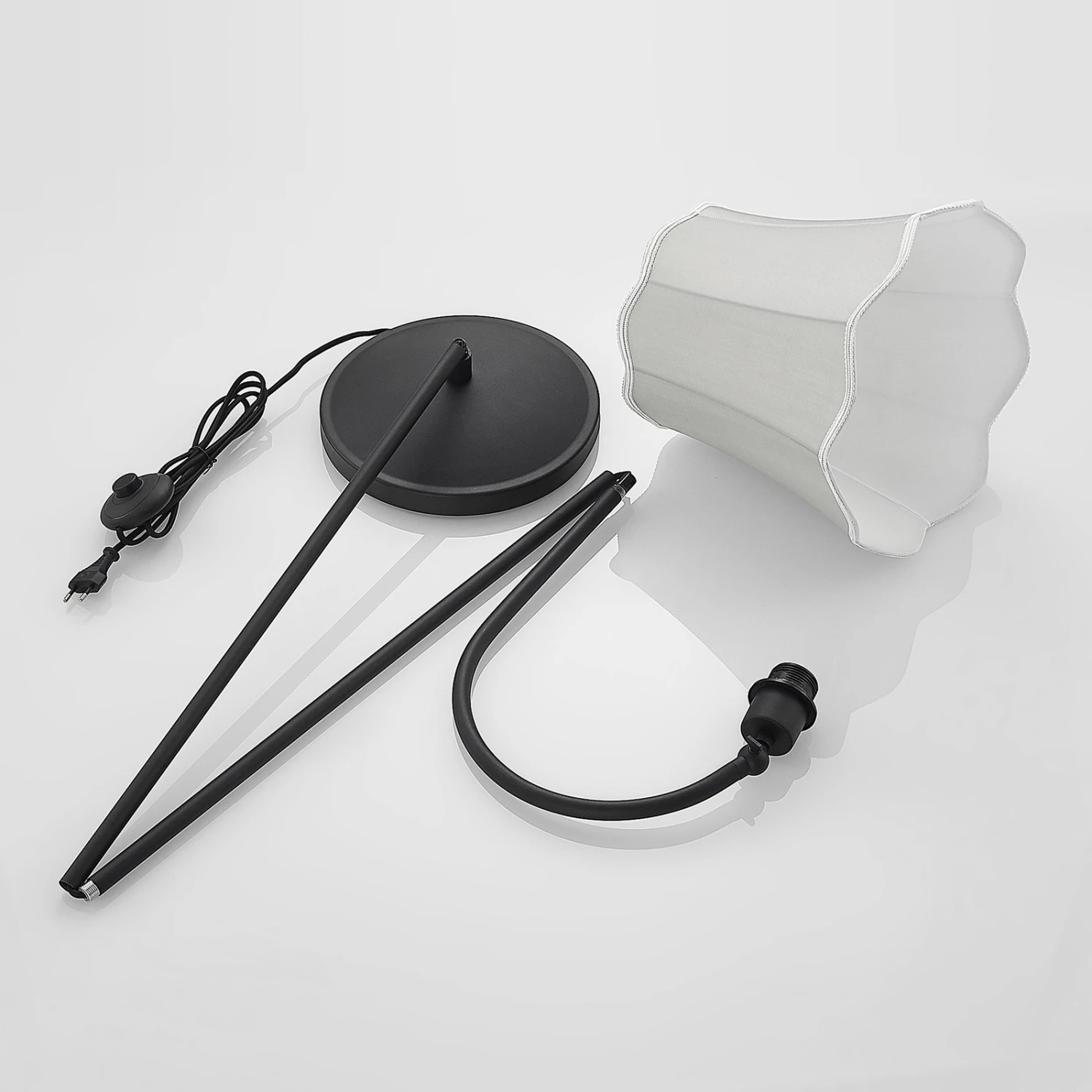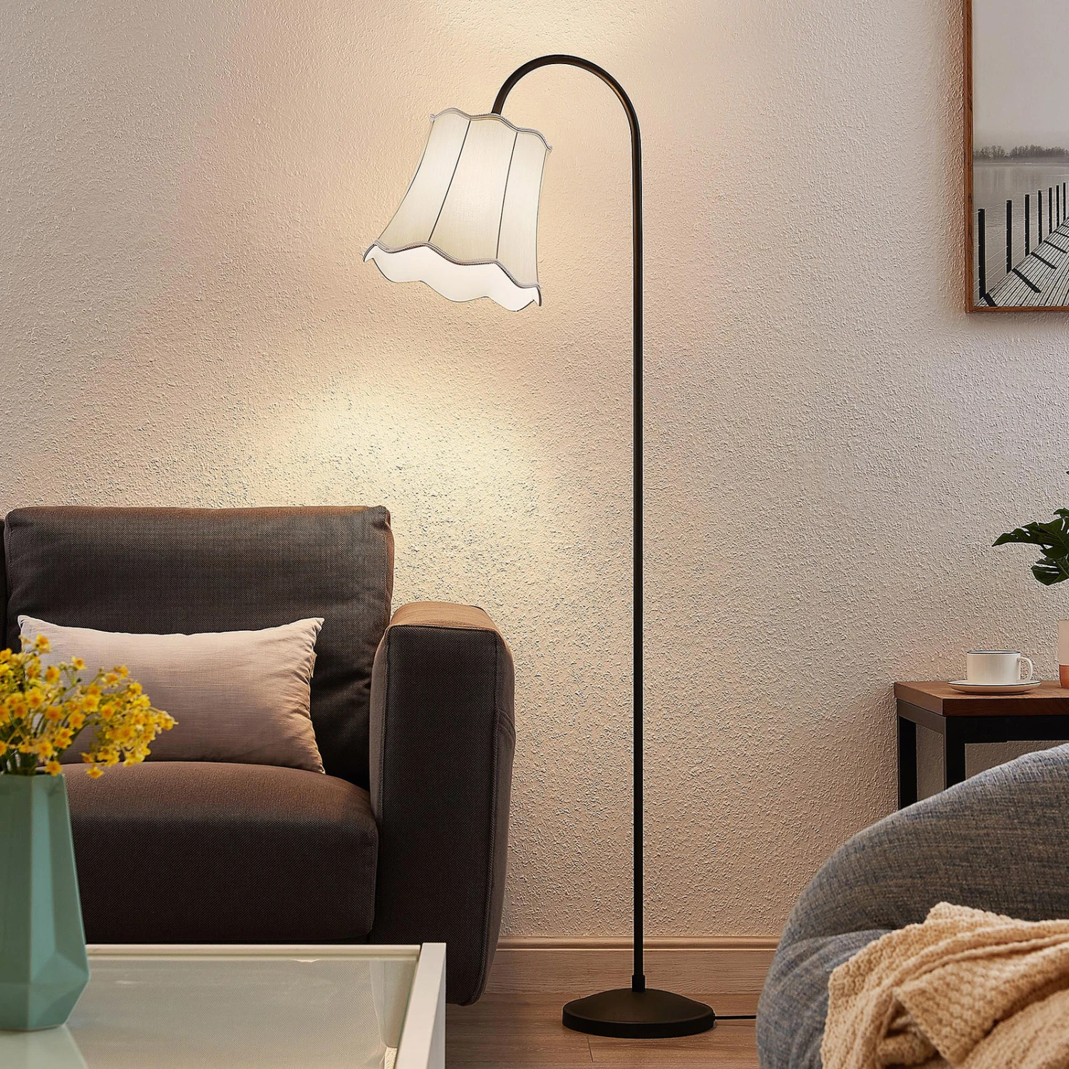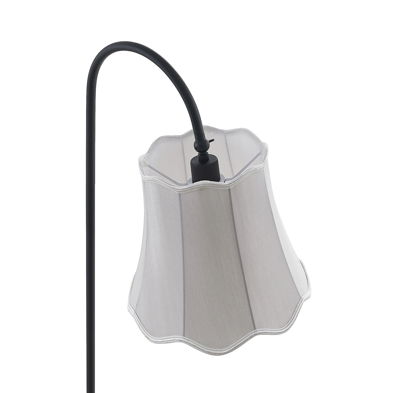 Gebogene Textilstehlampe Binta in exklusivem Design mit silbergrauem Lampenschirm in nostalgischer Optik