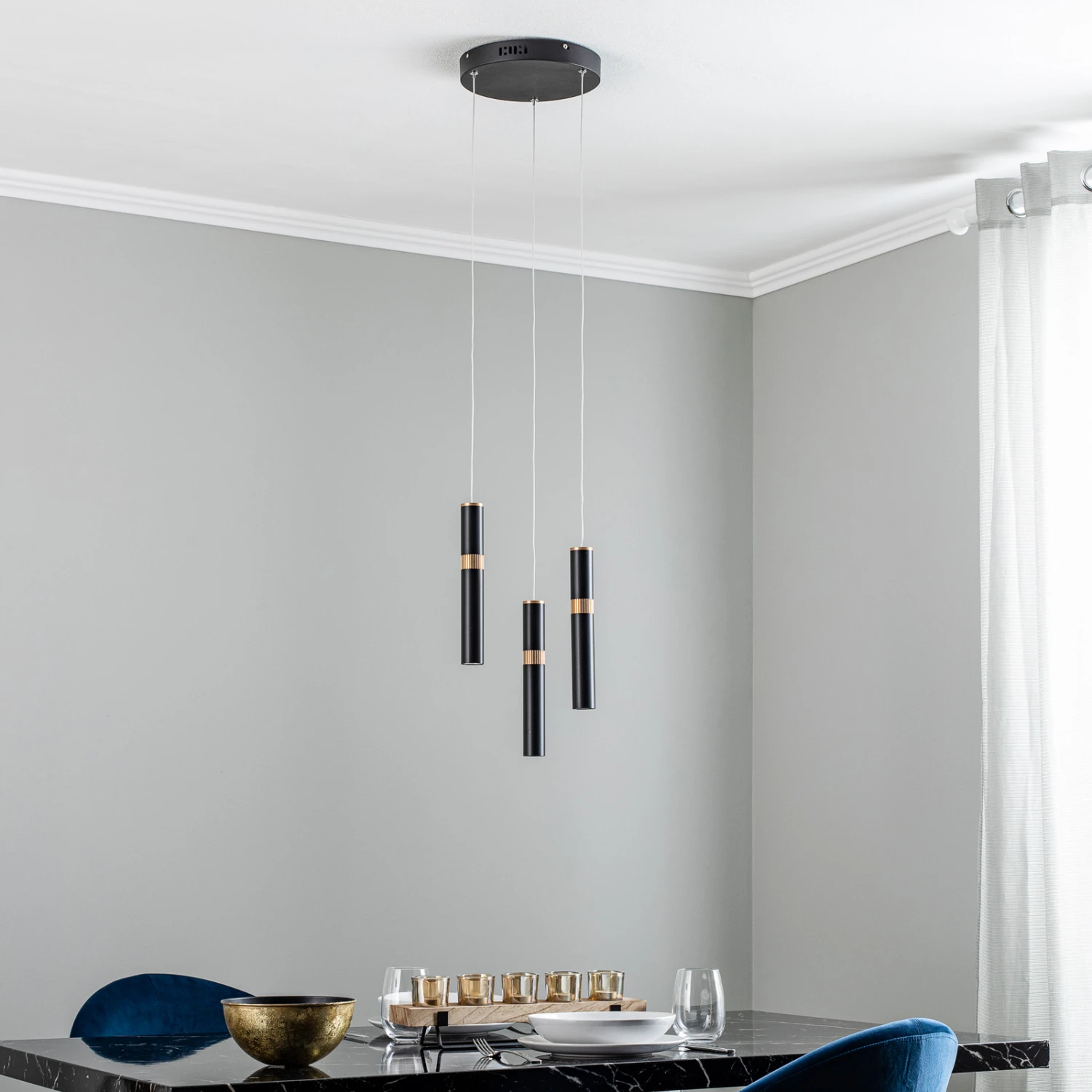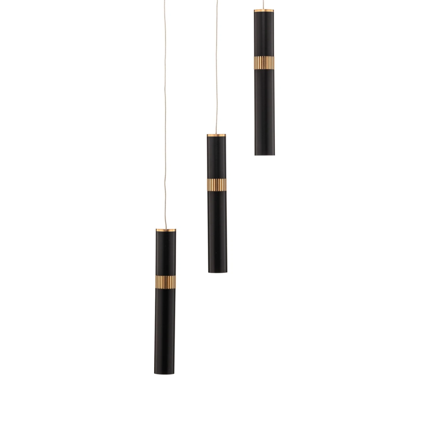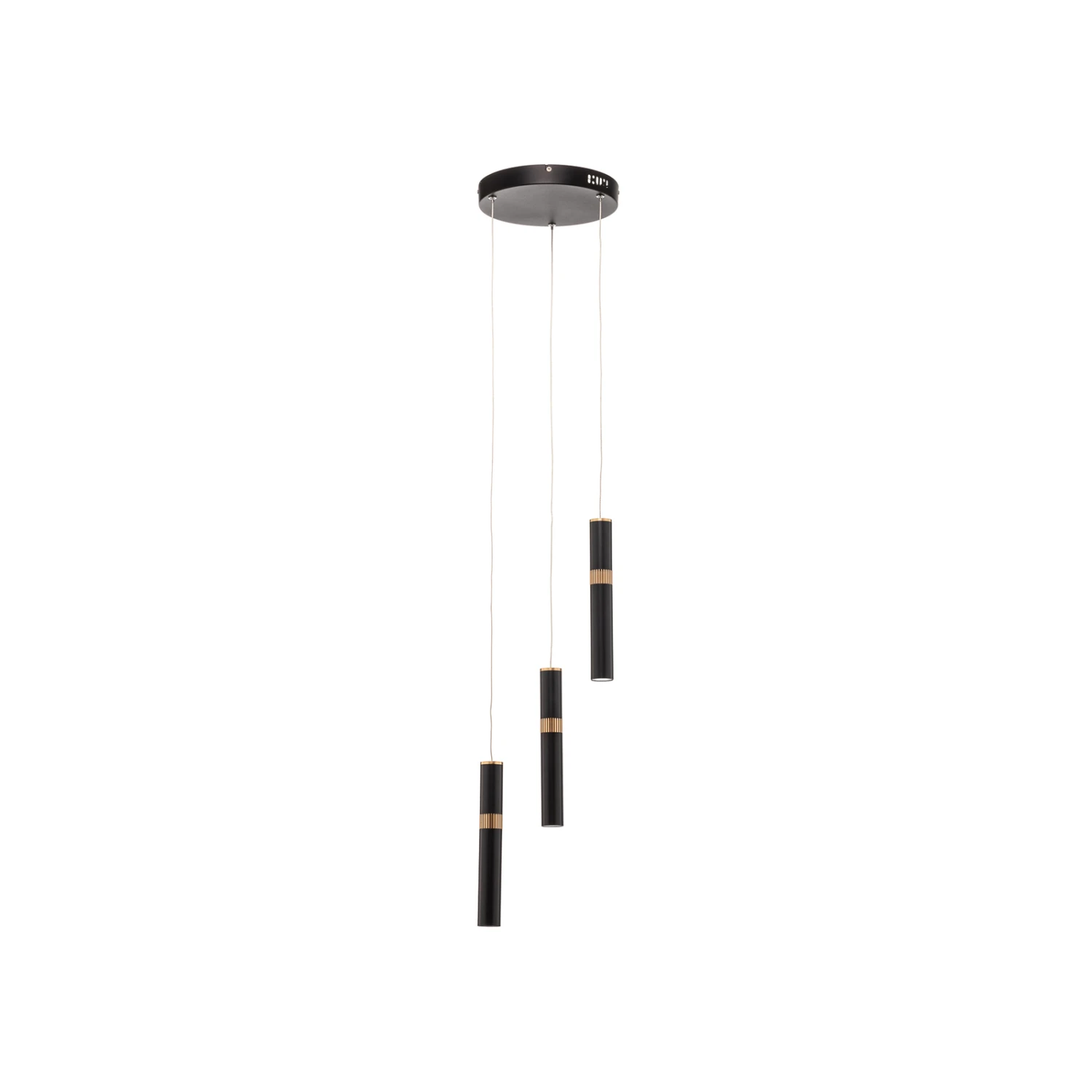 Dreiflammige LED-Pendelleuchte Bjarko mit schwarzen Röhren und messingfarbigen Details – sehr edel für den Wohnbereich und in der Gastronomie