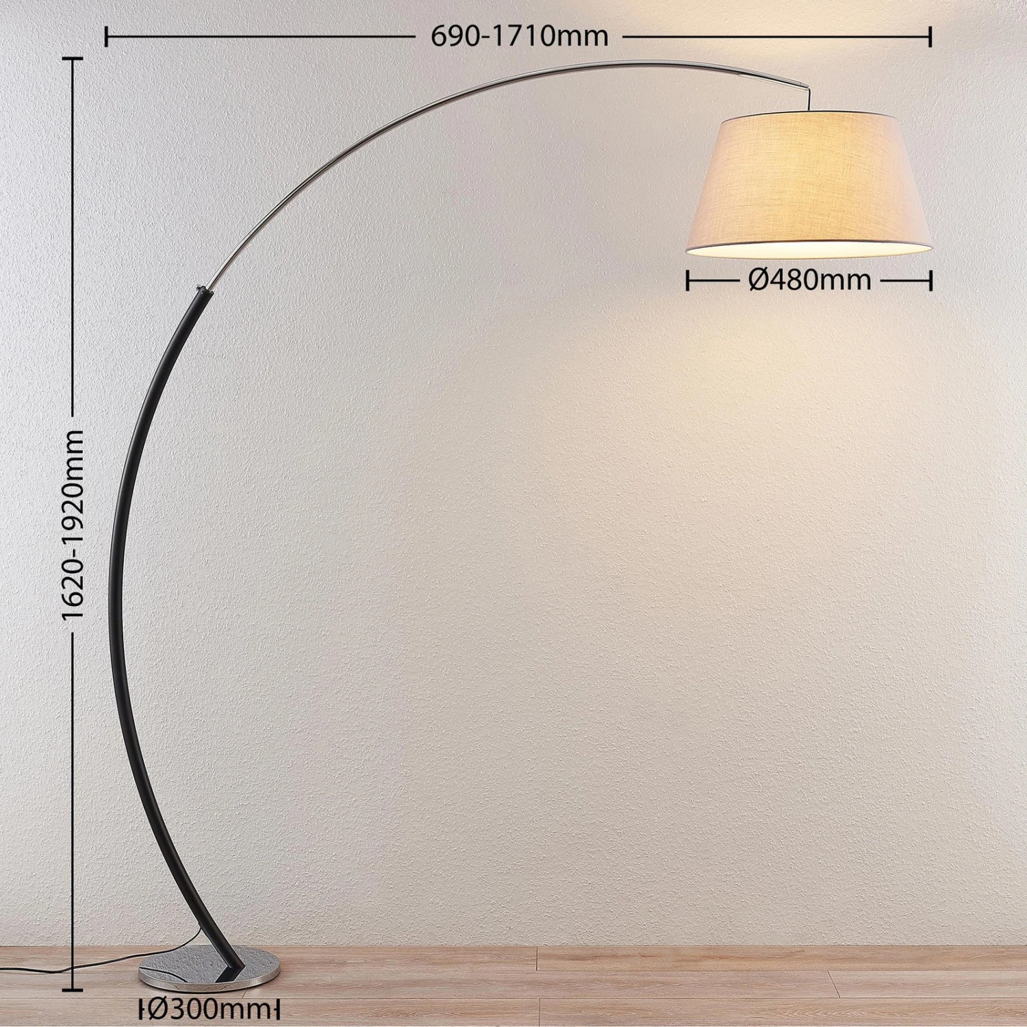 Bogenstehlampe Evelyna mit grauem Stoffschirm