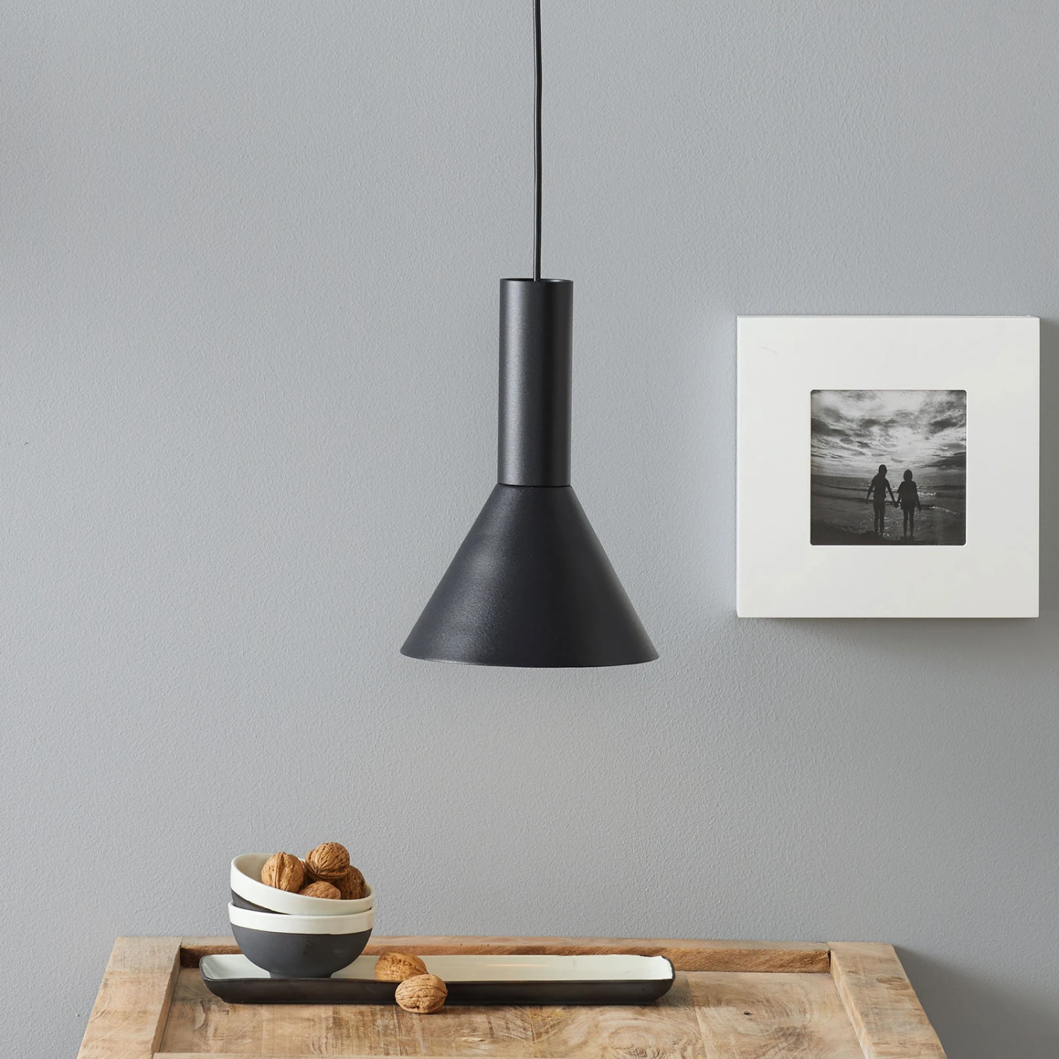 Schlichte Eleganz – das beschreibt die Hängeleuchte Caris. Sie begeistert mit klaren Linien und einem zurückhaltenden Design. Das Gehäuse besteht aus schwarz lackiertem Stahl, welcher der Leuchte zusätzlich Modernität verleiht. Dank des nach unten geöffneten Lampenschirms eignet sich die Leuchte hervorragend, um einen Tisch im Wohn- oder Esszimmer auszuleuchten. Der trichterförmige Lampenschirm erlaubt dabei einen freien Blick auf das Leuchtmittel (nicht enthalten). Dadurch sollte ein Leuchtmittel in trendiger Filament- oder Kohlefaser-Optik gewählt werden.