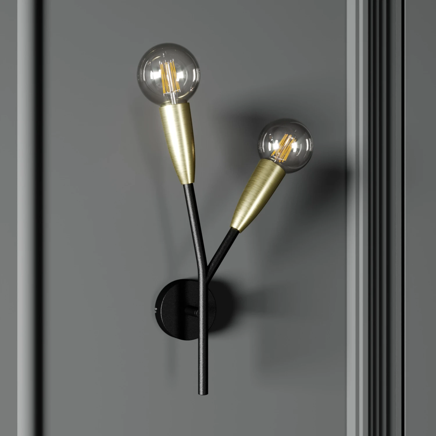 Zweiflammige Wandlampe Carlea in designorientierter Gestalt, schwarz und messingfarben