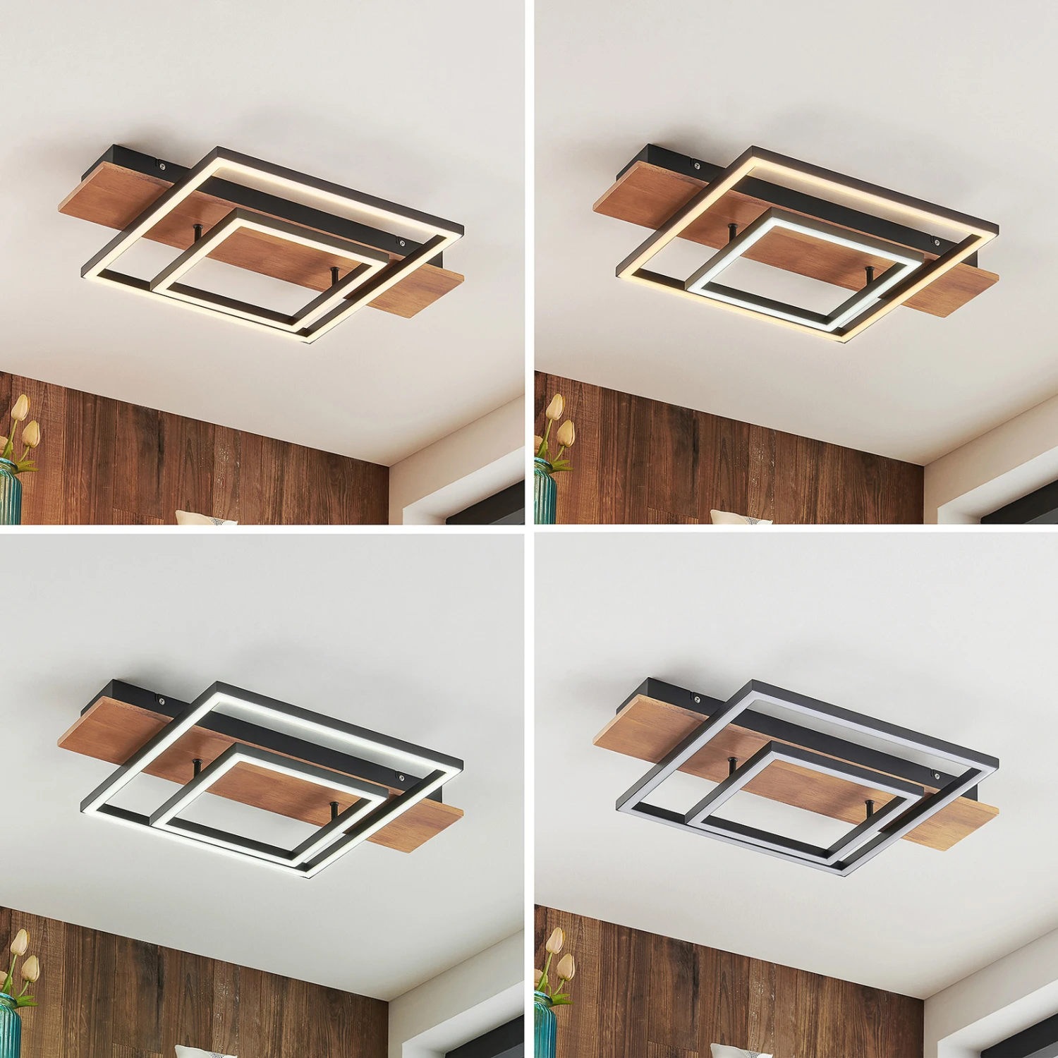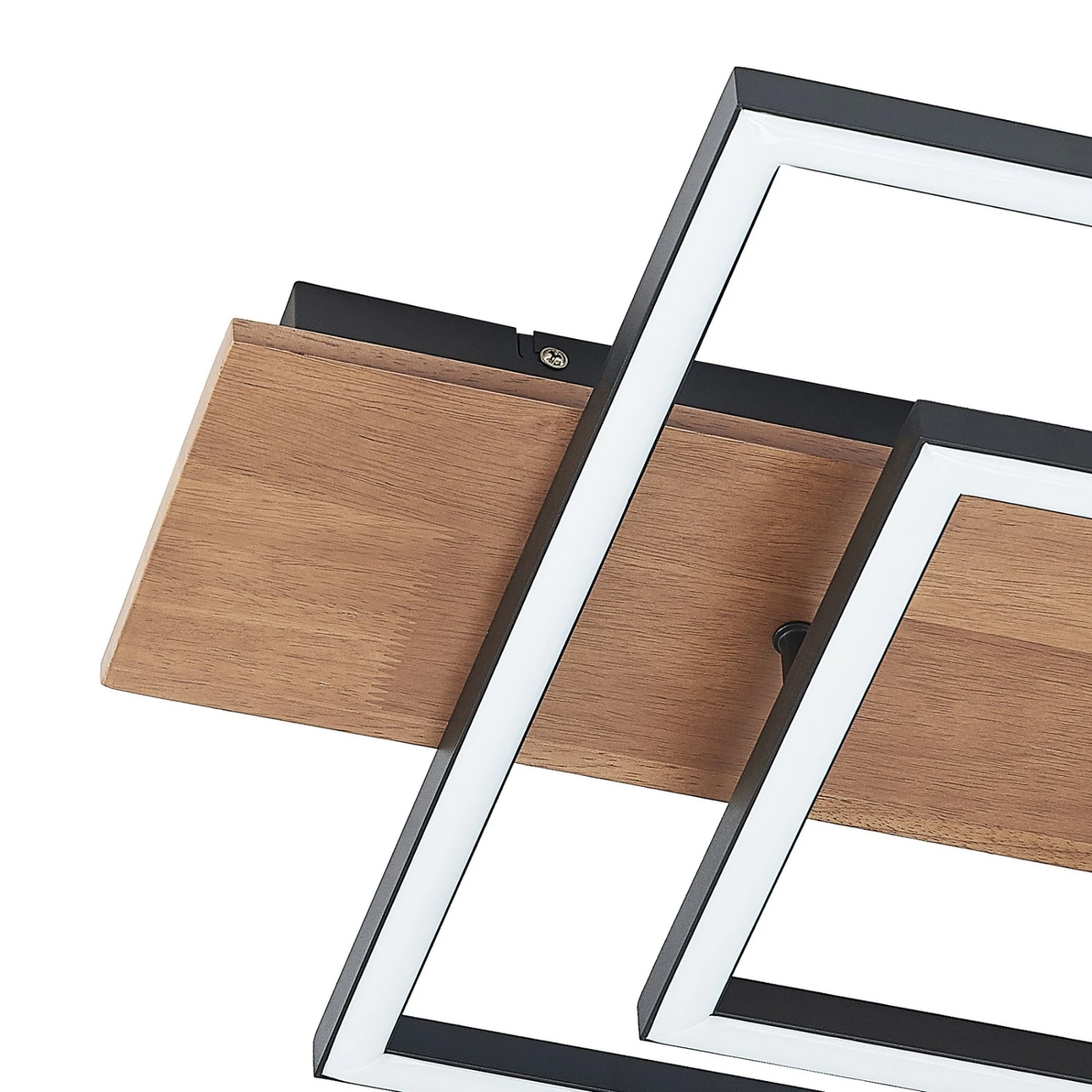 Zwei schwarze Rahmen in quadratischer Form bilden die Leuchtelemente von Chariska, die ein Lichtspender mit moderner Ausstrahlung ist, aber auch eine natürliche Wirkung besitzt. Letzteres liegt daran, dass sie unter den schwarzen Rahmen mit den LEDs ein Echtholzelement hat, das noch die natürliche Holzmaserung erkennen lässt, aber eine bräunliche Lasierung besitzt. Die in einem exklusiven Design gestaltete LED-Deckenleuchte verkörpert damit einen stilvollen Ausdruck, der in vielen modernen Einrichtungen gut zur Geltung kommt und auch skandinavische Einrichtungen schön zu ergänzen vermag.