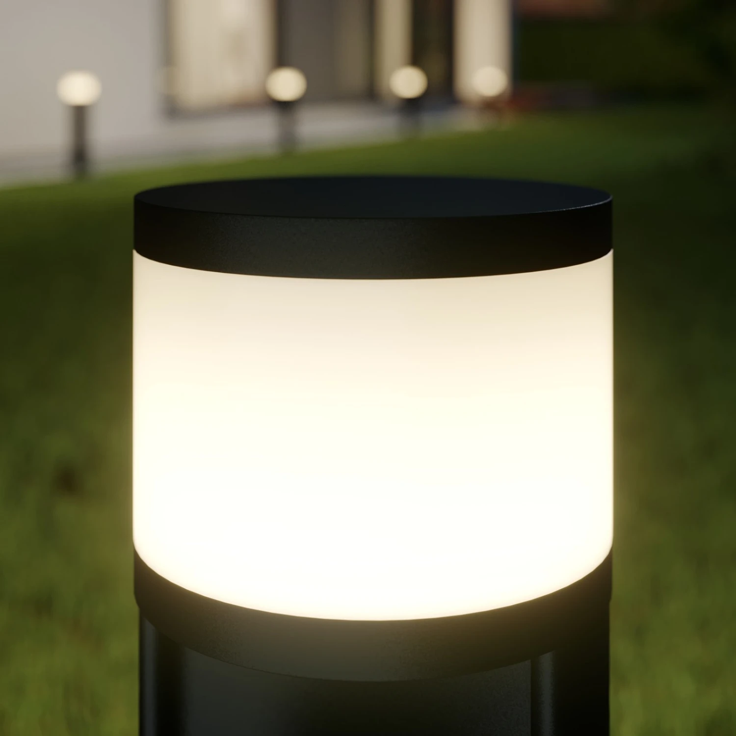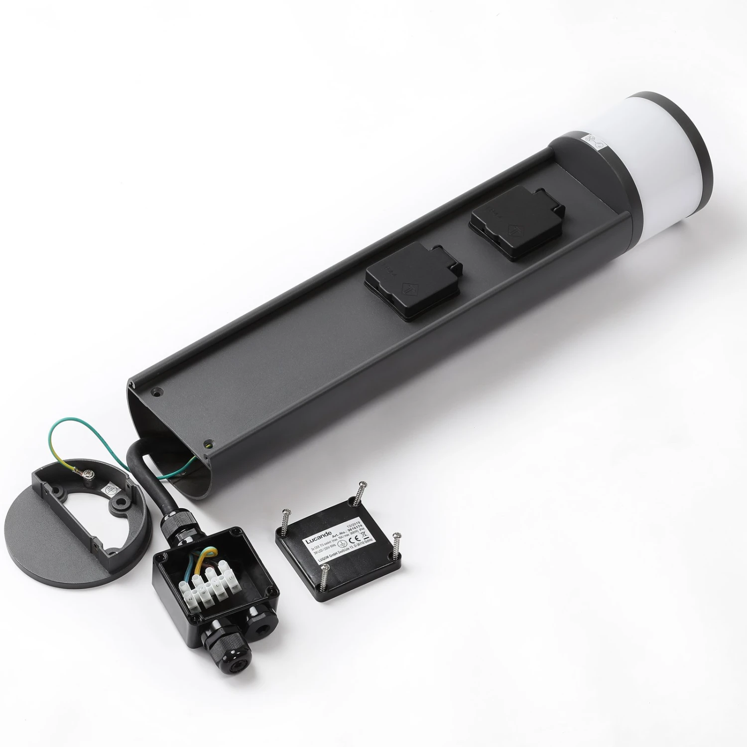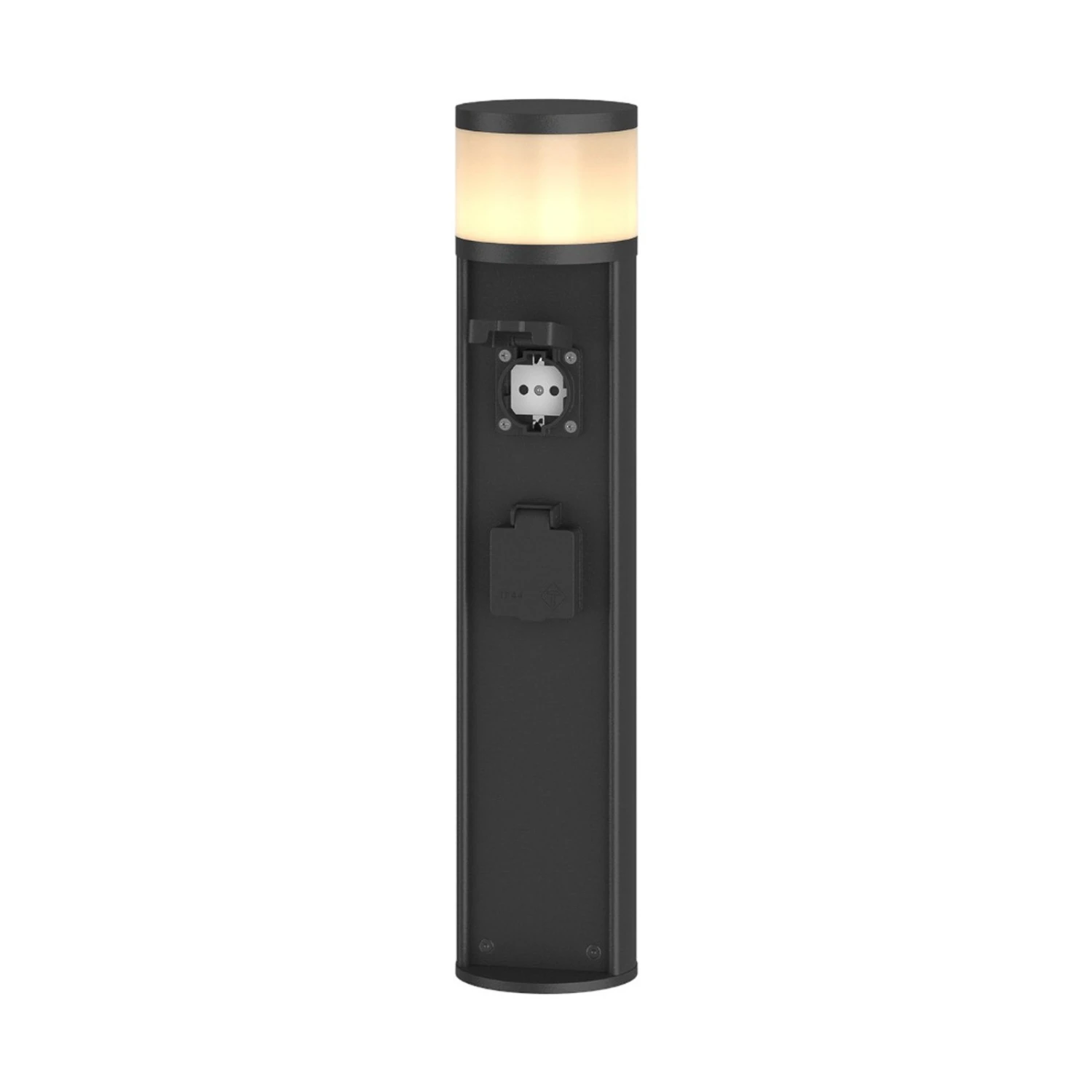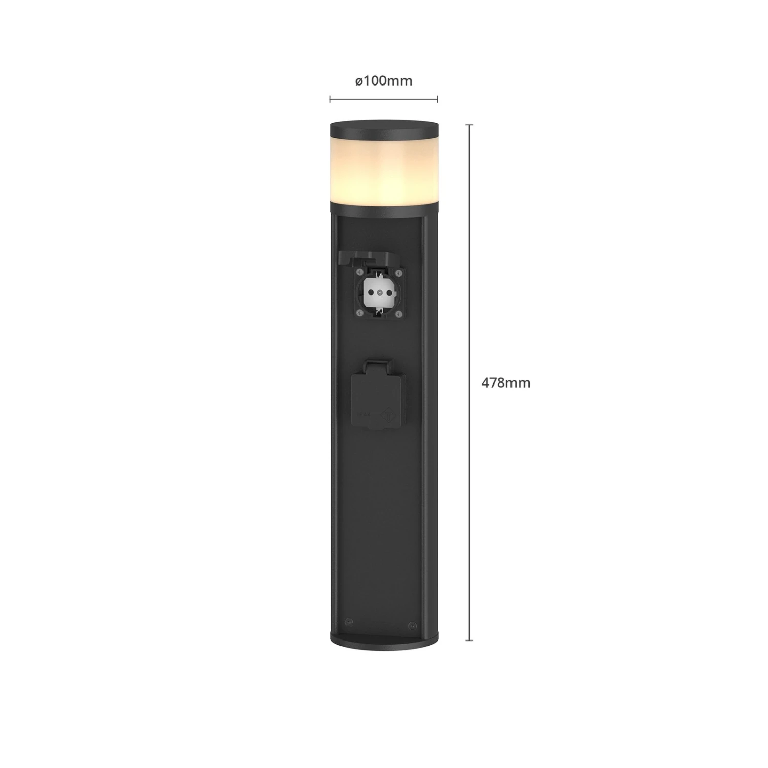In den zylinderförmigen Körper der Sockelleuchte Corban sind zwei Steckdosen eingebaut, sodass die Stromversorgung bei der Gartenarbeit gewährleistet ist. Die Steckdosen sind bis zu 3.680 Watt belastbar. Damit der Außenbereich auch in der Dunkelheit erstrahlt, befindet sich am oberen Ende der Leuchte ein weißer Diffusor, der das warmweiße Licht der fest verbauten LED gleichmäßig in der Umgebung verteilt.