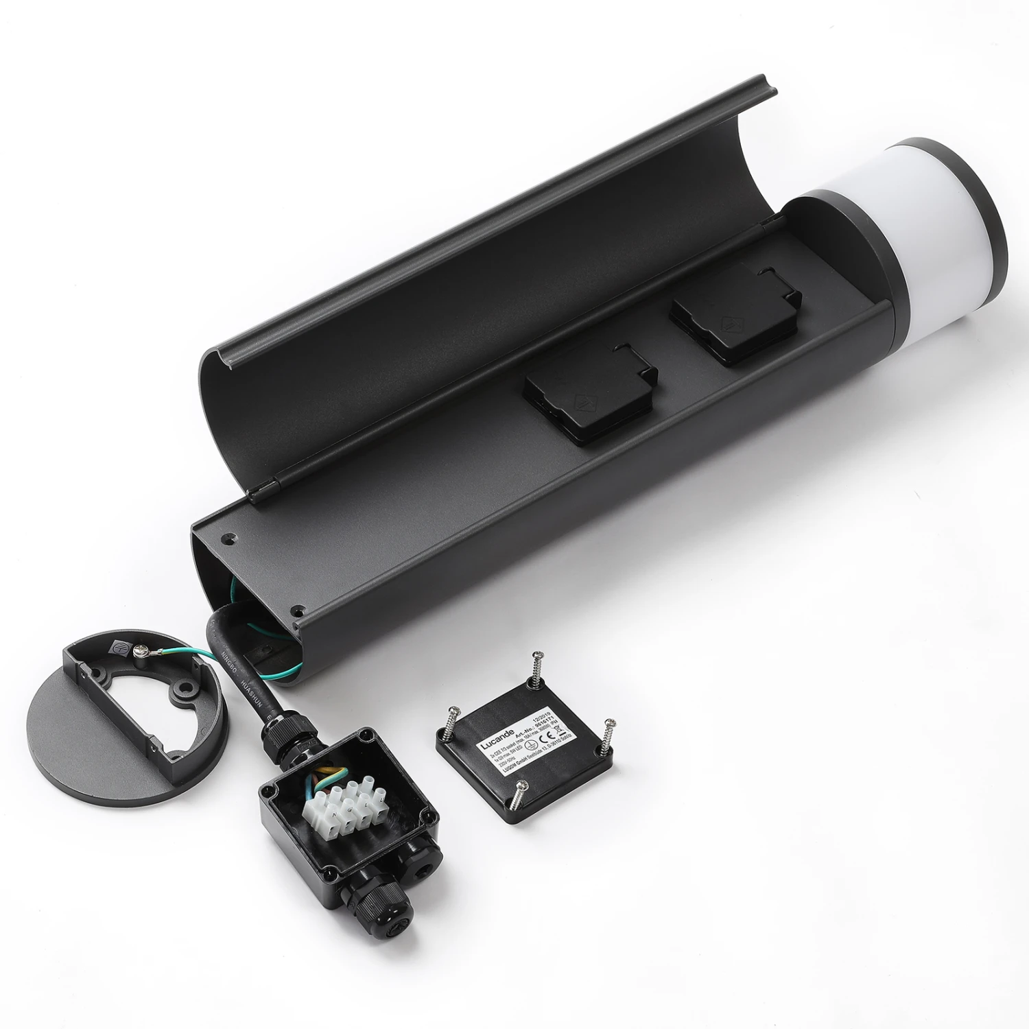 Die Sockelleuchte Corban bringt nicht nur Licht ins Dunkel, sondern stellt auch eine Stromversorgung im Außenbereich zur Verfügung. Die Leuchte hat einen schlanken Korpus aus Aluminium, in den zwei Steckdosen für eine maximale Gesamtleistung von 3.680 Watt eingebaut sind, die sich hinter einer Tür verbergen. Am oberen Ende der Leuchte ist ein weißer Diffusor eingelassen, der für eine gleichmäßige Lichtverteilung sorgt.