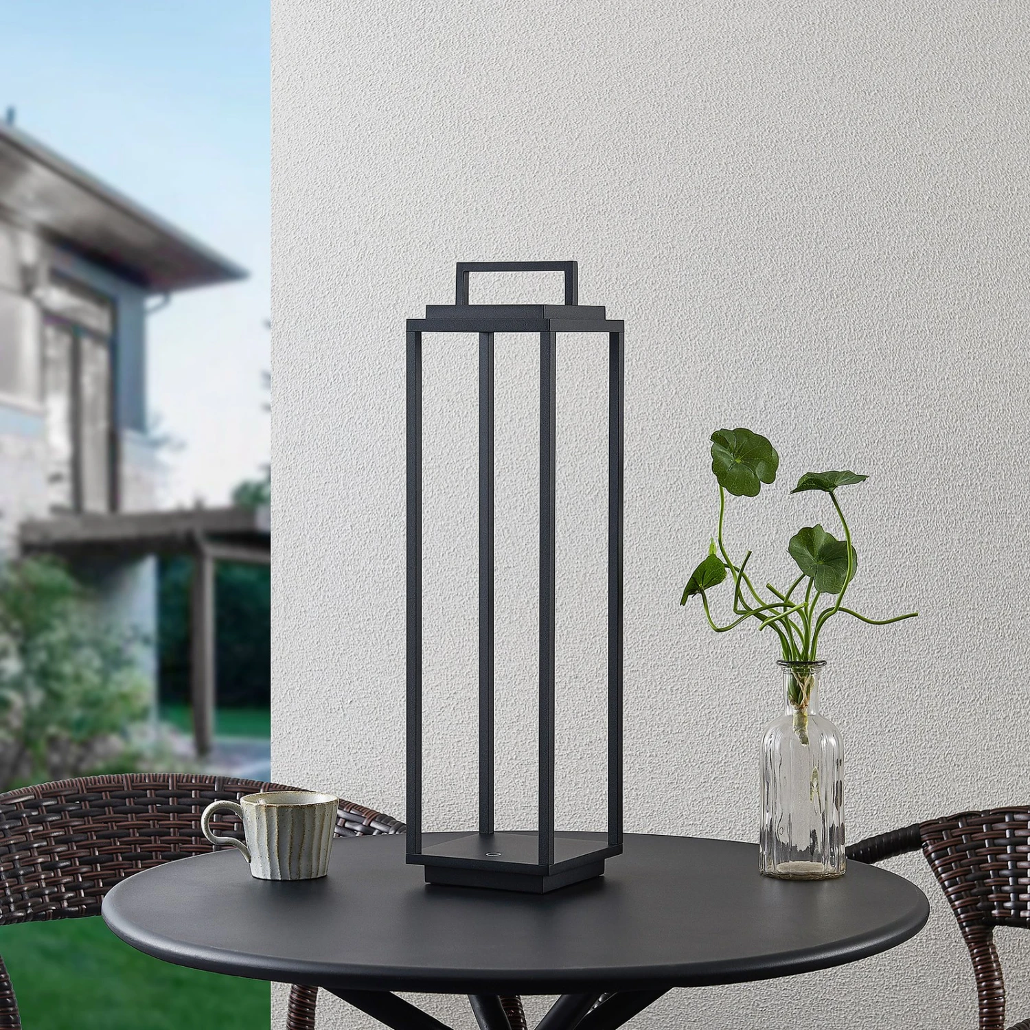 Das Design ist modern und puristisch gehalten. Das Gehäuse besteht gänzlich aus Aluminiumdruckguss und wurde mit einem schwarzen Oberflächenfinish gestaltet. Ein praktischer Handgriff an der Oberseite erleichtert das Tragen. Das LED-Modul ist fest verbaut und gibt das warmweiße Licht nach unten ab, sodass eine Blendung ausgeschlossen ist. Elaja ist ein schöner Lichtspender und Dekorationsobjekt für Garten und Terrasse.