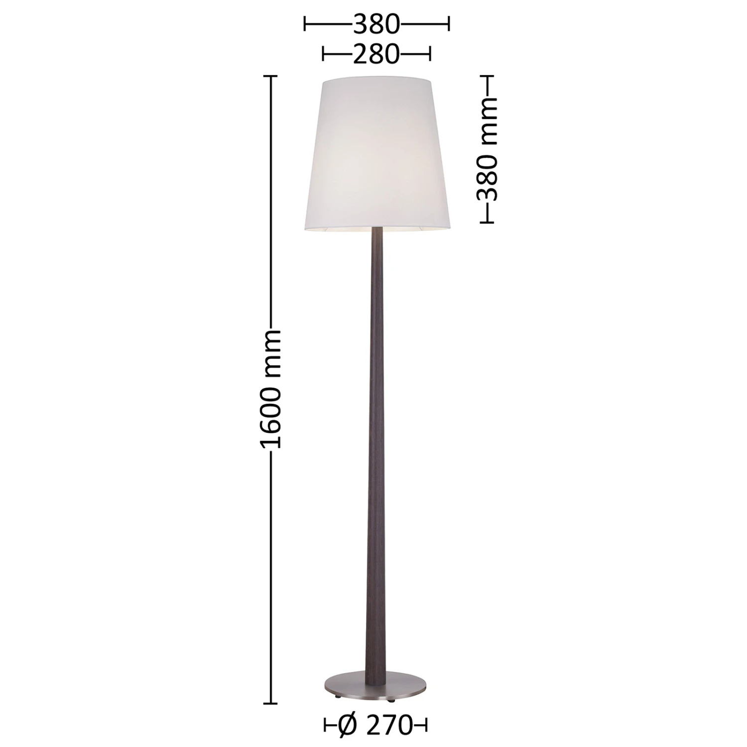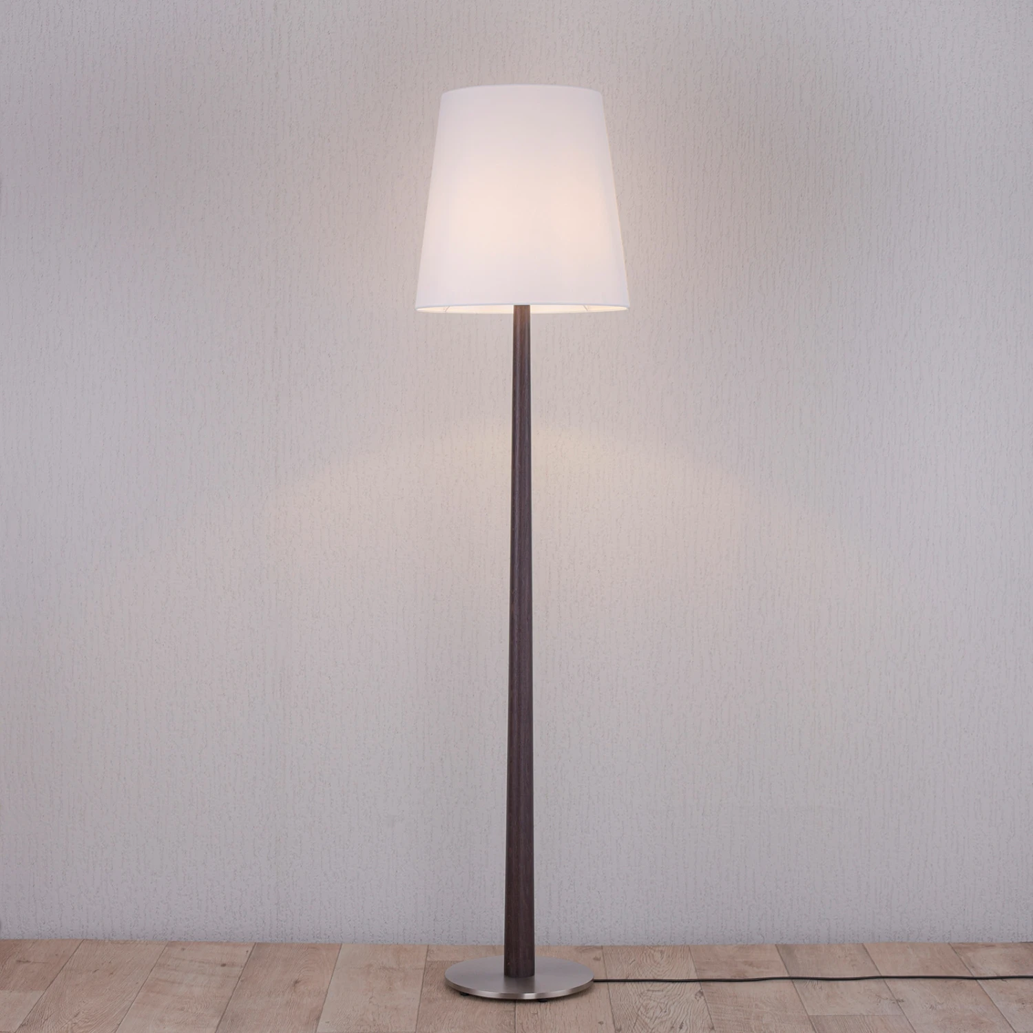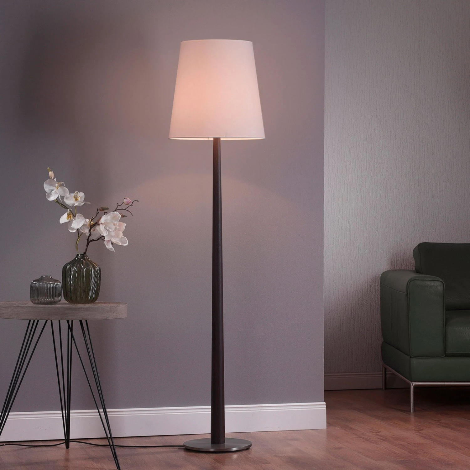 Die stilvolle Stehleuchte Elif überzeugt direkt auf den ersten Blick: Mit ihrem konisch geformten Holzfuß, der aus massiver Eiche kolonial besteht, und dem ebenfalls konischen Lampenschirm in Weiß ist ein harmonischer Kontrast von Hell und Dunkel geschaffen, der stilvoll und elegant jeden Wohnraum aufwertet. Das Holz wurde hierbei in aufwändiger Handarbeit bearbeitet und gefertigt. Für die Stabilität der Leuchte sorgt ein passender, runder Stahlsockel in Nickel matt.