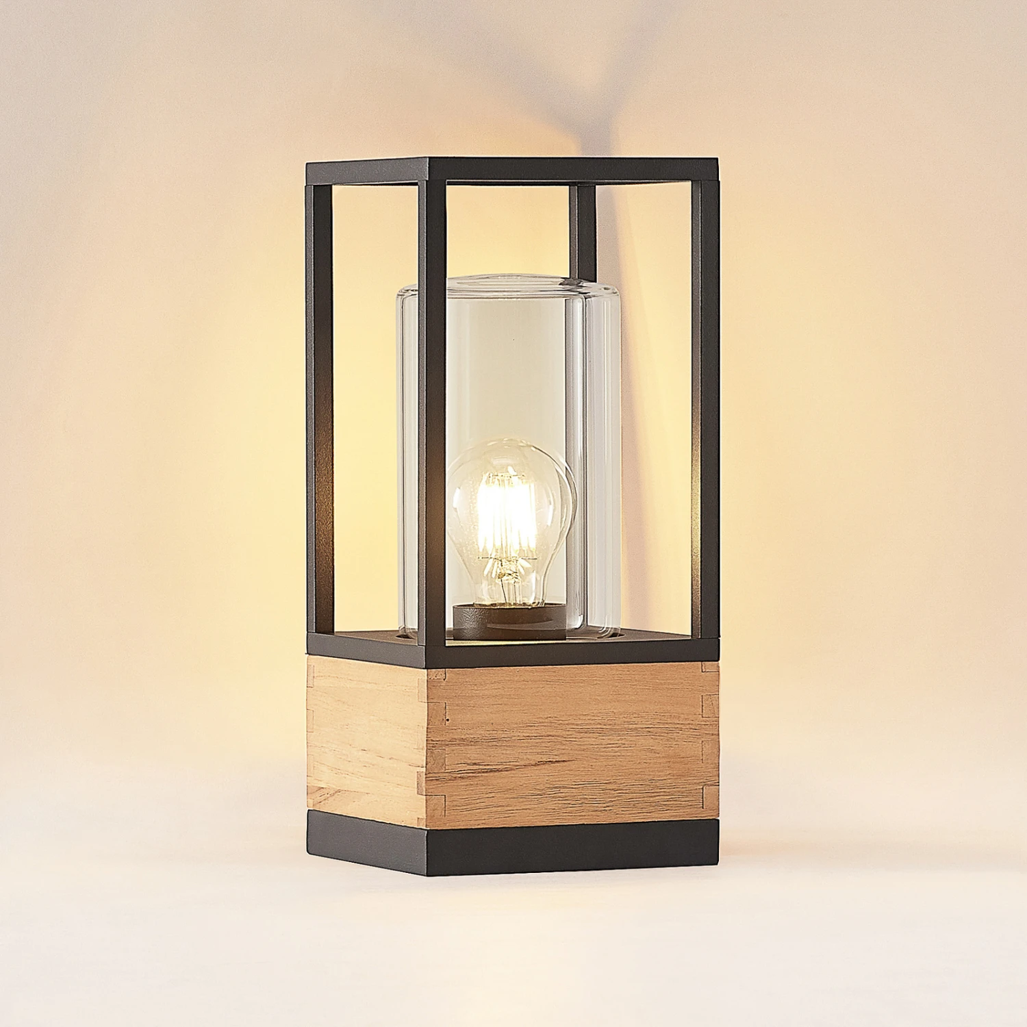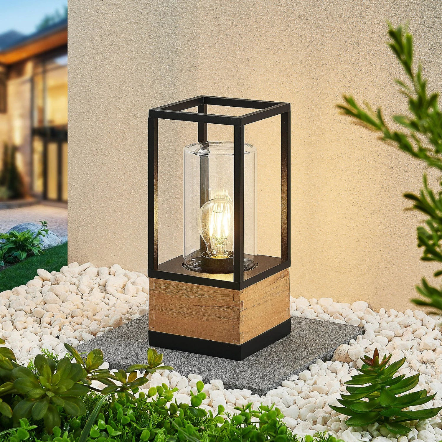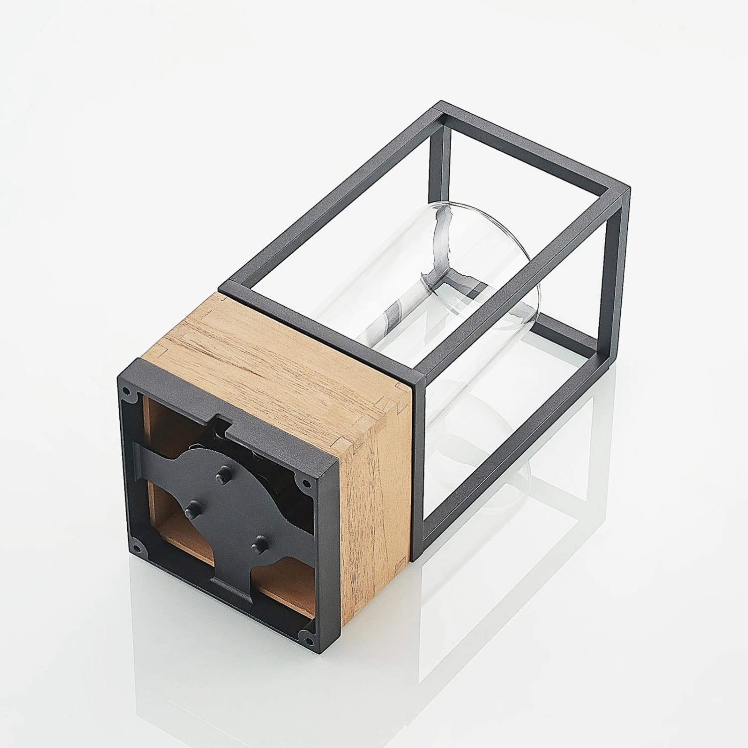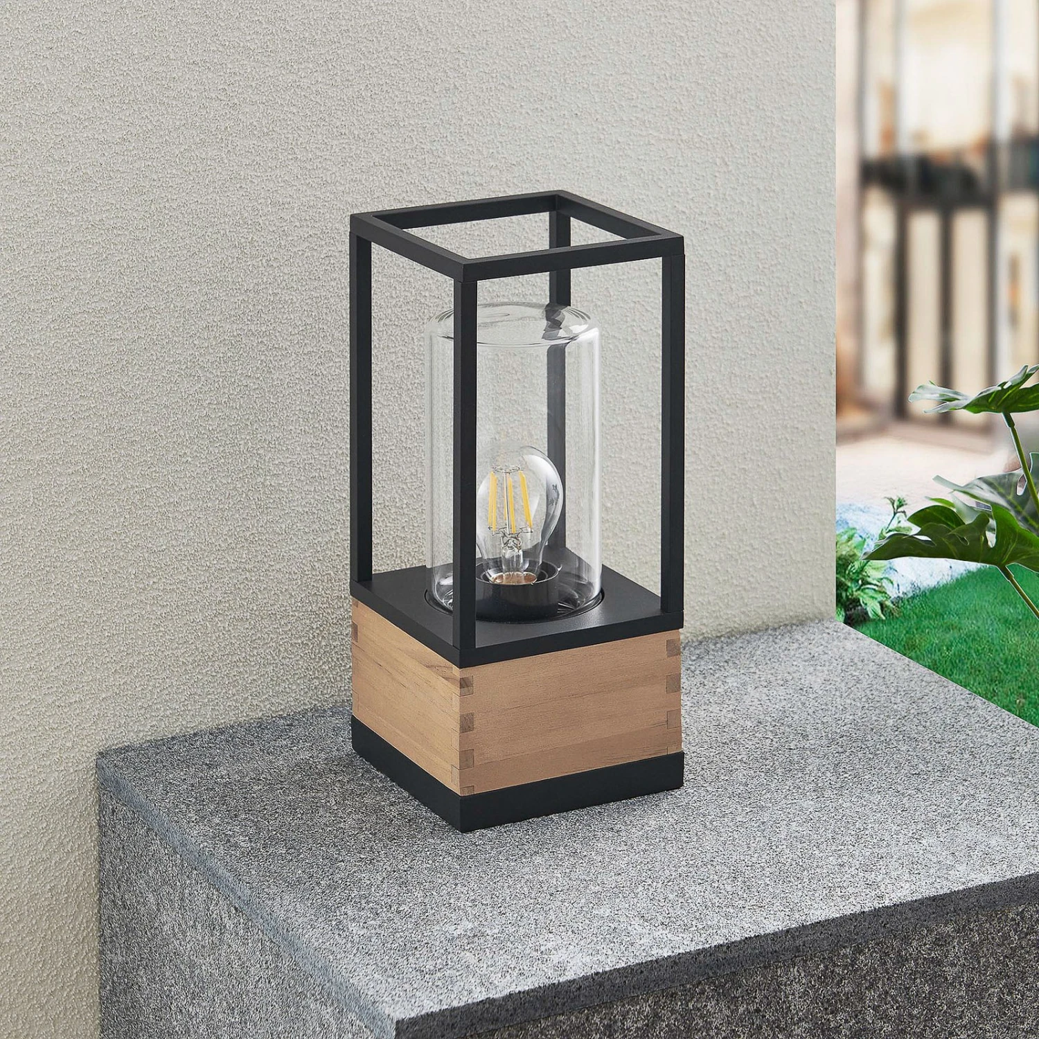 Eckige Außendeckenleuchte Enjan aus Aluminium und Teakholz