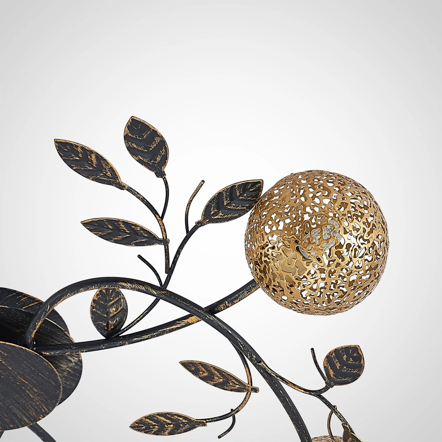 Die orientalische Note bekommt die Leuchte durch die kugelförmigen Lampenschirme verliehen. Diese bestehen aus Metall und sind in Gold gehalten. Das Besondere an den Schirmen ist das feine Muster, welches sich durch Aussparungen im Metall ergibt. Dieses Muster erinnert an Leuchten aus dem Orient und gleichzeitig sorgt es für romantische Lichtspiele, die Schatten und Licht zu einem kunstvollen Ganzen vereinigen.
