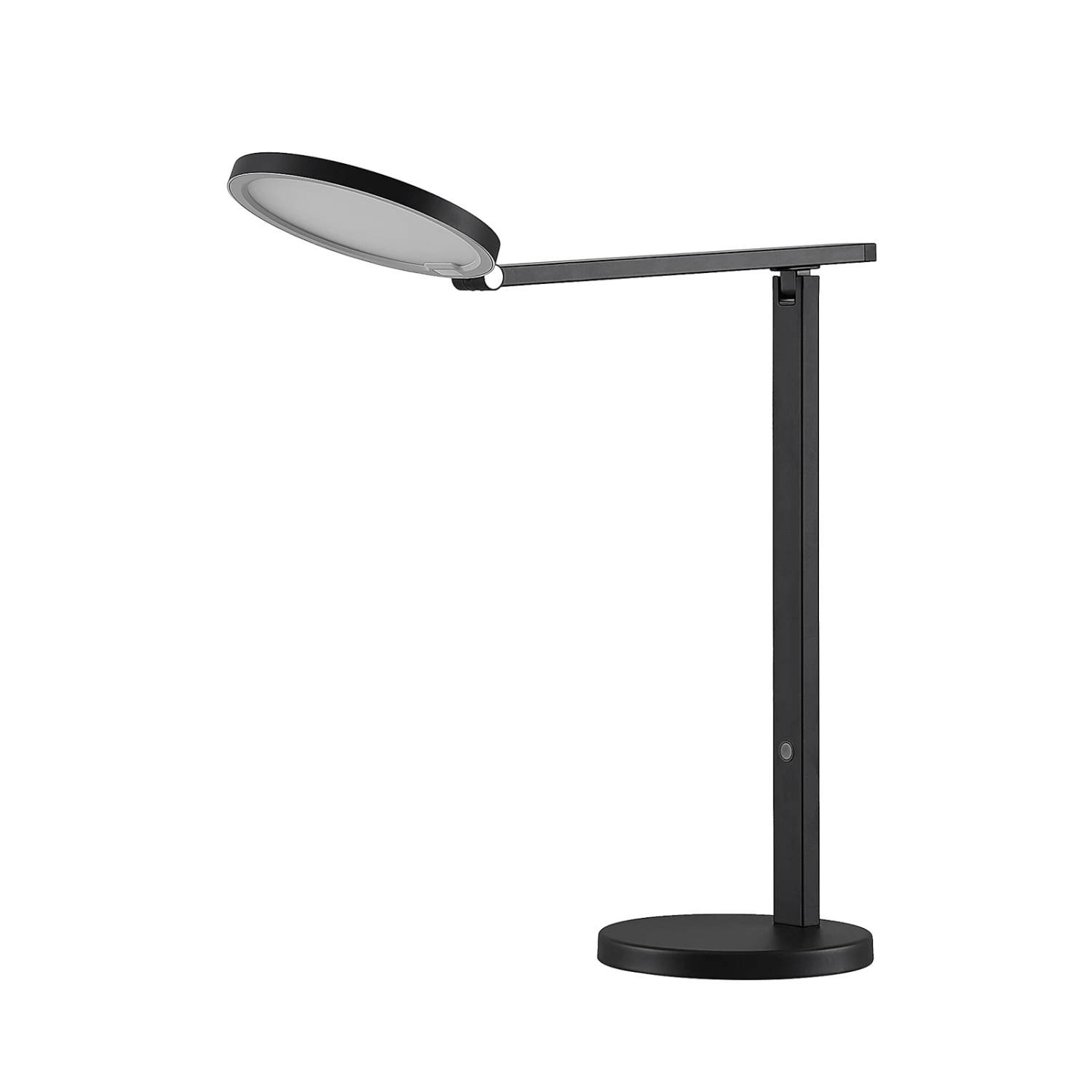 Diese schöne Leuchte präsentiert sich in einem modernen und schlanken Design. Das Gestell besteht aus Stahl und ist sehr gradlinig geformt. Als Kontrast wurden der Leuchtenschirm und der Leuchtenfuß rund gestaltet. Das schwarze Oberflächenfinisch fällt auf und verleiht der Leuchte einen seriösen Eindruck.