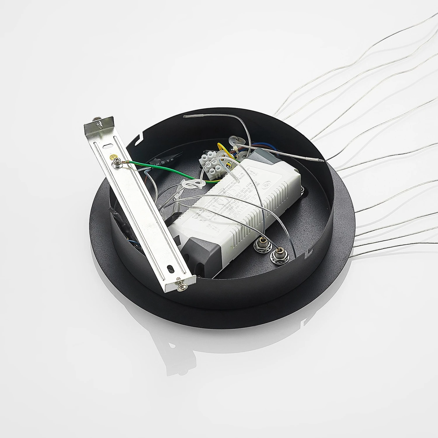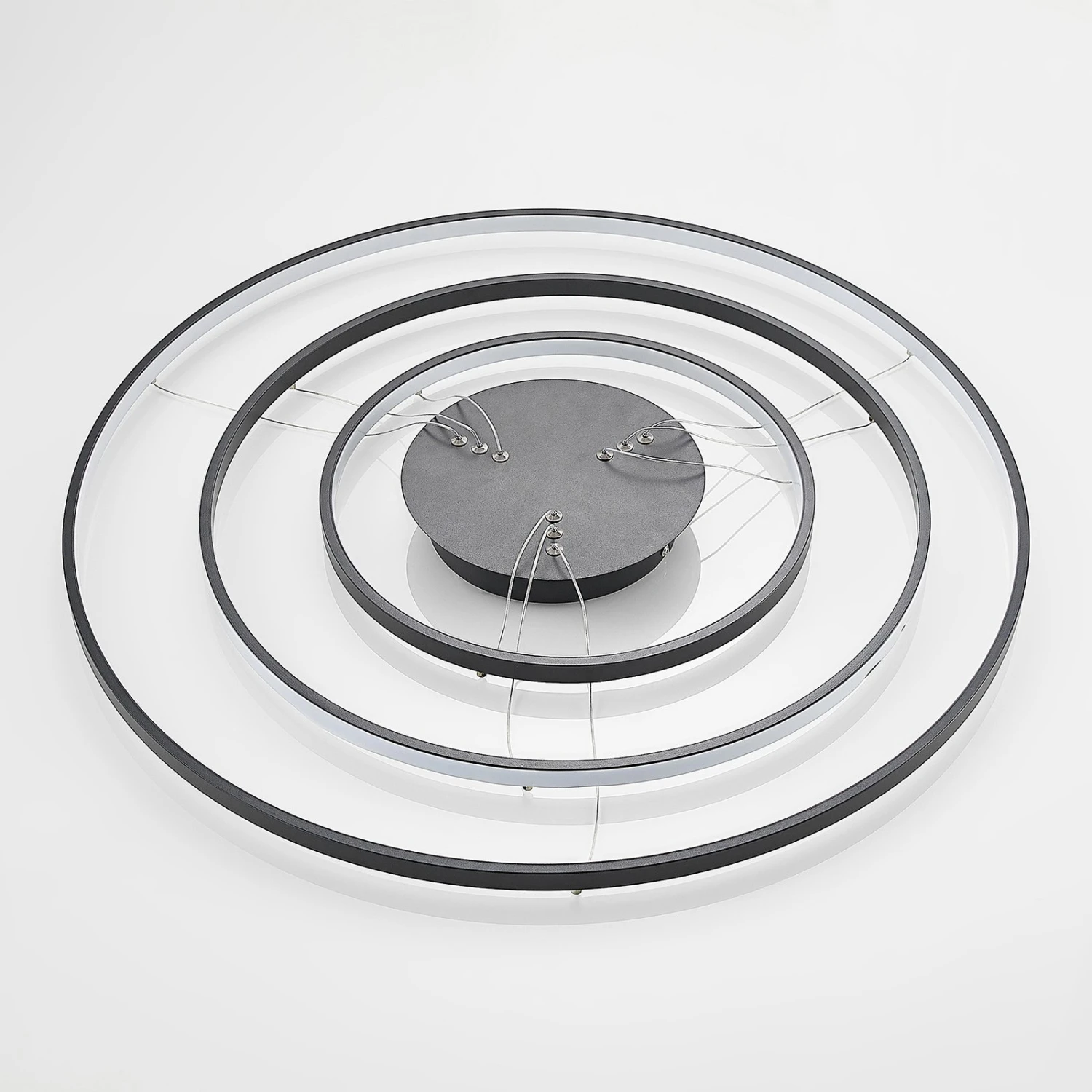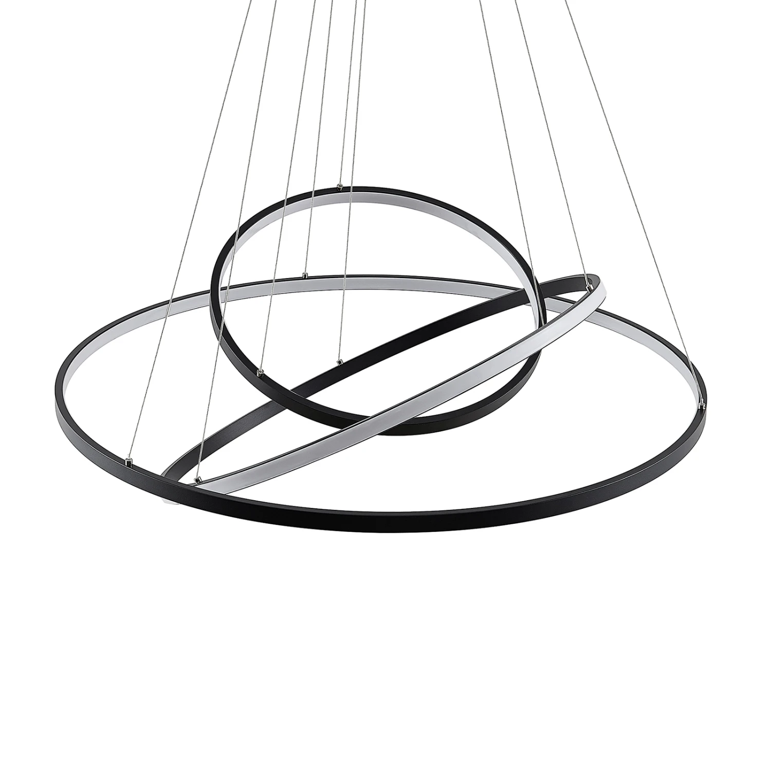 Drei schmale Ringe unterschiedlicher Größen aus Aluminium mit mattschwarzer Lackierung hängen vom runden Baldachin der LED-Hängeleuchte Filippa in schöner Anordnung herab. Sie sind an ihren Innenseiten mit LEDs bestückt, die hinter den weißen Abdeckungen aus Silikon sitzen und dadurch ein sehr homogenes Licht abstrahlen. Die LED-Hängeleuchte Filippa spendet ein angenehm warmweißes Licht, das in der Helligkeit über den Wandschalter reguliert werden kann. Durch mehrmalige Betätigung des Wandschalters lässt sich die Helligkeit der Leuchte in drei Stufen schalten (100 %, 60 % oder 10 %), der nächste Schaltvorgang schaltet aus.