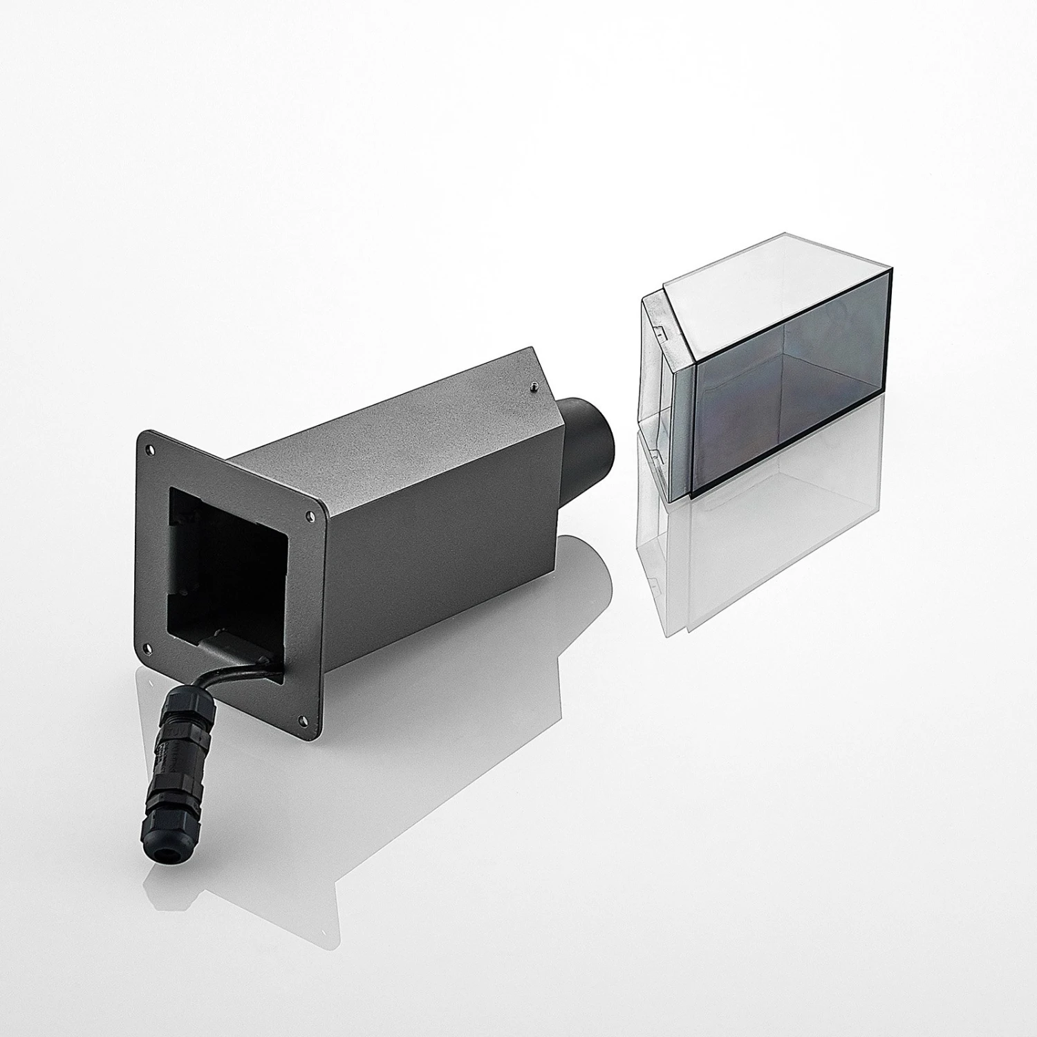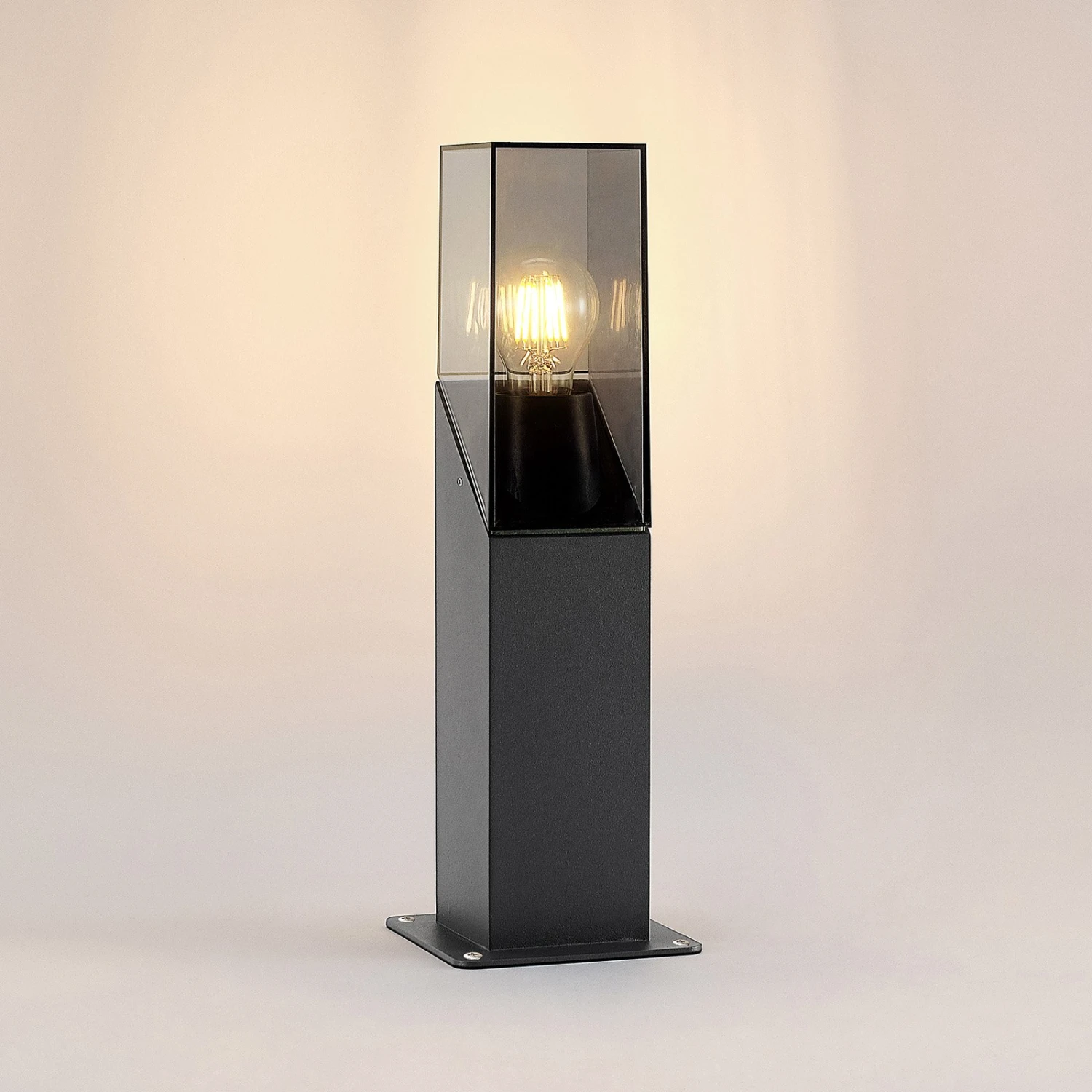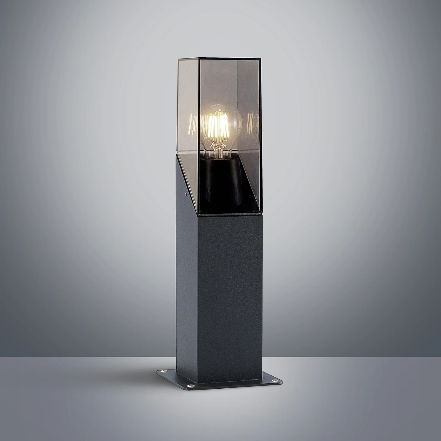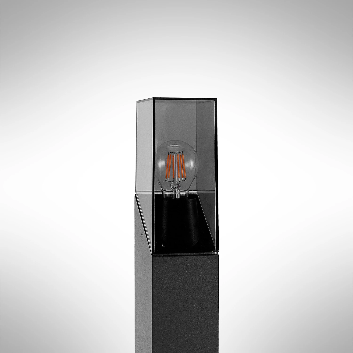 Die geometrische Form der Sockelleuchte Fiola und der besondere Lampenschirm fallen dem Betrachter dieser Außenleuchte sofort ins Auge. Die Sockelleuchte besteht aus einem eckigem Korpus, der aus dunkelgrauem Aluminium gefertigt ist. Auf der abgeschrägten Oberseite ist die Fassung für das Leuchtmittel angebracht, welche mit einem transprarentem, leicht rauchgrauem Kunststoff umschlossen ist. Idealerweise wird hier ein dekoratives Filament- oder Retrofit-Leuchtmittel verwendet, welches den modernen Look der Sockelleuchte Fiola unterstreicht.