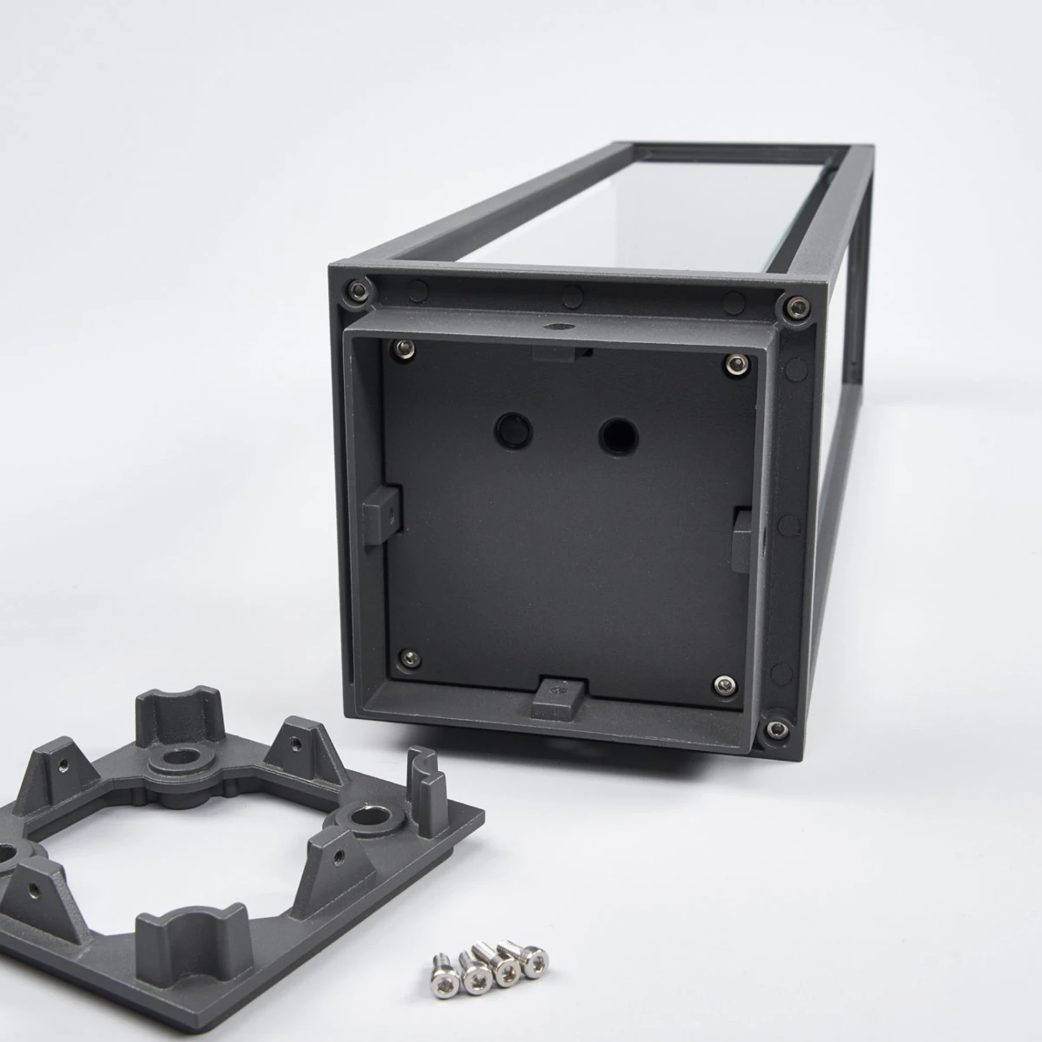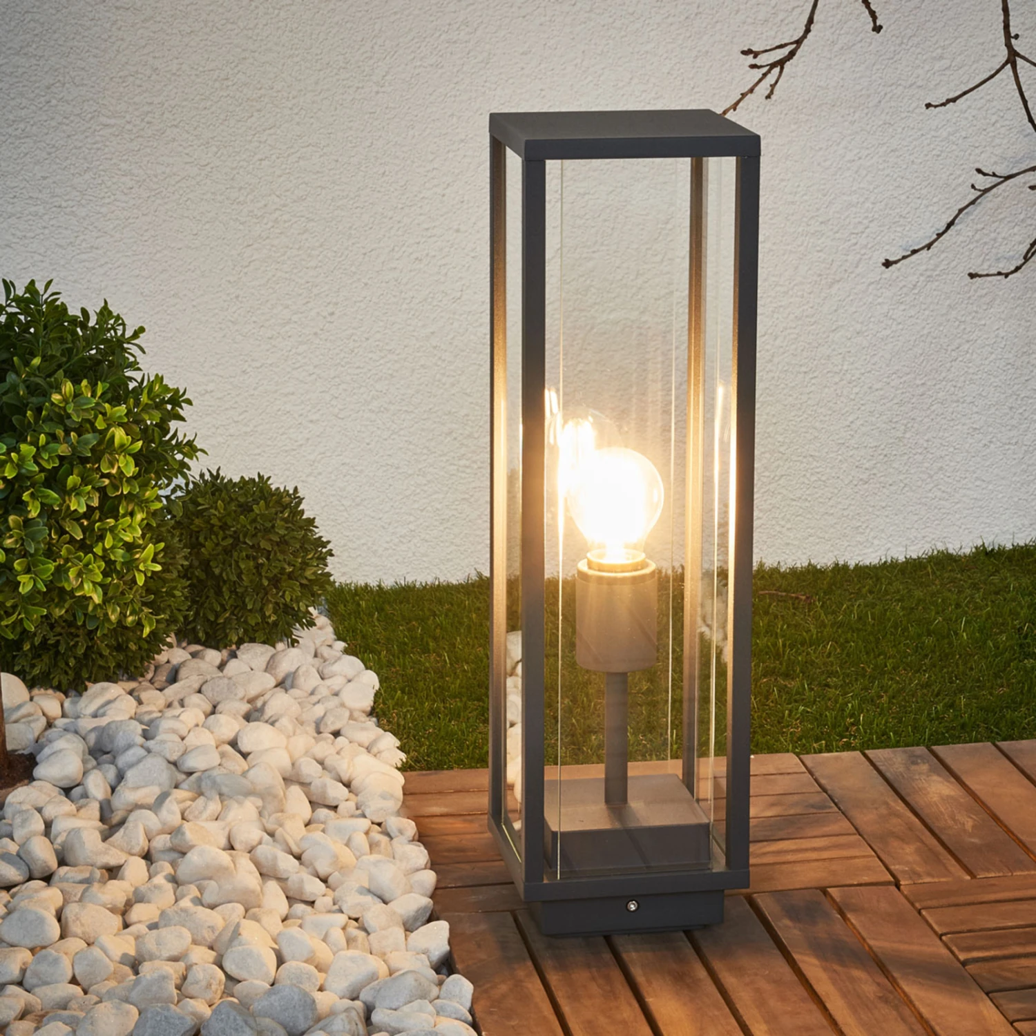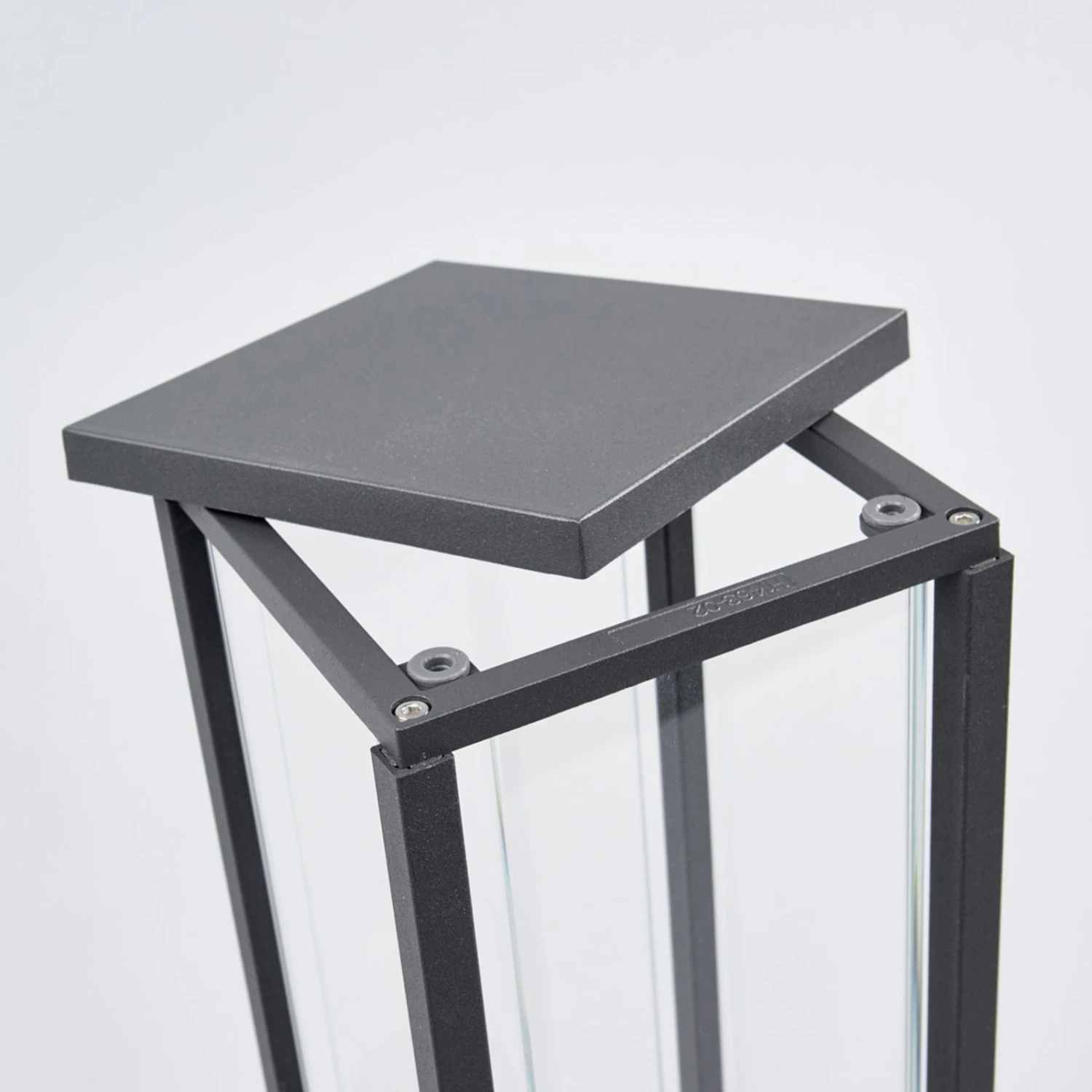 Das dunkelgraue Gestell aus Aluminium ist in eckiger Form gehalten und erscheint aus diesem Grund sehr modern. Glaseinsätze mit klarer Oberfläche ergänzen die Metallelemente und sorgen für einen klaren Durchblick, so dass nichts von der Leuchtkraft der verwendeten Lampe verloren geht.