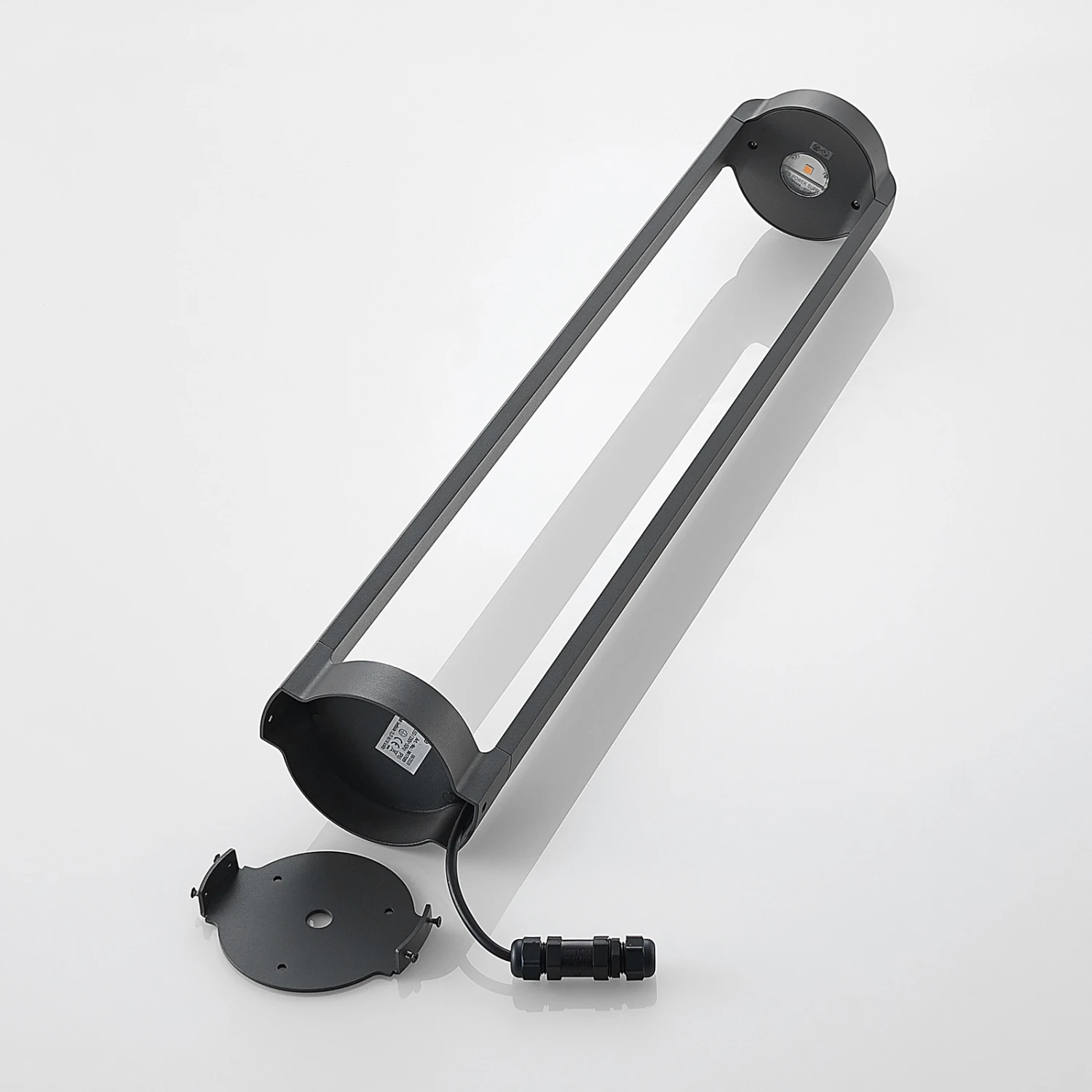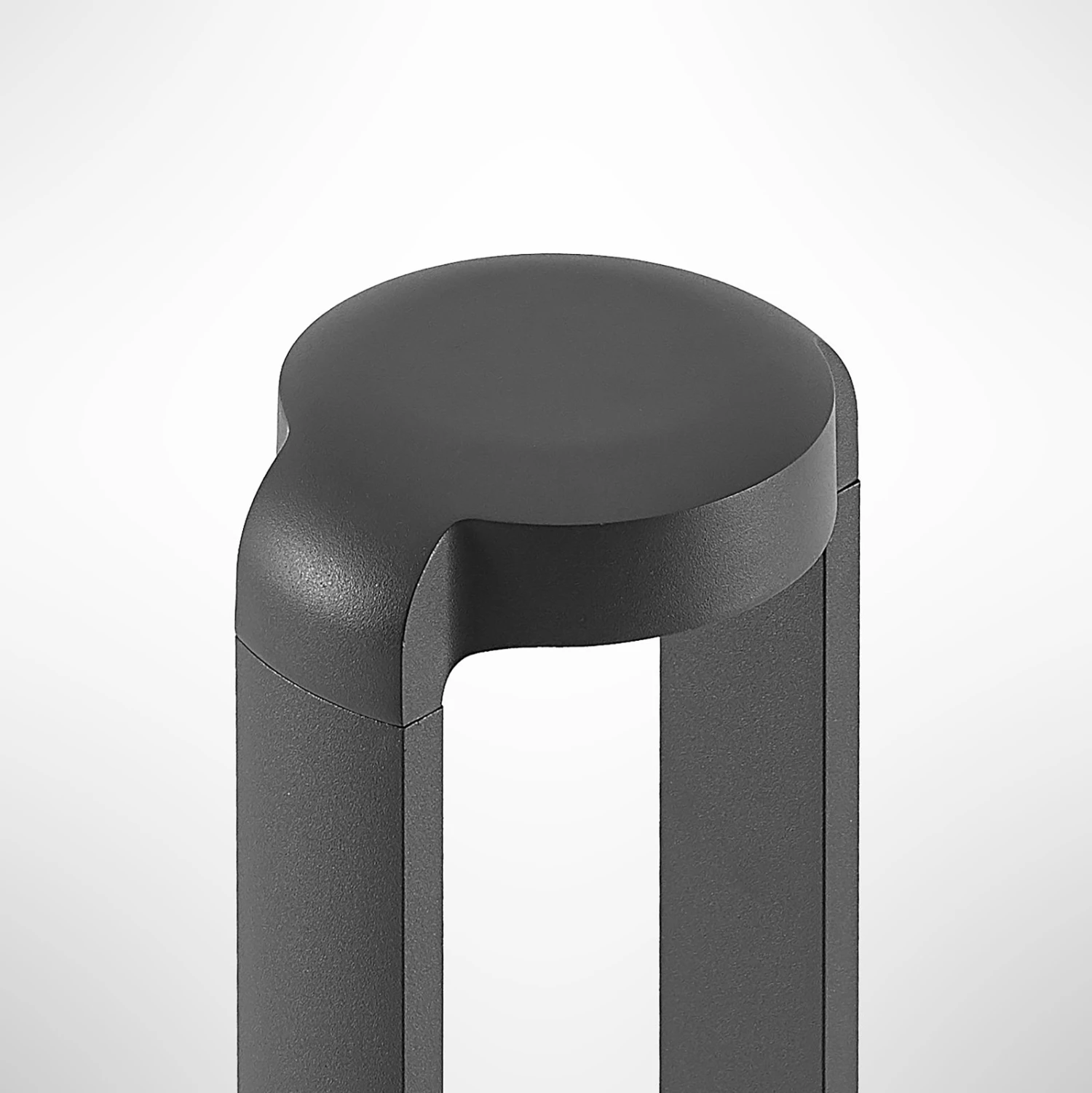 Das Gehäuse der modernen LED-Wegeleuchte Habsa ist aus dunkelgrauem Aluminiumdruckguss hergestellt, der innen offen gestaltet ist. Er besitzt zwei Pole, ein Sockel unten und der Schirm auf der Oberseite, der im Innern die LED-Technik beherbergt, die seitlich miteinander verbunden sind. Das warmweiße Licht der LEDs strahlt dabei nach unten und in die offene Fläche hinein, sodass die Umgebung der LED-Wegeleuchte Habsa sehr gut ausgeleuchtet wird. Ideal für den Einsatz an Gartenpfaden, Zufahrtswegen oder im Bereich des Hauseingangs.
