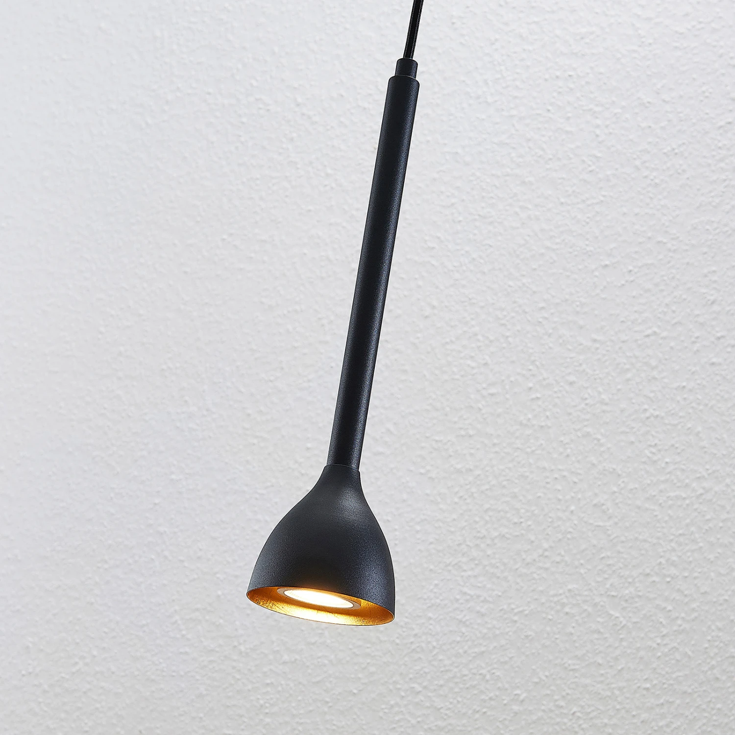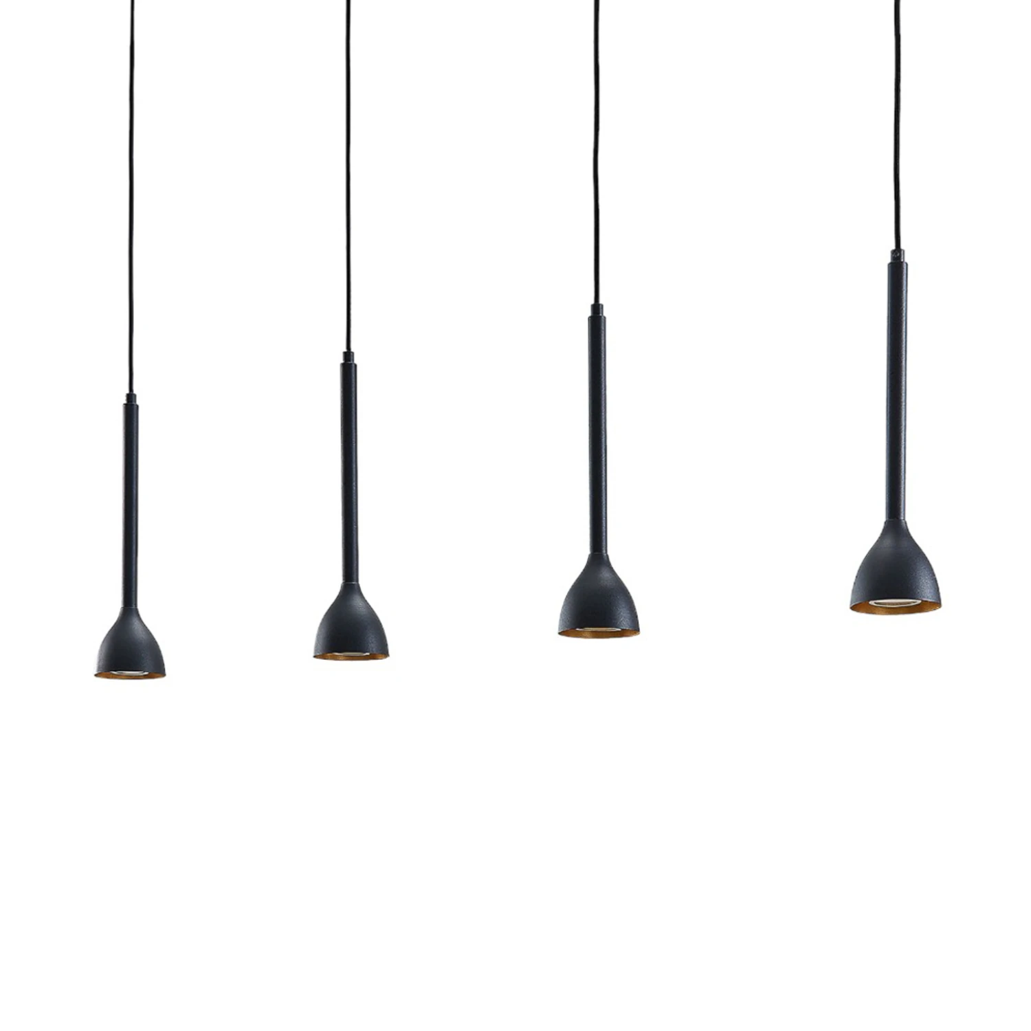 Nordwin lässt sich mit der länglichen Form und den vier Lichtquellen hervorragend über einem Essplatz oder einem Tresen anbringen. Die Schirme sind schmal und kompakt gebaut, lediglich nach oben hin nehmen sie einen gewissen Raum ein und wirken schmal und länglich, bis sie in den Abhängungsseilen münden. Außen ist jeder Schirm wie auch das Deckengestell in mattem Schwarz gehalten, die Innenseite hingegen wurde mit einem Goldfolienfinish versehen, das sich wunderbar auf die Lichtwirkung auswirkt und ein ganz warmes, gemütliches Licht abstrahlt.