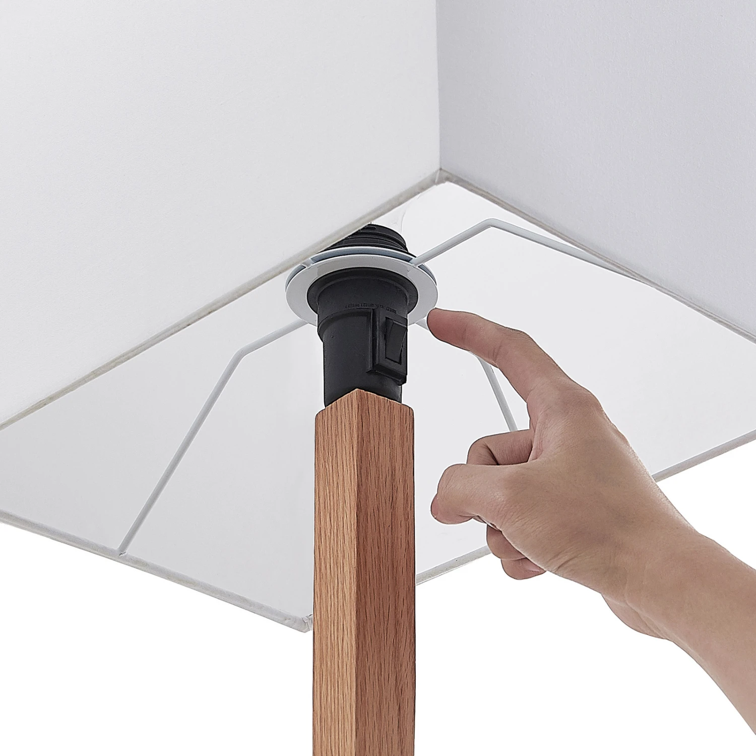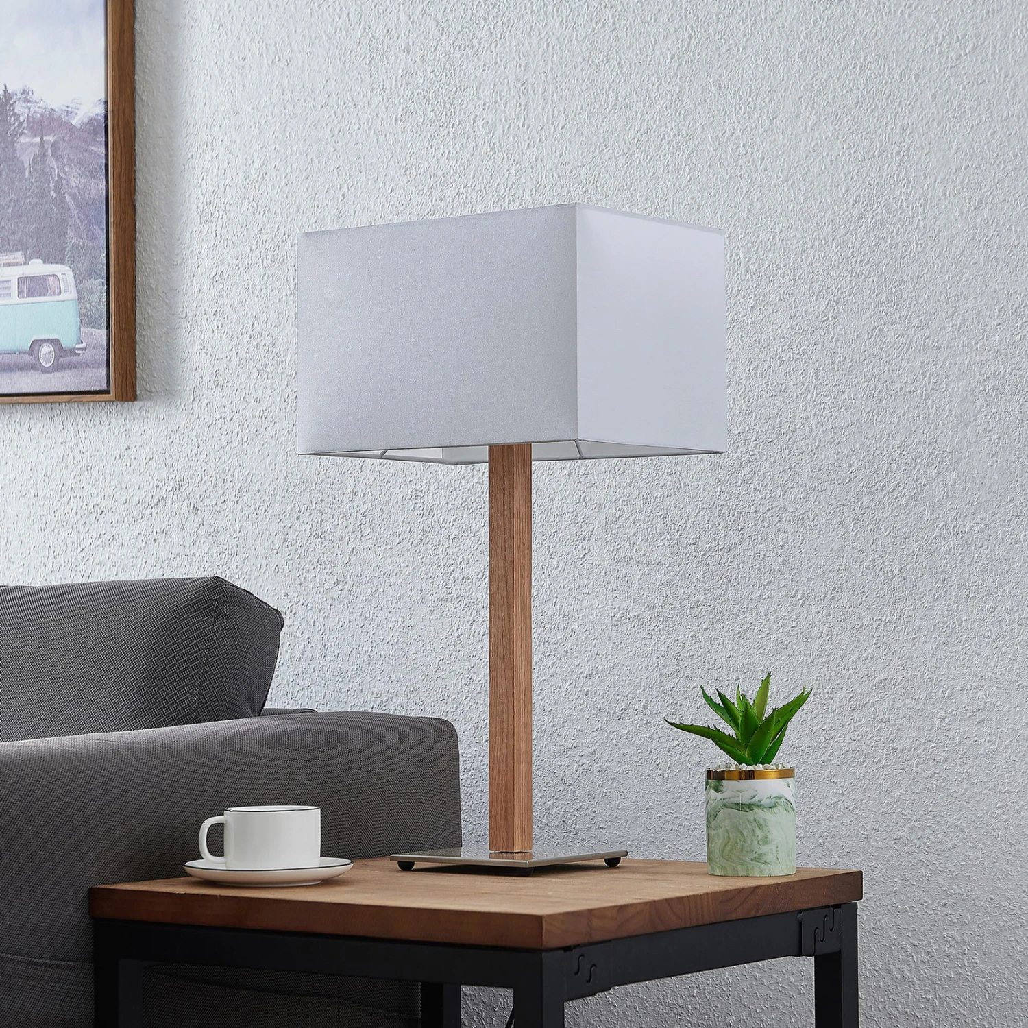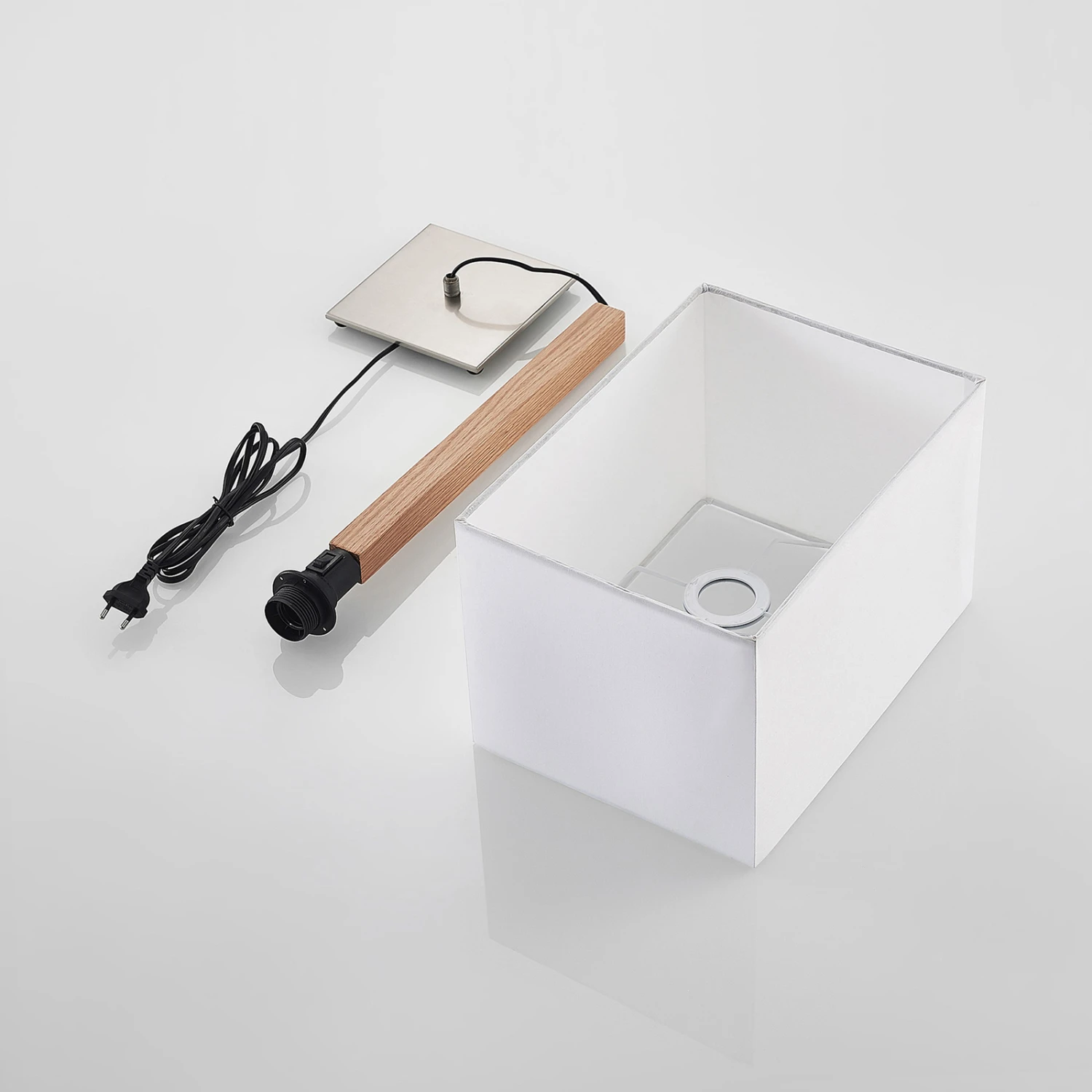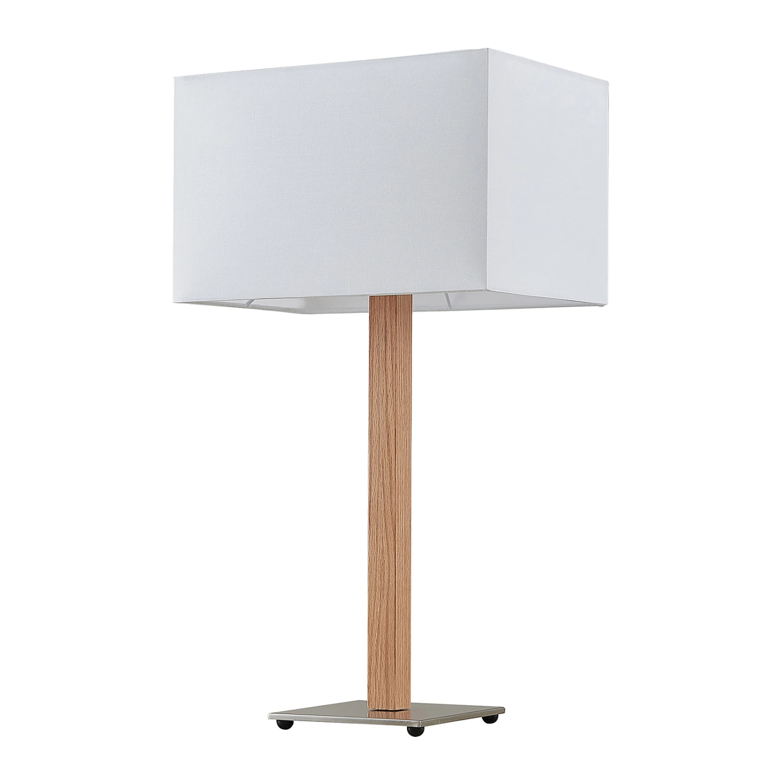 Tischleuchte Heily mit eckigem Textilschirm und hölzernem Bein