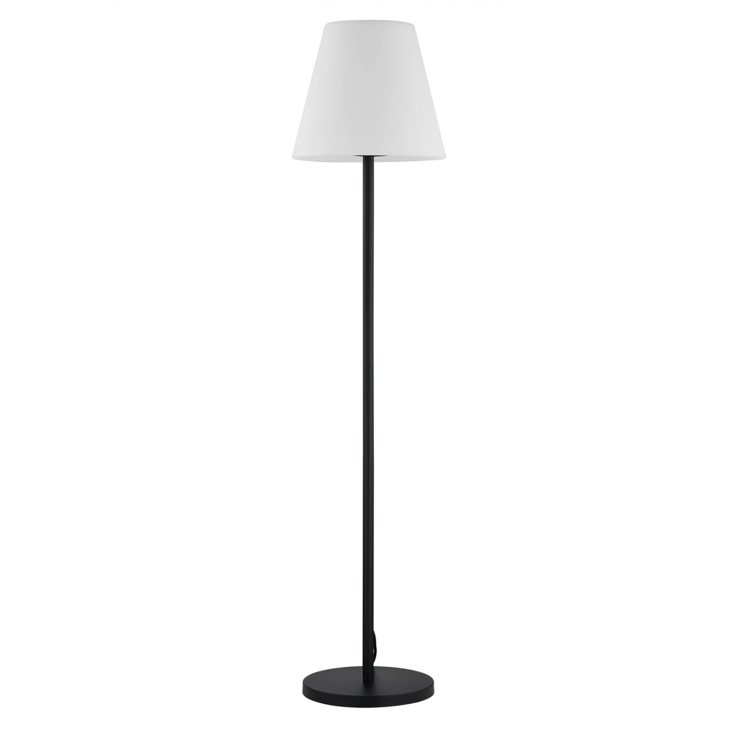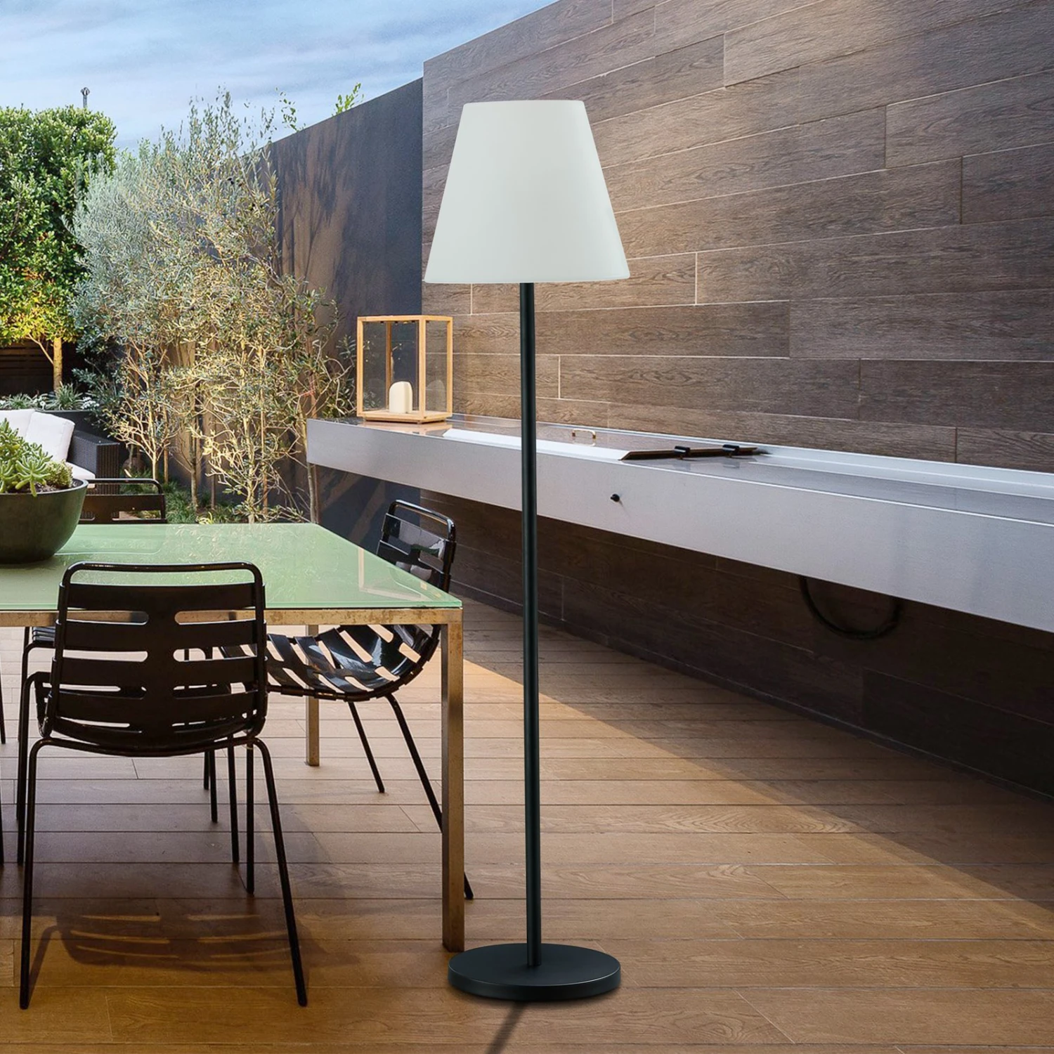 Schlanke Terrassenleuchte Jaimy mit weißem Leuchtenschirm