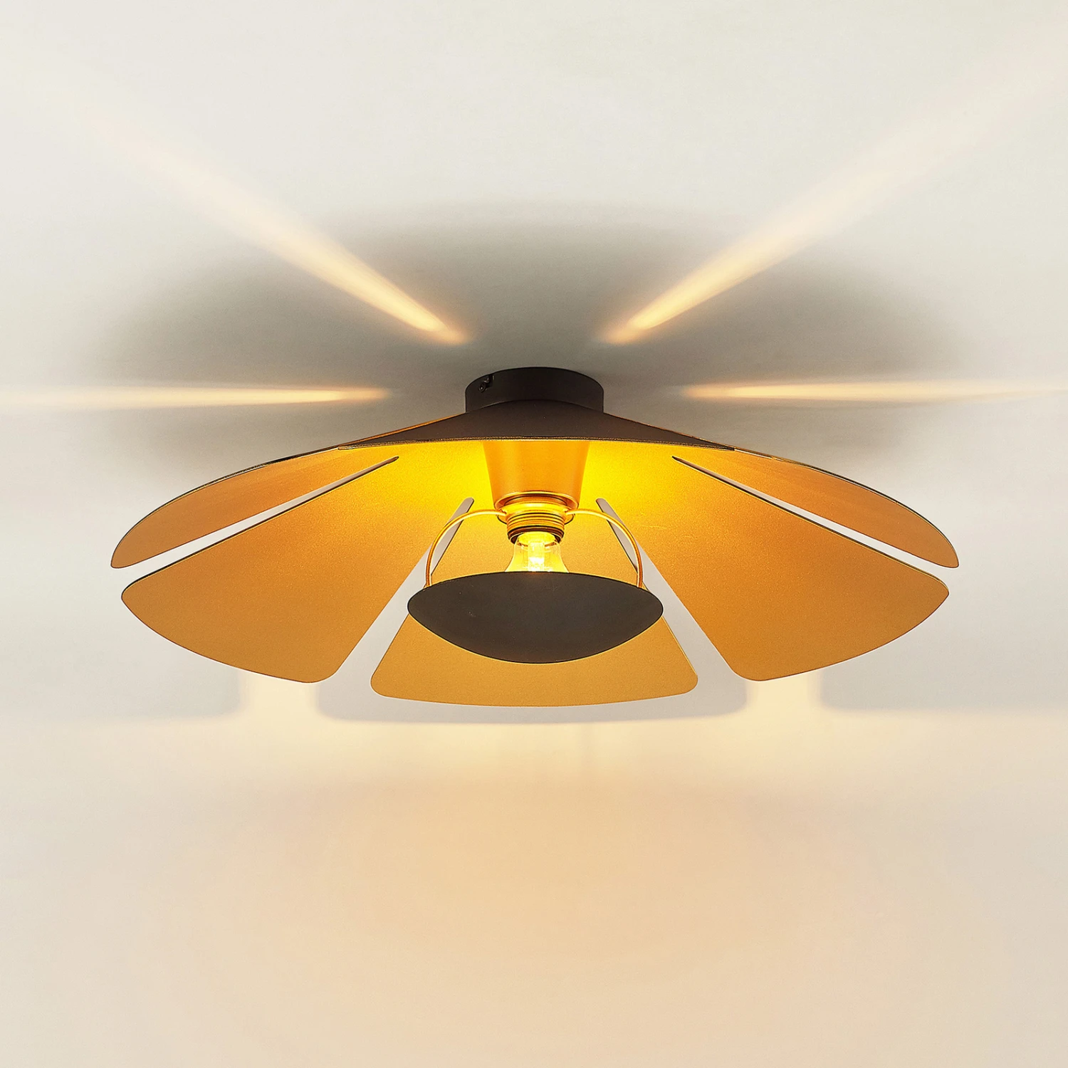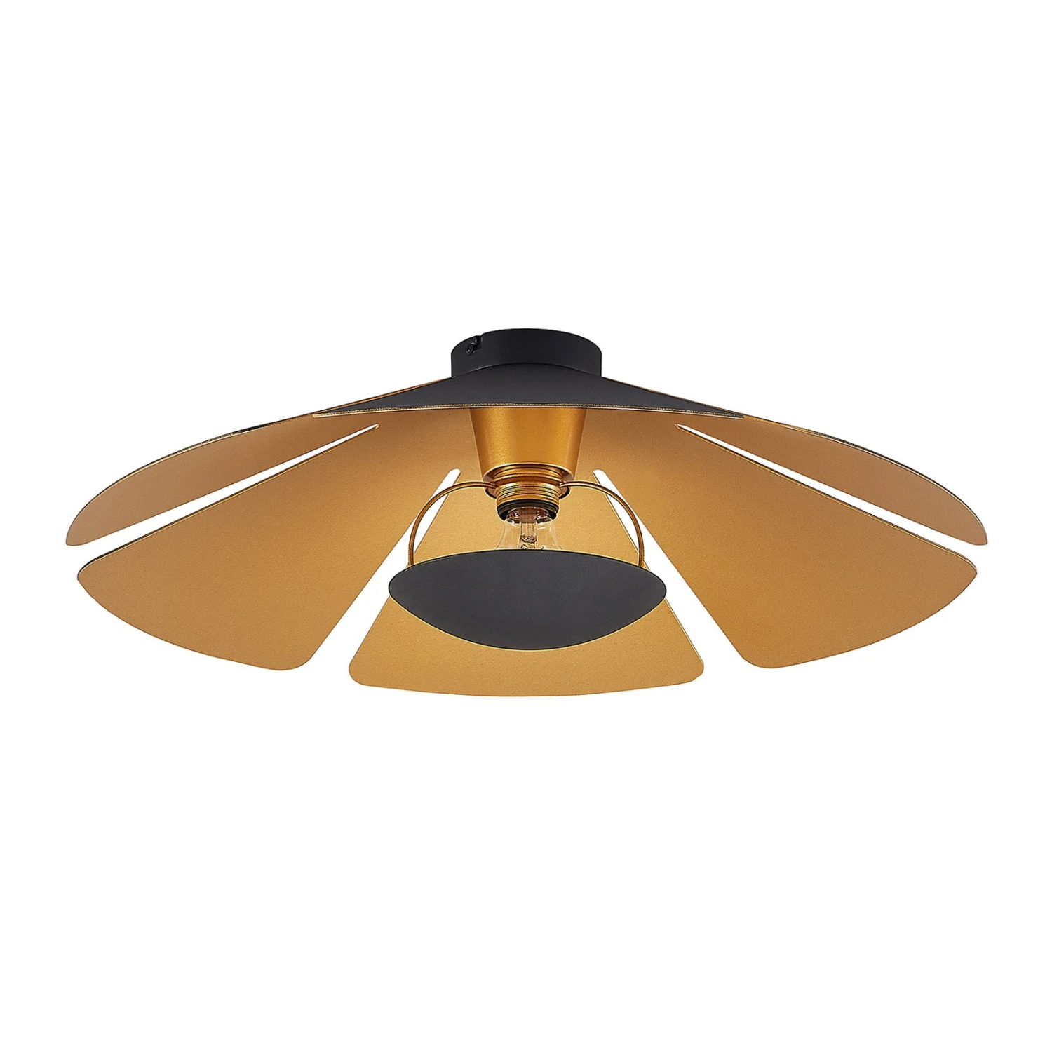 Die formschöne Deckenlampe Jemmily setzt tolle Lichtakzente und verleiht dem Zuhause eine besondere Note. Die Lampe ermöglicht es, die Helligkeit mit einem externen Dimmer ganz nach eigenen Wünschen einzustellen, und ist für die Aufnahme von Leuchtmitteln mit einer E27-Fassung geeignet. Die in den Farben Schwarz und Gold gehaltene Deckenlampe ist eine Bereicherung für den Essbereich, das Wohnzimmer oder die Diele. Das Modell Jemmily hat eine runde Form. In gewohnter Qualität der Marke Lucande begeistert es mit einem überzeugenden Wohngefühl und gut durchdachter Gestaltung. Diese Deckenlampe versprüht eine wunderbare Stimmung.