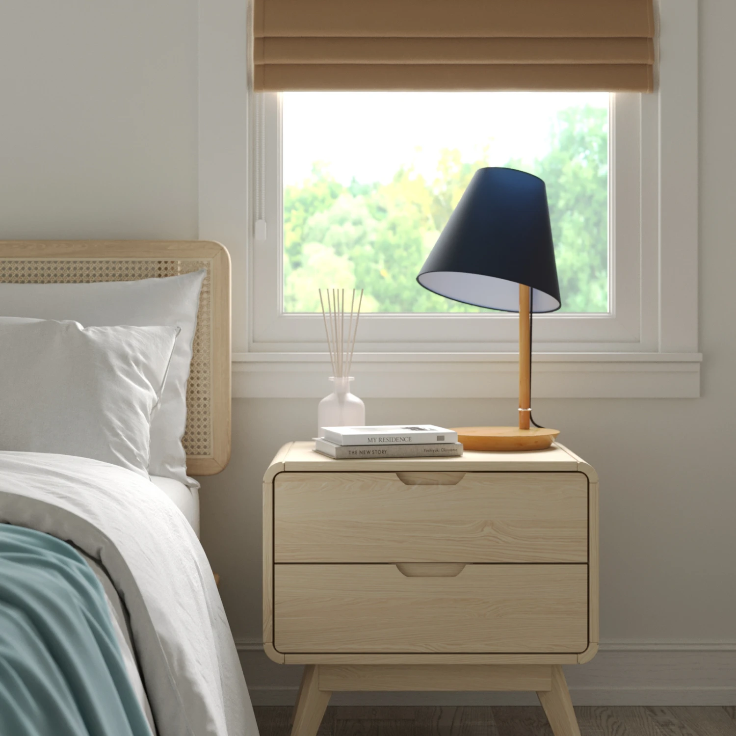 Blaue Tischlampe Jinda mit Holzgestell und Stoffschirm – perfekt für ein gemütliches Ambiente