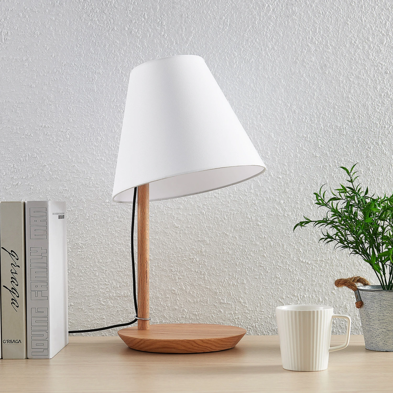 Weiße Stofftischlampe Jinda mit Holzfuß – skandinavischer Stil für gemütliche Stunden