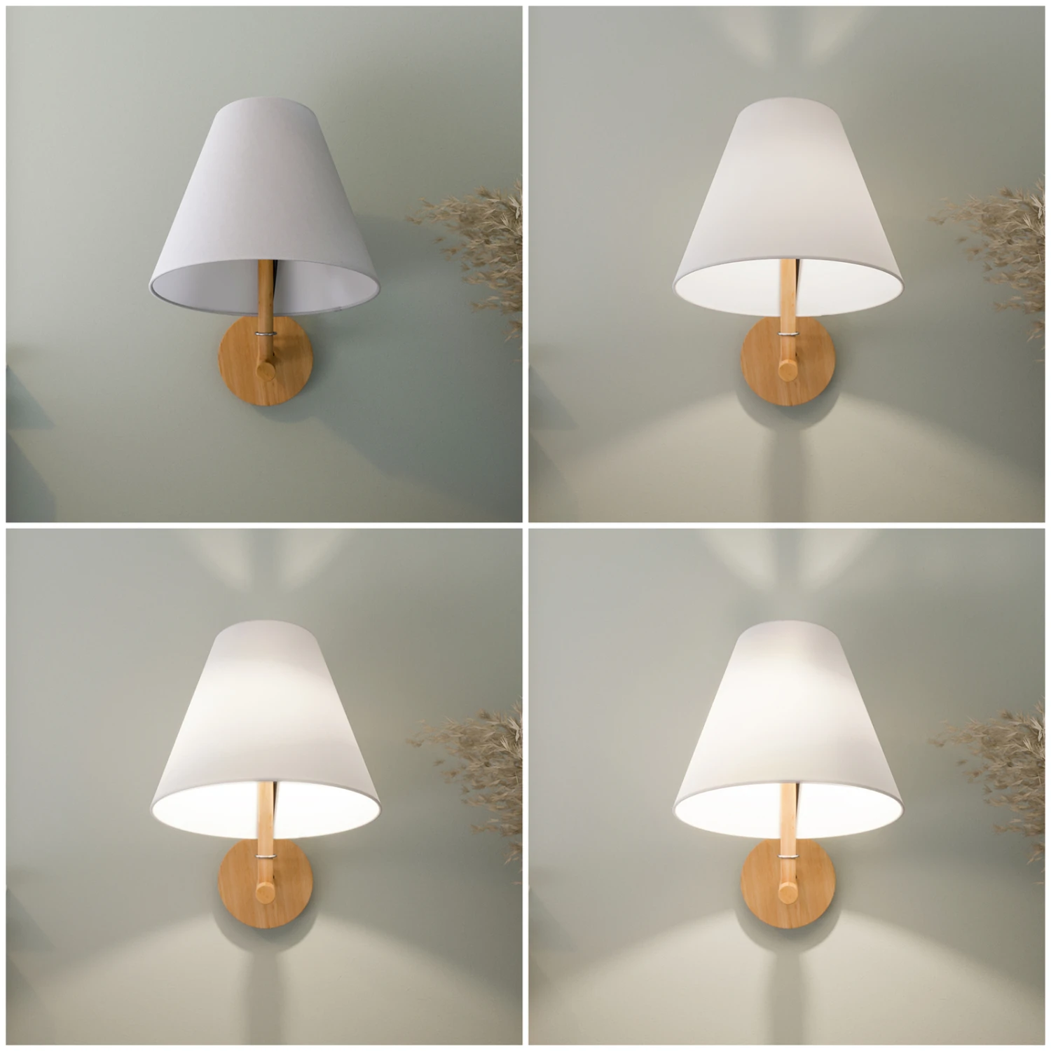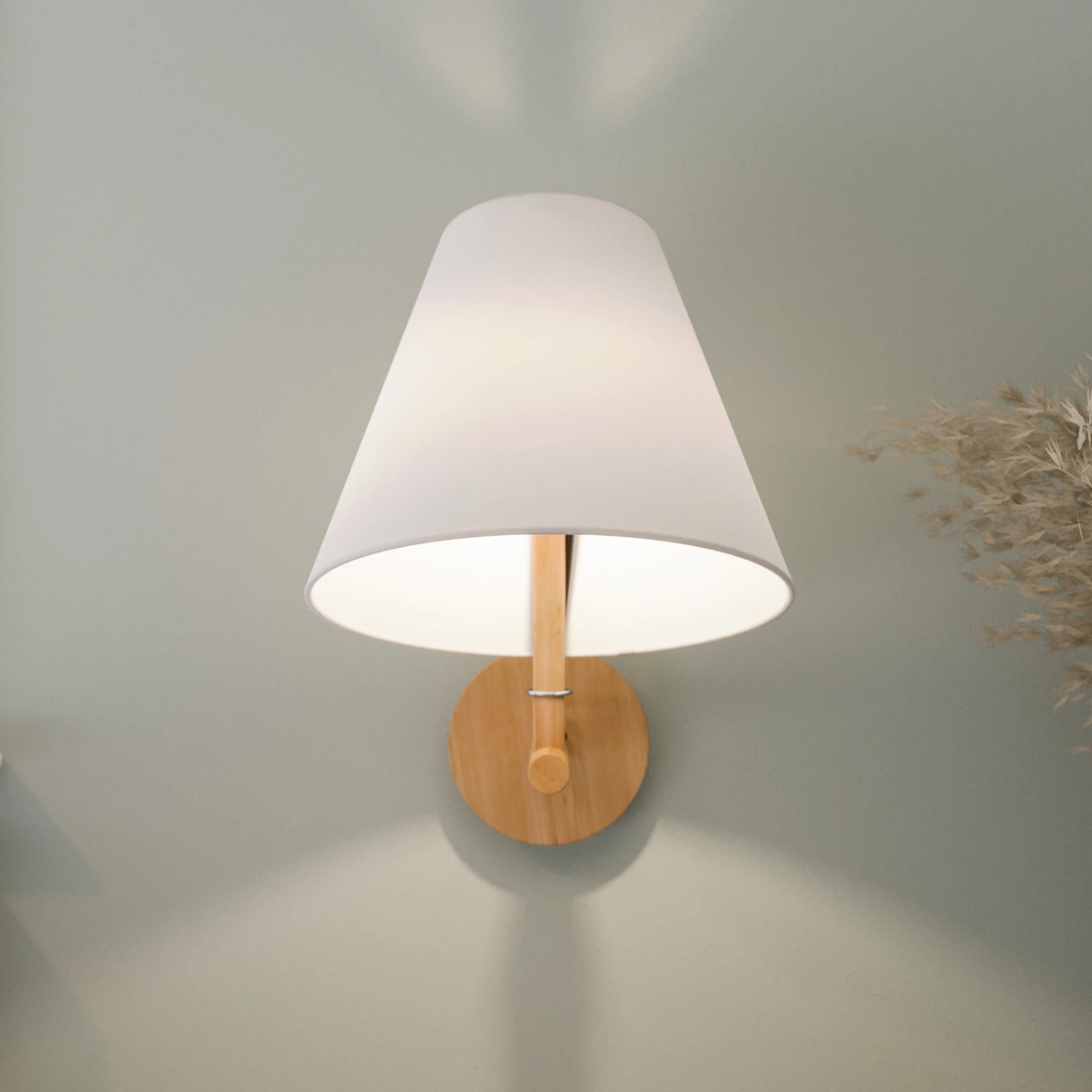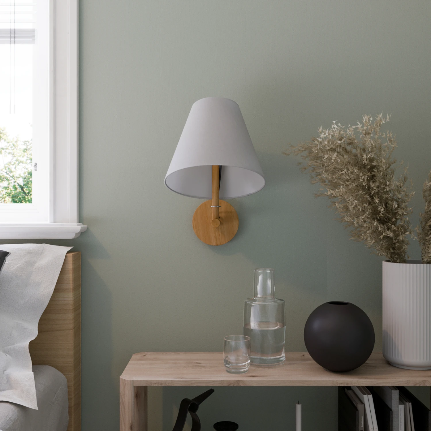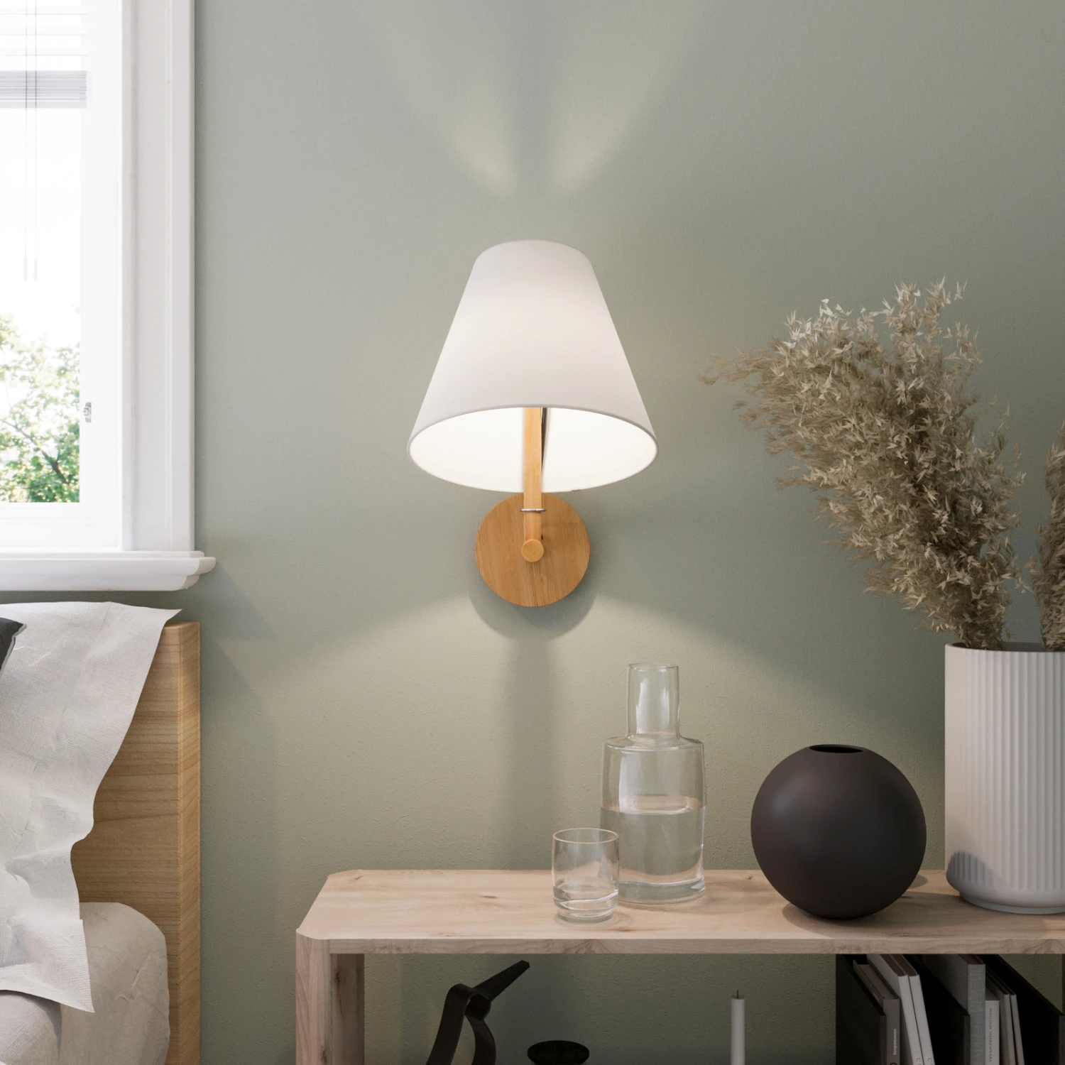 Skandinavische Optik mit Holz und Stoff: die Wandleuchte Jinda mit weißem Textilschirm
