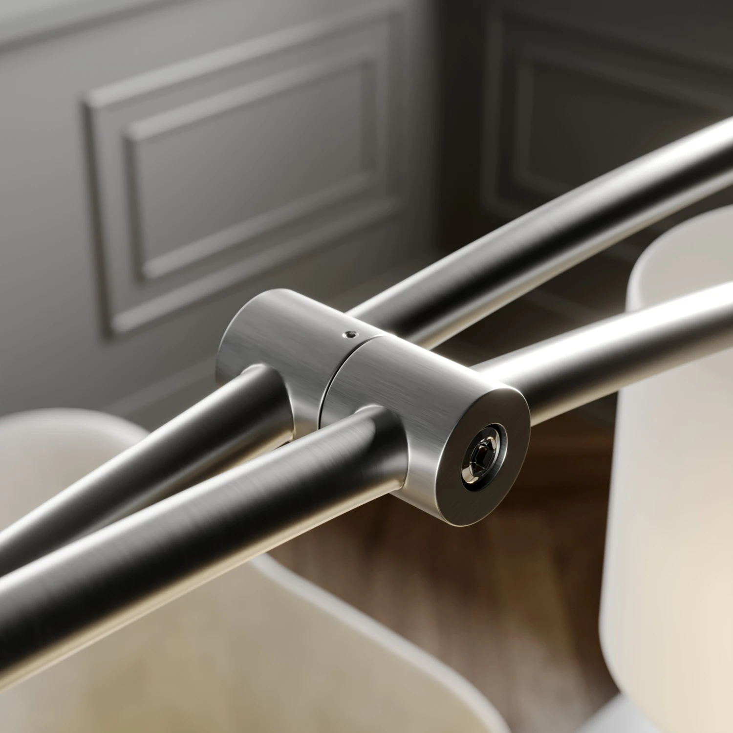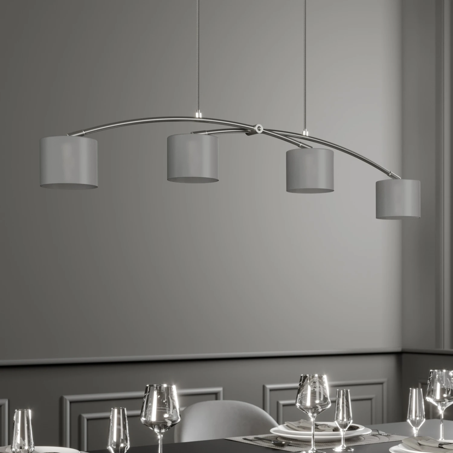 Juljana ist eine Pendelleuchte, die sehr gut über einen Esstisch passt mit der länglichen Form. Das Design, das opalweiße Glaschirme in zylindrischer, kompakter Form und satiniertes Metallgestell miteinander kombiniert, wirkt sehr elegant. Dabei ist es von einer gewissen Zeitlosigkeit geprägt und kann in vielen Räumen und Stilen eingesetzt werden. Die weiße Oberfläche des Glases verteilt den Lichtschein besonders gleichmäßig, so dass man nicht um die Gemütlichkeit im Raum fürchten muss, sondern im Gegenteil viel Behaglichkeit am Tisch erlebt, der zumeist weit mehr als nur der Ort der reinen Nahrungsaufnahme ist und immer auch von einer sozialen Komponente geprägt ist, weil Familien und Freunde hier zum Beisammensein und für den gemeinsamen Austausch aufeinandertreffen. Es sind feine, geschwungene Linien, die die Ausstrahlung dieser designorientierten Pendelleuchte in besonderem Maße kennzeichnen und ihre Einzigartigkeit unterstreichen.