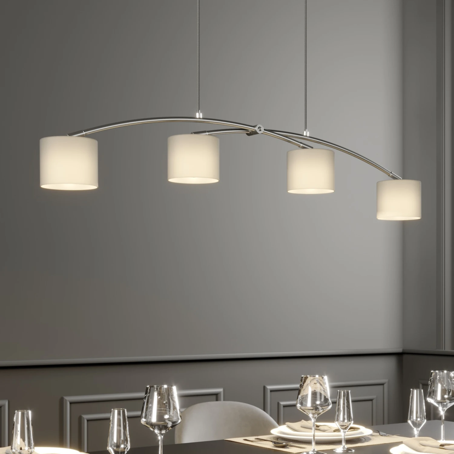 Vierflammige Esszimmer-Pendellampe Juljana mit weißen Glasschirmen und gebogenen Metallelementen