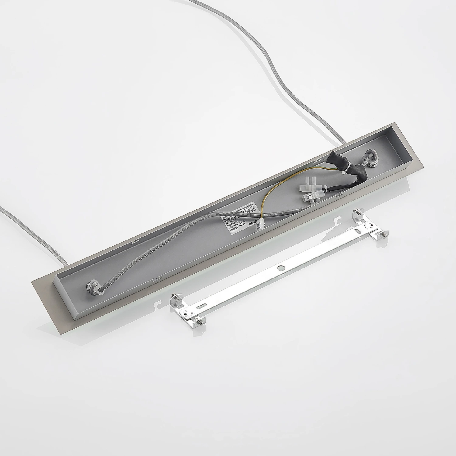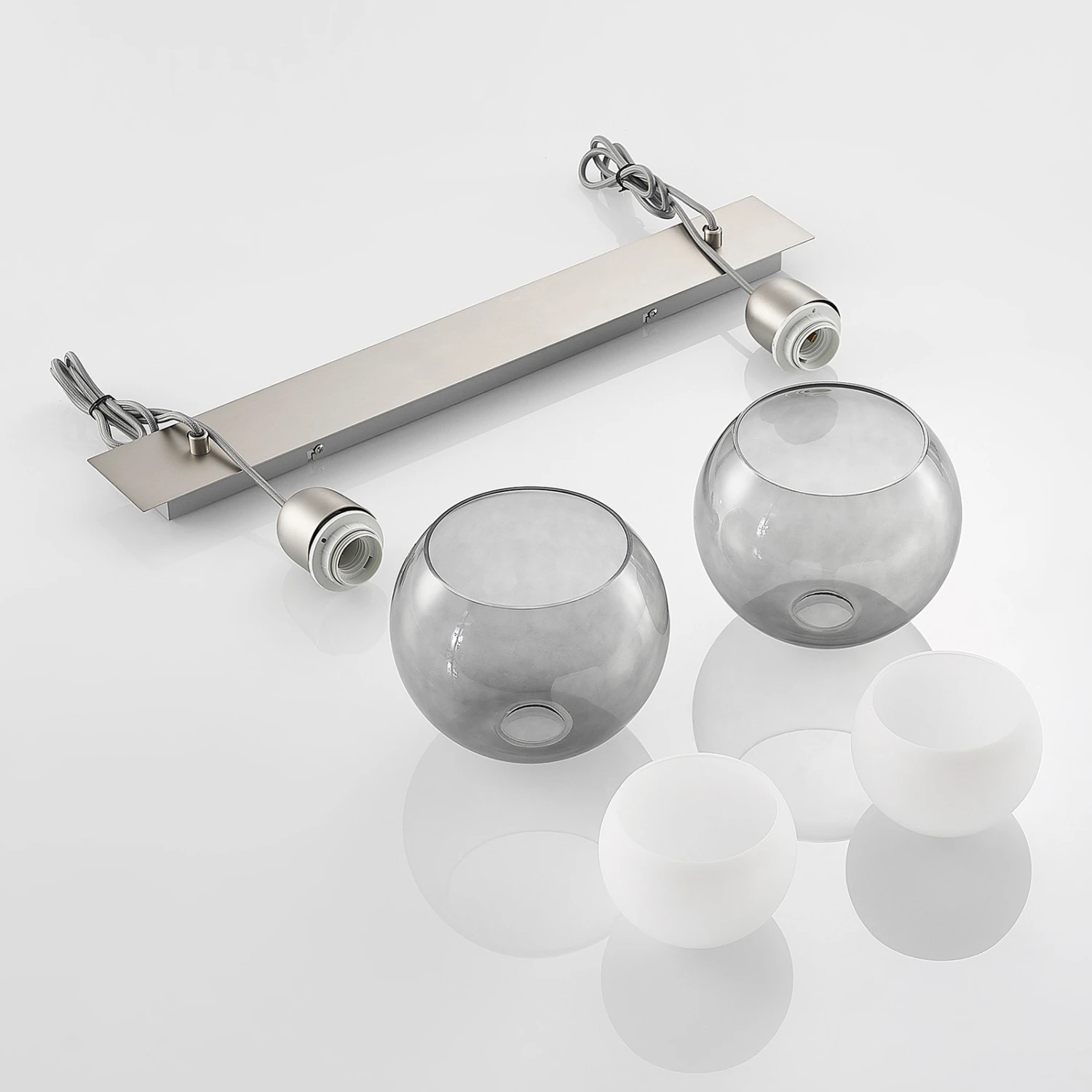 Die Hängelampe Kaiya besitzt zwei besondere Leuchtenschirme, die jeweils aus zwei Halbkugeln aus Glas bestehen. Farblich sind diese in einem attraktiven Farbkontrast aus Weiß und Rauchgrau gehalten. Sie können mit entsprechenden Leuchtmitteln bestückt werden, dessen Licht angenehm abgeblendet wird. Die Deckenhalterung der Leuchte besteht aus Eisen und ihre Oberfläche präsentiert sich in einem stimmige Nickel, was ihr ein modernes Finish verleiht. Die Hängeleuchte Kaiya findet ihren perfekten Platz in einem Wohnzimmer oder einem Esszimmer und setzt dezente Akzente innerhalb der Inneneinrichtung.
