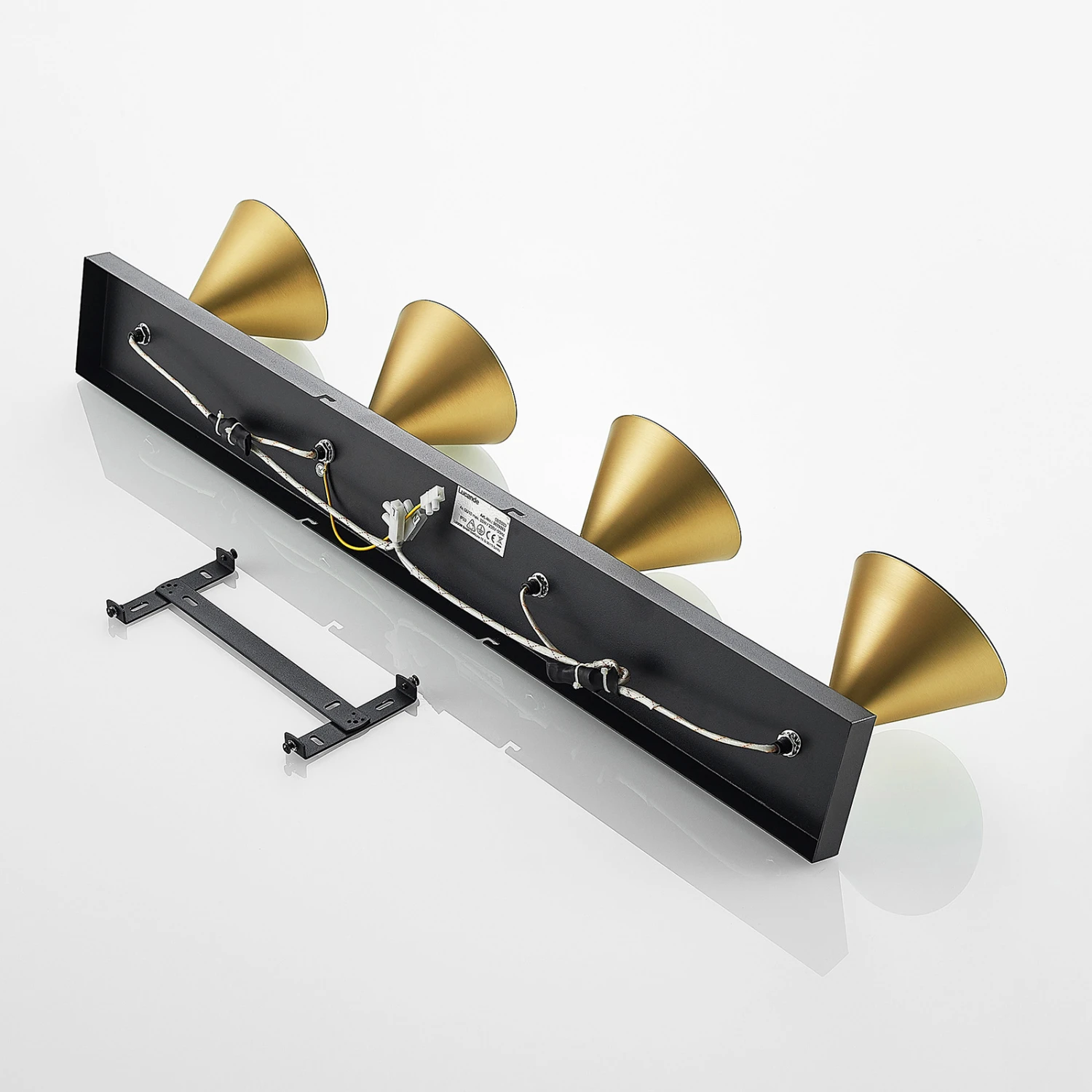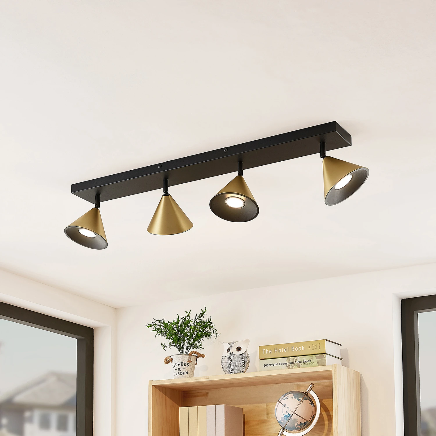 Die Deckenleuchte Kartio begeistert mit ihren vier Leuchtenschirmen, die sofort positiv ins Auge fallen. Befestigt an einer Montageplatte in Rechteckform, bilden die Schirme einen stilvollen Gegensatz mit ihrer konischen Bauform. Die Farbgebung fällt kontrastvoll, jedoch sehr harmonisch aus. Das mattschwarze Finish der Platte ergänzt die edle Messing-Oberfläche der Leuchtenschirme und verleiht der Leuchte einen definierten Charakter.