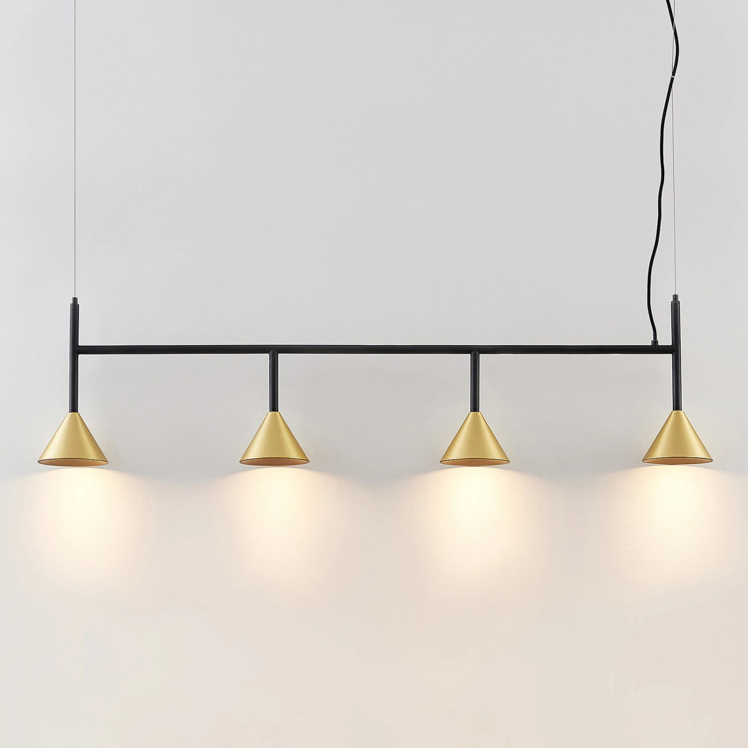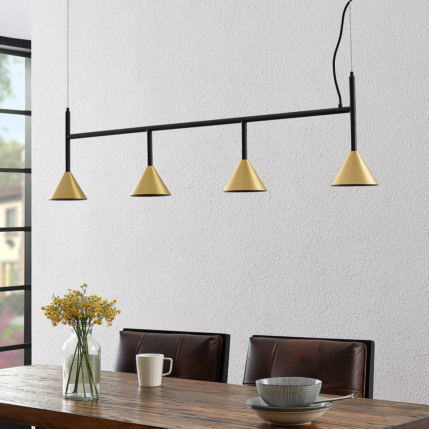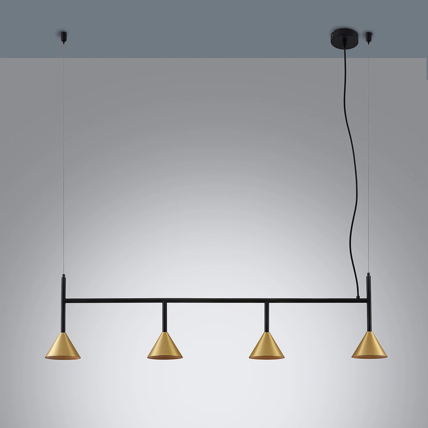 Die Leuchtenschirme wurden in einem edlen Messing-Finish verarbeitet, was ihnen ein gehobenes und elegantes Flair schenkt. Sie sind durch die geometrisch klare Form eines Kegels definiert und strahlen dank dieser das Licht gezielt sanft nach unten ab. Dadurch wird der Betrachter nicht geblendet und der Bereich unterhalb der Leuchte optimal ausgeleuchtet. Aus diesem Grund eignet sich diese schöne Leuchte besonders gut für den Einsatz über einem großen Esszimmertisch.