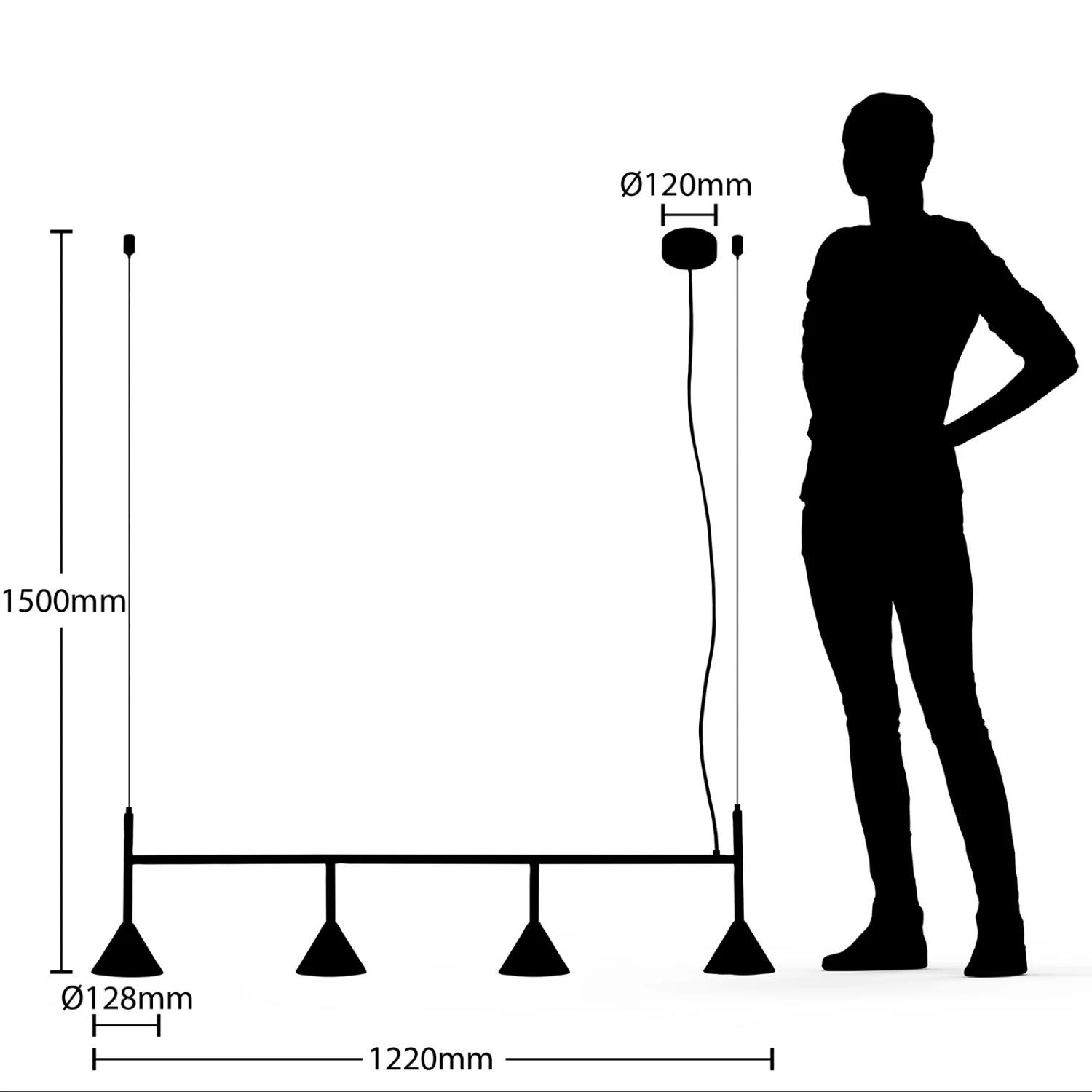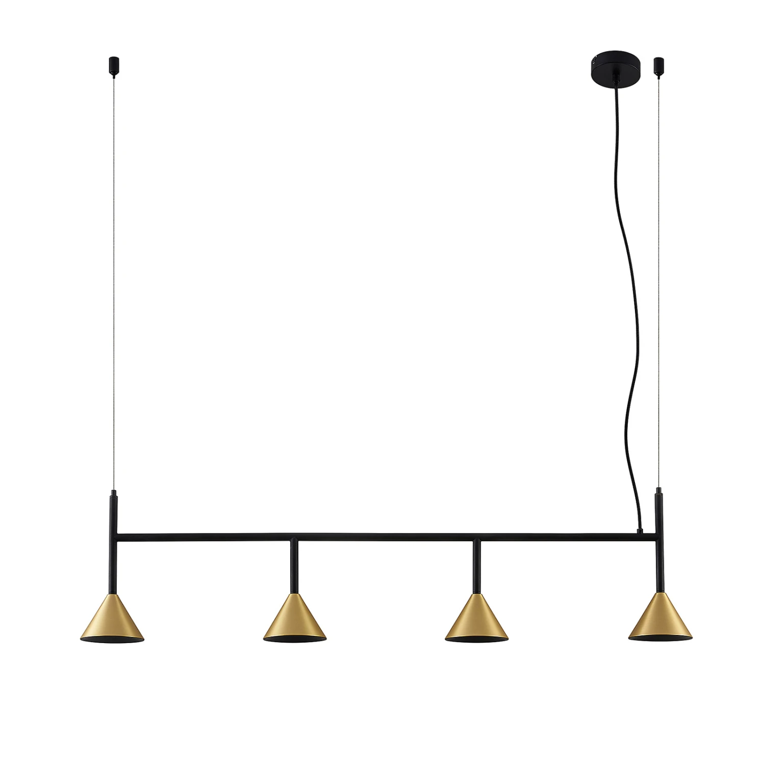 Edle Pendelleuchte Kartio mit vier Leuchtenschirmen in konischer Form und einer filigranen Stahlseilabhängung