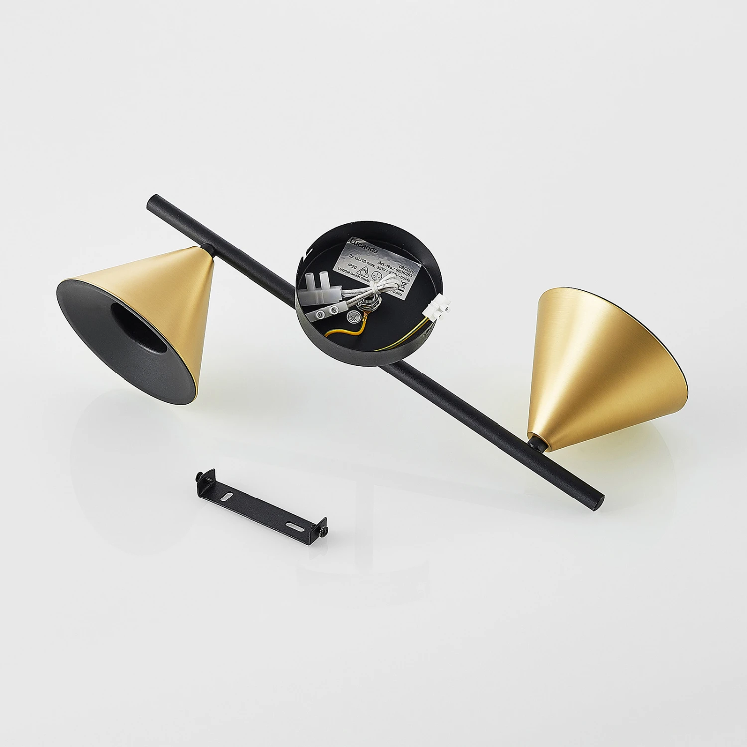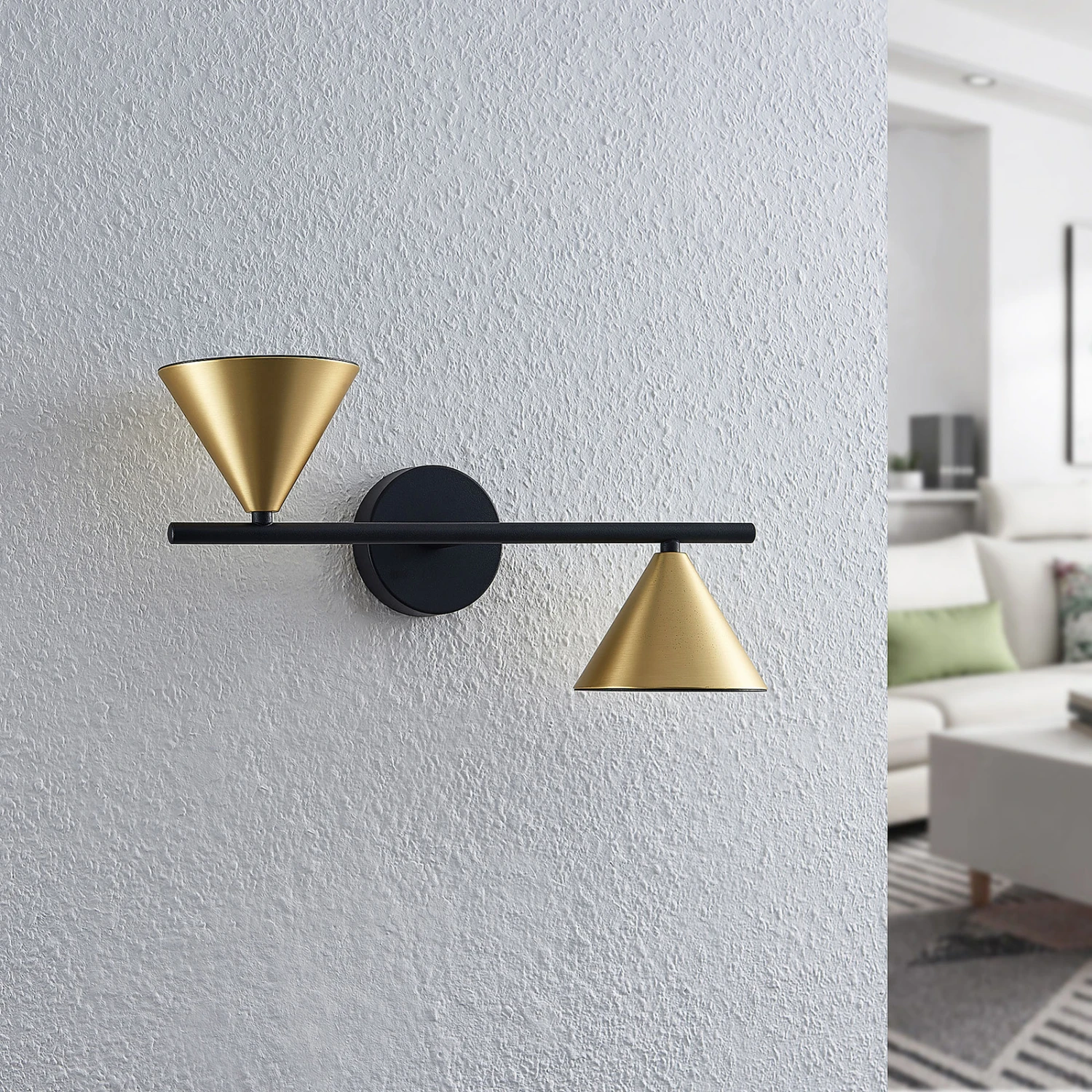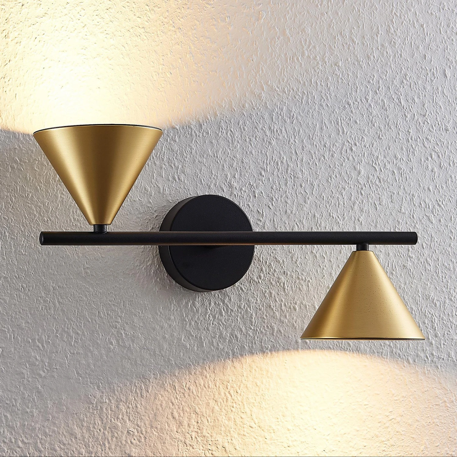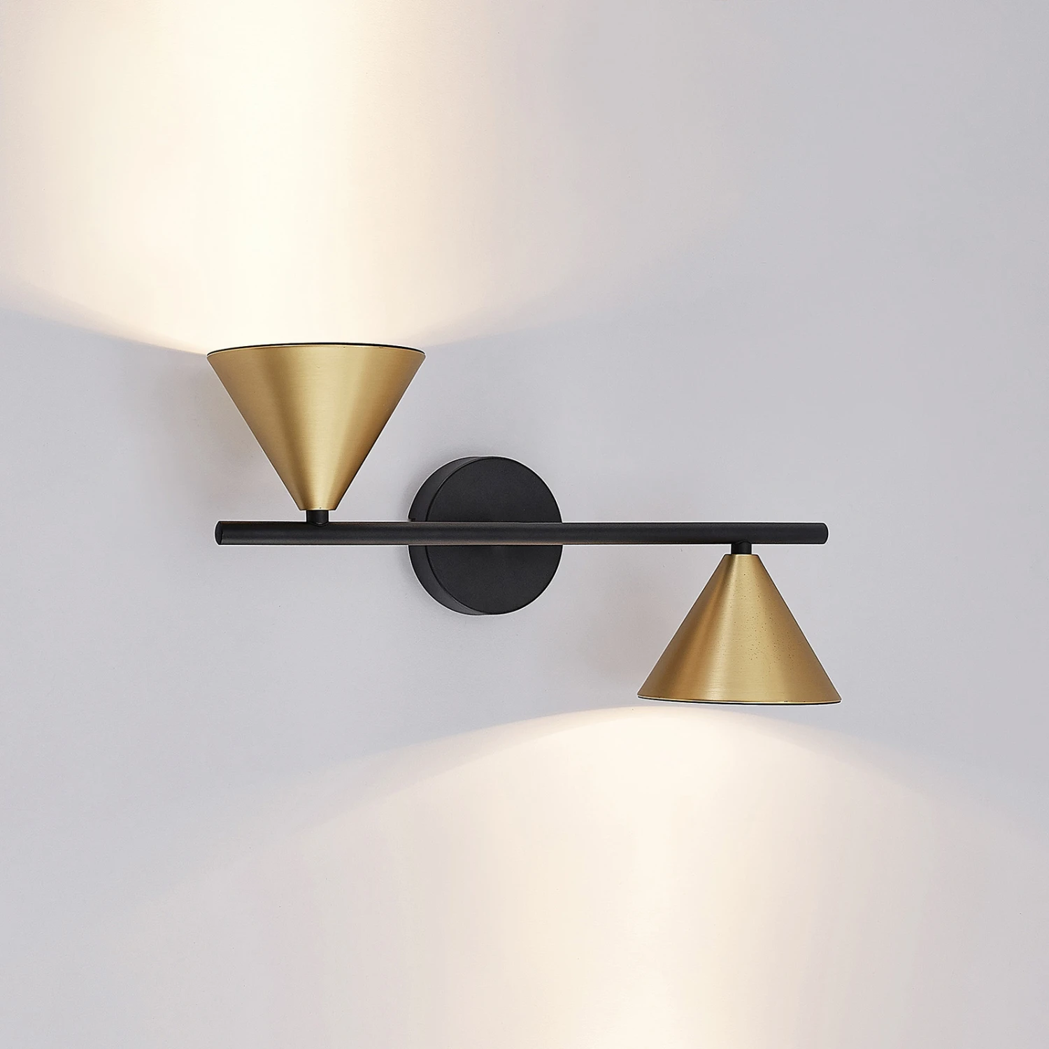 Das Gestell besteht aus einer runden Montageplatte, an der ein horizontaler Metallstab befestigt ist. An den Enden des Stabes sind die beiden Leuchtenschirme montiert. Die geometrische Form eines Kegels bewirkt, dass die Leuchtenschirme das Licht gezielt in eine Richtung abstrahlen, sodass die Leuchte sowohl nach oben als auch nach unten entlang der Wand stilvolle Lichtakzente setzen kann.