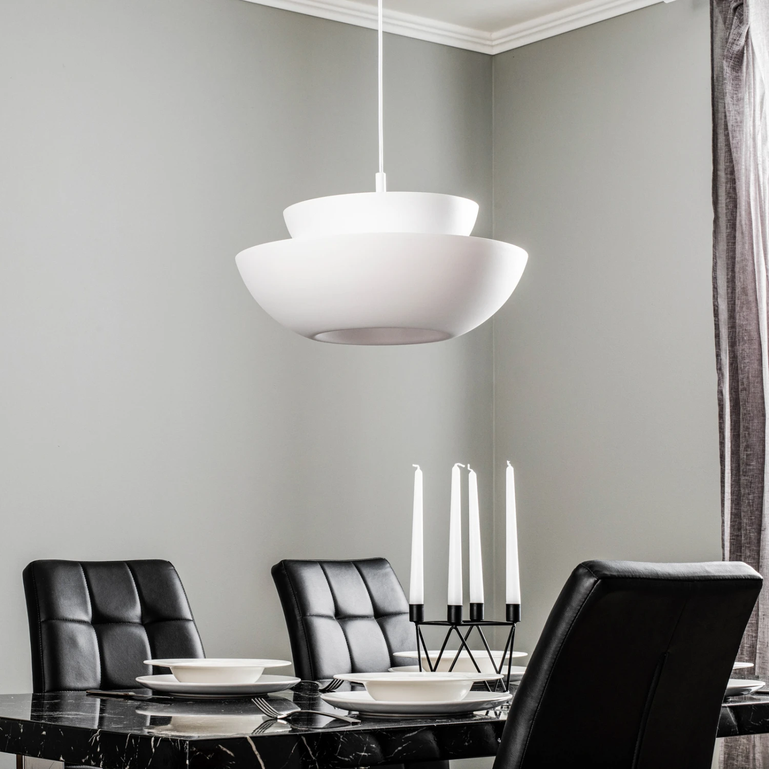 Kellina präsentiert sich als eine moderne Pendelleuchte, die dank ihrer besonderen Bauform sofort ins Auge fällt, ohne dabei das Mobiliar in ihrem Umfeld in den Schatten zu stellen. Sie besitzt eine filigrane Abhängung und eine runde Deckenhalterung, wobei das Hauptaugenmerk ihres Designs auf ihrem üppigen Doppelschirm liegt. Das Licht wird sowohl nach oben als auch nach unten abgestrahlt, wobei das Risiko der Blendung minimiert wird. Diese Leuchte kann nicht nur im privaten Bereich als Esszimmerbeleuchtung, sondern auch im gewerblichen Bereich, beispielsweise über einer Bartheke, optimal zur Geltung kommen.